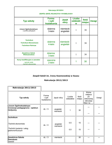 Rekrutacja 2013/2014 ZESPÓŁ SZKÓŁ ROLNICZYCH W KISIELICACH Typ szkoły Forma i cykl kształcenia Język obcy LIceum Ogólnokształcące o profilu policyjnym dzienna 3-letni niemiecki angielski 1 30 dzienna 4-letni niemiecki angielski 1 30 Technikum j - Technikum Ekonomiczne - Technikum Rolnicze Liczba Ilość oddziałó Uwagi miejsc w Zasadnicza Szkoła Wielozawodowa dzienna 3-letni 1 30 Kursy kwalifikacyjne w zawodzie: zaoczna 2-letni 1 30 - technik rolnik - technik ekonomista Zespół Szkół im. Ireny Kosmowskiej w Suszu Rekrutacja 2012/2013 Rekrutacja 2012/2013 Typ szkoły Liceum Ogólnokształcące innowacja pedagogiczna - opiekun medyczny Forma i cykl kształcenia dz. / 3 Język obcy angielski niemiecki Liczba oddziałów 1 Wolne miejsca Ilość po miejsc dokonanej rekrutacji Stan na ..... Uwagi --- --- --- --- 30 Technikum -Technik ekonomista dz. / 4 angielski niemiecki -Technik żywienia i usług gastronomicznych Zasadnicza Szkoła Zawodowa /zawód/ dz. / 3 niemiecki 0.5 15 --- --- 0.5 15 --- --- 30 --- --- -Kucharz 1 Zasadnicza Szkoła Zawodowa /wielozawodowa/ - stolarz - fryzjer - wędliniarz - piekarz - mechanik pojazdów samochodowych - elektryk - cukiernik - murarz-tynkarz - monter zabudowy i robót wykończeniowych w budownictwie - kamieniarz Liceum Ogólnokształcące dla dorosłych 1 dz. / 3 niemiecki z/3 niemiecki z/2 angielski zawodowy --- --- 30 --- --- 1 30 ---- wieczorowe 1 1 40 40 --- zaoczna 1 26 --- wieczorowy Szkoła Policealna -Technik administracji Technik informatyk Kurs kwalifikacyjny kucharz Rekrutacja 2013-2014 Zespół Szkół im. Bohaterów Września 1939 roku Typ szkoły Forma i cykl Język obcy kształcenia Liczba oddziałów Wolne miejsca po dokonanej Liczba rekrutacji miejsc Stan na … Liceum Ogólnokształcące Technikum - Technik ekonomista - Technik budownictwa - Technik drogownictwa - Technik informatyk Zasadnicza Szkoła Zawodowa /zawód/ - monter zabudowy i robót wykończeniowych w budownictwie dz./3 a, n, w dz./4 a, n dz./3 n 1 1 1 1 2 30 150 1 30 Uwagi Szkoła Policealna dla dorosłych - Technnik informatyk w./2 1 30 Legenda: dz./2 - cykl kształcenia 2-letni, nauczanie dzienne dz./3 - cykl kształcenia 3-letni, nauczanie dzienne dz./4 - cykl kształcenia 4-letni, nauczanie dzienne w./2 - cykl kształcenia 2-letni, nauczanie wieczorowe a - język angielski n - język niemiecki w - język włoski ZESPÓŁ SZKÓŁ W LUBAWIE Typ szkoły Forma i cykl Język kształcenia obcy Liczba oddziałów Liczba Wolne miejsca miejsc po dokonanej rekrutacji Stan na ..... Liceum Ogólnokształcące dz./3 profil: j.ang. j.niem. j.łac. 90 1 -matematyczno-fizyczny -biologiczno-chemiczny 1 -ogólny 1 Technikum -technik elektryk dz./3 j.ang. 1 j.niem. 0,5 -technik rolnik 90 1,5 -technik ekonomista Zasadnicza Szkoła Zawodowa j.ang. 3 90 Uwagi j.niem. /zawód/ -elektryk, stolarz, mechanik pojazdów samochodowych, cukiernik, fotograf, fryzjer, sprzedawca, kucharz małej gastronomii i inne zawody Zasadnicza Szkoła Zawodowa Specjalna /zawód/ dz./3 dz./3 j.rosyj. 1 16 j.ang. j.nie. 2 60 j. ang. 4 j. niem. 80 dz./3 -cukiernik Liceum Ogólnokształcące dla Dorosłych w/2 Kwalifikacyjne kursy zawodowe Technik ekonomista Technik handlowiec Technik elektryk Technik rolnik ZESPÓŁ SZKÓŁ OGÓLNOKSZTAŁCĄCYCH W IŁAWIE Przedmioty Klasa przygotowująca do studiów biologia, chemia biologiczno - chemiczna medycznych i przyrodniczych matematyka, fizyka matematyczno – fizyczna informatycznych i politechnicznych historia, wos humanistyczna humanistycznych i prawniczych historia, geografia europejska lingwistycznych i politologicznych matematyka, geografia matematyczno-geograficzna ekonomicznych i politechnicznych geografia, historia humanistyczno – geograficzna ekonomicznych i humanistycznych matematyka, geografia matematyczno - językowa informatycznych i politechnicznych