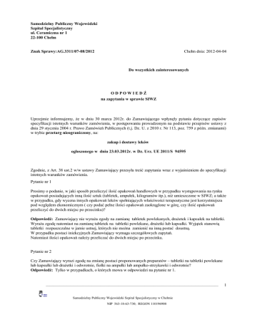 Samodzielny Publiczny Wojewódzki Szpital Specjalistyczny ul. Ceramiczna nr 1 22-100 Chełm Znak Sprawy:AG.3311/07-08/2012 Chełm dnia: 2012-04-04 Do wszystkich zainteresowanych O D POWIED Ź na zapytania w sprawie SIWZ Uprzejmie informujemy, że w dniu 30 marca 2012r. do Zamawiającego wpłynęły pytania dotyczące zapisów specyfikacji istotnych warunków zamówienia, w postępowaniu prowadzonym na podstawie przepisów ustawy z dnia 29 stycznia 2004 r. Prawo Zamówień Publicznych (t.j. Dz. U. z 2010 r. Nr 113, poz. 759 z późn. zmianami) w trybie przetarg nieograniczony, na: zakup i dostawy leków ogłoszonego w dniu 23.03.2012r. w Dz. Urz. UE 2011/S 94595 Zgodnie, z Art. 38 ust.2 w/w ustawy Zamawiający przesyła treść zapytania wraz z wyjaśnieniem do specyfikacji istotnych warunków zamówienia. Pytanie nr 1 Prosimy o podanie, w jaki sposób przeliczyć ilość opakowań handlowych w przypadku występowania na rynku opakowań posiadających inną ilość sztuk (tabletek, ampułek, kilogramów itp.), niż umieszczone w SIWZ; a także w przypadku, gdy wycena innych opakowań leków spełniających właściwości terapeutyczne jest korzystniejsza pod względem ekonomicznym ( czy podać pełne ilości opakowań zaokrąglone w górę, czy ilość opakowań przeliczyć do dwóch miejsc po przecinku)? Odpowiedź: Zamawiający nie wyraża zgody na zamianę tabletek powlekanych, drażetek i kapsułek na tabletki. Wyraża zgodę natomiast na zamianę tabletek na tabletki powlekane, drażetki lub kapsułki. Wyjątek stanowią tabletki rozpuszczalne w jamie ustnej, których nie można zamienić na inną postać doustną. W przypadku postaci iniekcyjnych Zamawiający wymaga szczegółowych zapytań. Natomiast ilości opakowań należy przeliczać do dwóch miejsc po przecinku. Pytanie nr 2 Czy Zamawiający wyrazi zgodę na zmianę postaci proponowanych preparatów – tabletki na tabletki powlekane lub kapsułki lub drażetki i odwrotnie, fiolki na ampułki lub ampułko-strzykawki i odwrotnie? Odpowiedź: Tylko w przypadkach, o których mowa w odpowiedzi na pytanie nr 1. __________________________________________________________________________________________________ Samodzielny Publiczny Wojewódzki Szpital Specjalistyczny w Chełmie NIP 563-18-63-730; REGON 110196908 1 Pytanie nr 3 Zwracamy się z prośbą o określenie w jaki sposób postąpić w przypadku zaprzestania lub braku produkcji danego preparatu. Czy zamawiający wyrazi zgodę na podanie ostatniej ceny i informacji pod pakietem? Odpowiedź: Do wyceny należy podać ostatnio stosowaną cenę z odnośnikiem pod formularzem do danej pozycji o zaprzestaniu lub wstrzymaniu produkcji. Pytanie nr 4 Czy można wycenić lek równoważny pod względem składu chemicznego i dawki lecz różniący się postacią (tabletki na tabletki powlekane lub kapsułki lub drażetki i odwrotnie fiolki na ampułki i odwrotnie) przy zachowaniu tej samej drogi podania? Odpowiedź: Tylko w przypadku leków doustnych zgodnie z odpowiedzią na pytanie numer 1. Pytanie nr 5 Czy w Pakiecie nr 14 poz. 481 (Sevofluranum 250ml – 80 butelek) zamawiający wymaga Sevoflurane do którego każda butelka jest fabrycznie wyposażona we wszystkie niezbędne elementy umożliwiające bezpieczne i bezpośrednie (tj. bez żadnych dodatkowych nakręcanych elementów)napełnianie parownika? taki system zapobiega stratom leku podczas napełniania parowników. Odpowiedź: Tak Zamawiający wymaga. Dyrektor Samodzielnego Publicznego Wojewódzkiego Szpitala Specjalistycznego w Chełmie mgr inż. Robert Lis (podpis nieczytelny) __________________________________________________________________________________________________ Samodzielny Publiczny Wojewódzki Szpital Specjalistyczny w Chełmie NIP 563-18-63-730; REGON 110196908 2