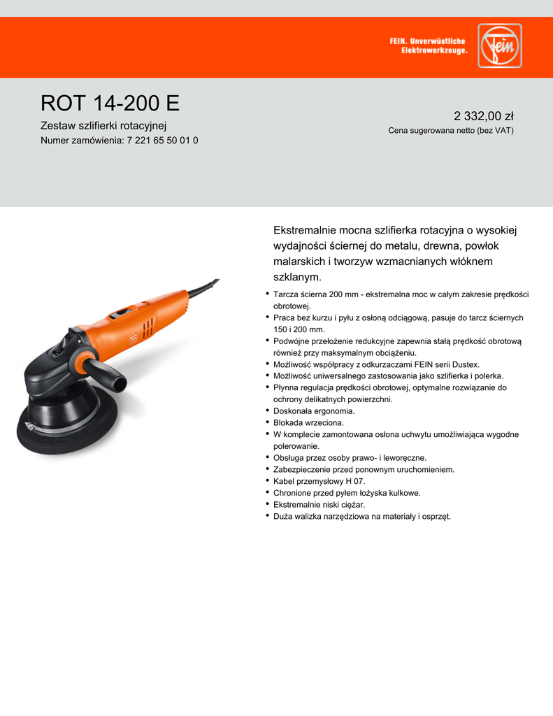 ROT 14-200 E Zestaw szlifierki rotacyjnej 2 332,00 zł Cena sugerowana netto (bez VAT) Numer zamówienia: 7 221 65 50 01 0 Ekstremalnie mocna szlifierka rotacyjna o wysokiej wydajności ściernej do metalu, drewna, powłok malarskich i tworzyw wzmacnianych włóknem szklanym. Tarcza ścierna 200 mm - ekstremalna moc w całym zakresie prędkości obrotowej. Praca bez kurzu i pyłu z osłoną odciągową, pasuje do tarcz ściernych 150 i 200 mm. Podwójne przełożenie redukcyjne zapewnia stałą prędkość obrotową również przy maksymalnym obciążeniu. Możliwość współpracy z odkurzaczami FEIN serii Dustex. Możliwość uniwersalnego zastosowania jako szlifierka i polerka. Płynna regulacja prędkości obrotowej, optymalne rozwiązanie do ochrony delikatnych powierzchni. Doskonała ergonomia. Blokada wrzeciona. W komplecie zamontowana osłona uchwytu umożliwiająca wygodne polerowanie. Obsługa przez osoby prawo- i leworęczne. Zabezpieczenie przed ponownym uruchomieniem. Kabel przemysłowy H 07. Chronione przed pyłem łożyska kulkowe. Ekstremalnie niski ciężar. Duża walizka narzędziowa na materiały i osprzęt. ROT 14-200 E Zestaw szlifierki rotacyjnej Numer zamówienia: 7 221 65 50 01 0 Dane techniczne Pobór mocy Moc użytkowa Prędkość obrotowa biegu jałowego Cena obejmuje: 1 200 W 750 W 900-2 500 obr/min Kabel z wtyczką 4m Ciężar wg EPTA 2,6 kg Narzędzia do polerowania Ø Gwint mocujący Przyłącze przewodu odsysającego Ø Talerz szlifierski Ø Sieciowe 150/200 mm M 14 38 mm 150/200 mm X 1 polerka kątowa FEIN WPO 14-25 E w walizce z tworzywa sztucznego 1 kołpak odsysający 1 tarcza ścierna, twarda, Ø 200 mm 1 uchwyt antywibracyjny