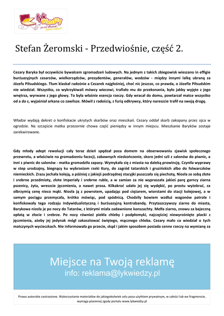 Stefan Żeromski - Przedwiośnie, część 2. Cezary Baryka był oczywiście bywalcem zgromadzeo ludowych. Na jednym z takich zbiegowisk wieszano in effigie burżuazyjnych cesarzów, wielkorządców, prezydentów, generałów, wodzów - między innymi lalkę ubraną za Józefa Piłsudskiego. Tłum klaskał radośnie a Cezarek najgłośniej, chod nic jeszcze, co prawda, o Józefie Piłsudskim nie wiedział. Wszystko, co wykrzykiwali mówcy wiecowi, trafiało mu do przekonania, było jakby wyjęte z jego wnętrza, wyrwane z jego głowy. To była właśnie esencja rzeczy. Gdy wracał do domu, powtarzał matce wszystko od a do z, wyjaśniał arkana co zawilsze. Mówił z radością, z furią odkrywcy, który nareszcie trafił na swoją drogę. Władze wydają dekret o konfiskacie ukrytych skarbów oraz mieszkao. Cezary oddał skarb zakopany przez ojca w ogrodzie. Na szczęście matka przezornie chowa częśd pieniędzy w innym miejscu. Mieszkanie Baryków zostaje zarekwirowane. Gdy młody adept rewolucji cały teraz dzieo spędzał poza domem na obserwowaniu zjawisk społecznego przewrotu, a właściwie na gromadzeniu facecji, zabawnych nieskooczenie, skoro jedni szli z salonów do piwnic, a inni z piwnic do salonów - matka gromadziła zapasy. Wymykała się z miasta na daleką prowincję. Czyniła wyprawy w step urodzajny, biegnący ku wybrzeżom rzeki Kury, do zagród tatarskich i gruzioskich albo do folwarczków niemieckich. Zrazu jechała koleją, a później z jakiejś podrzędnej stacyjki puszczała się piechotą. Niosła ze sobą złote i srebrne przedmioty, złote imperiały i srebrne ruble, a w zamian za nie wypraszała jakieś parę garncy ziarna pszenicy, żyta, wreszcie jęczmienia, a nawet prosa. Kilkakrod udało jej się wydębid, po prostu wyżebrad, za olbrzymią cenę nieco mąki. Niosła ją z powrotem, upadając pod ciężarem, wiorstami do stacji kolejowej, a w samym pociągu przemycała, krótko mówiąc, pod spódnicą. Chodziły bowiem wzdłuż wagonów patrole i konfiskowały tego rodzaju indywidualistyczną i burżuazyjną kontrabandę. Przytaszczywszy ziarno do miasta, Barykowa niosła je po nocy do Tatarów, z którymi miała zadawnione konszachty. Mełła ziarno, znowu za bajeczną opłatą w złocie i srebrze. Po nocy również piekła chleby i podpłomyki, najczęściej niewyrośnięte placki z jęczmienia, ażeby jej jedynak mógł zakosztowad świętego, mącznego chleba. Cezary mało co wiedział o tych matczynych wycieczkach. Nie informowała go przecie, skąd i jakim sposobem posiada cenne rzeczy na wymianę za Prawa autorskie zastrzeżone. Wykorzystanie materiałów do jakiegokolwiek celu poza użytkiem prywatnym, w całości lub we fragmencie, wymaga pisemnej zgody portalu www.lykwiedzy.pl zboże i mąkę. Wiedziała, że w świętej głupocie swojej wydałby w te pędy i tamten skarb z groty. Prawiła mu tedy, iż ten Tatar albo tamten Ormiaszka daje jej po starej znajomości parę garści żytniej mąki. Wyśledził wreszcie sekret matczyny, najstaranniej chowany: wyprawy za miasto po zboże. Wtedy ogarnął go żal stusieczny. Cezary płakał głucho, myśląc o tym, jak biegła obcymi polami, ciągnąc i niosąc dla niego zboże, jak się od rowu do rowu słaniała na zwątlałych nogach, jak chwytała powietrze, którego płuca coraz więcej potrzebowały. Począł w nocy czatowad na jej bezsennośd. Wstawał, okrywał ją, małą i chudą pod kołdrą, jakby jej wcale nie było utulał, uspakajał, uciszał. Zdarzało się, iż zasypiała słodko uśmiechnięta, z radosnym w sercu weselem od jego łaskawych słów i nieznacznych pogłaskao. W tym czasie oboje jakoś przytulili się do siebie moralnie i wsparli ramionami ducha. Cezary spostrzegł, iż matka, która "nic nie mogła skapowad, najprostszych rzeczy nie rozumiała" - nie była przecież tak ograniczona, jak mu się z pierwszego wydawało. Pewne wyniki przewidywała nieomylnie jasno, niektóre zjawiska oceniła z matematyczną dokładnością. Tu brzmią takie oto hasła, wdraża się w życie takie oto żelazne dyrektywy, takie padają wzniosłe i wspaniałe nakazy - a ona widzi w skutku coś bezwzględnie odwrotnego, coś śmiesznie i diametralnie przeciwnego. I oto, wbrew logice rzeczy, wbrew sile i kierunkowi impulsu - według jej mrukliwej, półgębkiem wyrażonej wątpliwości sprawy poszły. Zastanawiała Cezarego ta przypadkowa zbieżnośd, lecz nie zdołała go zepchnąd z drogi obranej. Gdy od strony Astrachania przychodził statek pasażerski, o czym matka zawsze z góry wiedziała, obydwoje chodzili do portu i wyczekiwali - nie wiedzied na co. Właściwie nawet wiedzieli na co, lecz nigdy o tym nie mówili. Nie chcieli przyznad się przed sobą i bali się, żeby nie spłoszyd szczęścia. Czekali na ojca. Teraz już Cezary nie lękał się jego powrotu, gdy było za późno. Stracił już wszelką nadzieję, odkąd mu powiedziano w urzędzie, że ojciec zginął na wojnie. Nie wyjawiał tego matce, gdyż nie był w stanie wymierzyd jej tego ciosu w strudzone serce. Zresztą wątpił. Ileż to razy powracali ci, których za zabitych ogłoszono! W porcie matka Czarka spotyka księżną i księżniczki Szczerbatow-Mamajew. Oczywiście pozbawione majątku. Nawet więzione (w koocu to rewolucja). To spotkanie nie wróży nic dobrego. Matka Cezarego zaprasza księżniczki do siebie. Księżna zwierza się w nocy pani Jadwidze, że ma wokół nóg ukryte cenne bransolety, które ciągle ją ranią. W nocy do mieszkania wchodzą rewolucjoniści. Arystokratki trafiają do wiezienia, Barykową skazano na ciężkie roboty. Kobieta umiera. Prawa autorskie zastrzeżone. Wykorzystanie materiałów do jakiegokolwiek celu poza użytkiem prywatnym, w całości lub we fragmencie, wymaga pisemnej zgody portalu www.lykwiedzy.pl Na nic zabiegi syna. Udaje mu się jednak pochowad matkę w pojedynczej mogile (Jadwiga miała trafid do wspólnego grobu dla rewolucjonistów). Inną koleją potoczył