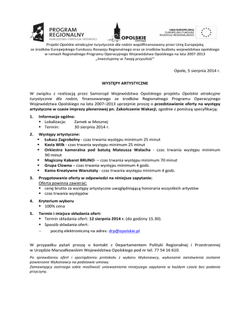 Projekt Opolskie atrakcyjne turystycznie dla rodzin współfinansowany przez Unię Europejską ze środków Europejskiego Funduszu Rozwoju Regionalnego oraz ze środków budżetu województwa opolskiego w ramach Regionalnego Programu Operacyjnego Województwa Opolskiego na lata 2007-2013 „Inwestujemy w Twoją przyszłość” Opole, 5 sierpnia 2014 r. WYSTĘPY ARTYSTYCZNE W związku z realizacją przez Samorząd Województwa Opolskiego projektu Opolskie atrakcyjne turystycznie dla rodzin, finansowanego ze środków Regionalnego Programu Operacyjnego Województwa Opolskiego na lata 2007–2013 uprzejmie proszę o przedstawienie oferty na występy artystyczne w czasie imprezy plenerowej pn. Zakończenie Wakacji, zgodnie z poniższą specyfikacją: 1. 2. Informacje ogólne: Lokalizacja: Zamek w Mosznej Termin: 30 sierpnia 2014 r. Występy artystyczne: Łukasz Zagrobelny - czas trwania występu minimum 25 minut Kasia Wilk - czas trwania występu minimum 25 minut Orkiestra kameralna pod batutą Mateusza Walacha - czas trwania występu minimum 90 minut Magiczny Kabaret BRUNO- – czas trwania występu minimum 70 minut Grupa Clowna – czas trwania występu minimum 4 godz. Kamo Kreatywne Warsztaty - czas trwania występu minimum 4 godz. 3. Przygotowanie oferty w odpowiedzi na niniejsze zapytanie: Oferta powinna zawierać: cenę brutto za występy artystyczne uwzględniającą honoraria wszystkich artystów czas trwania występów 4. Kryterium wyboru 100% cena 5. Termin i miejsce składania ofert: Termin składania ofert: 12 sierpnia 2014 r. (do godziny 15.30). Sposób składania ofert: − pocztą elektroniczną na adres: [email protected] W przypadku pytań proszę o kontakt z Departamentem Polityki Regionalnej i Przestrzennej w Urzędzie Marszałkowskim Województwa Opolskiego pod nr tel. 77 54 16 610. Po sprawdzeniu ofert i sporządzeniu protokołu z wyboru Wykonawcy, wykonanie zamówienia zostanie powierzone Wykonawcy na podstawie umowy. Zamawiający zastrzega sobie możliwość unieważnienia niniejszego zapytania w każdym czasie bez podania przyczyny.