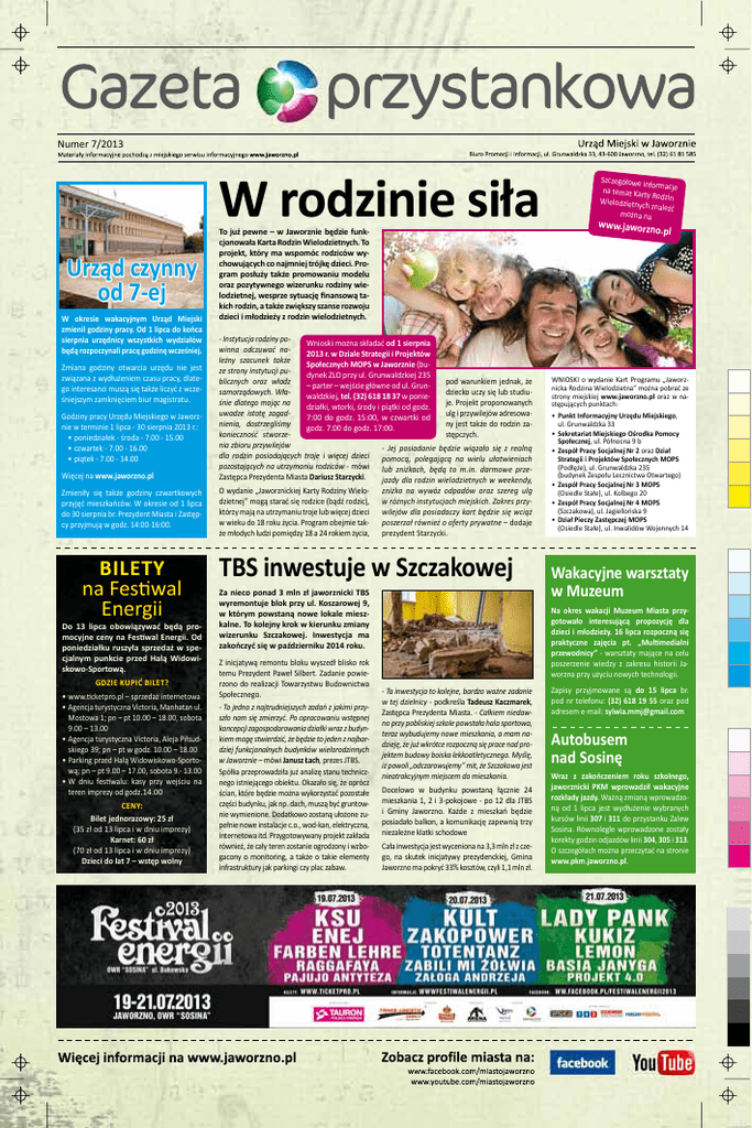 Numer 7/2013 W rodzinie siła Urząd czynny od 7-ej W okresie wakacyjnym Urząd Miejski zmienil godziny pracy. Od 1 lipca do końca sierpnia urzędnicy wszystkich wydziałów będą rozpoczynali pracę godzinę wcześniej. Zmiana godziny otwarcia urzędu nie jest związana z wydłużeniem czasu pracy, dlatego interesanci muszą się także liczyć z wcześniejszym zamknięciem biur magistratu. Godziny pracy Urzędu Miejskiego w Jaworznie w terminie 1 lipca - 30 sierpnia 2013 r.: •• poniedziałek - środa - 7.00 - 15.00 •• czwartek - 7.00 - 16.00 •• piątek - 7.00 - 14.00 Więcej na www.jaworzno.pl Zmieniły się także godziny czwartkowych przyjęć mieszkańców. W okresie od 1 lipca do 30 sierpnia br. Prezydent Miasta i Zastępcy przyjmują w godz. 14:00-16:00. Bilety na Festiwal Energii Do 13 lipca obowiązywać będą promocyjne ceny na Festiwal Energii. Od poniedziałku ruszyła sprzedaż w specjalnym punkcie przed Halą Widowiskowo-Sportową. Gdzie kupić bilet? •• www.ticketpro.pl – sprzedaż internetowa •• Agencja turystyczna Victoria, Manhatan ul. Mostowa 1; pn – pt 10.00 – 18.00, sobota 9.00 – 13.00 •• Agencja turystyczna Victoria, Aleja Piłsudskiego 39; pn – pt w godz. 10.00 – 18.00 •• Parking przed Halą Widowiskowo-Sportową; pn – pt 9.00 – 17.00, sobota 9.- 13.00 •• W dniu festiwalu: kasy przy wejściu na teren imprezy od godz.14.00 Ceny: Bilet jednorazowy: 25 zł (35 zł od 13 lipca i w dniu imprezy) Karnet: 60 zł (70 zł od 13 lipca i w dniu imprezy) Dzieci do lat 7 – wstęp wolny To już pewne – w Jaworznie będzie funkcjonowała Karta Rodzin Wielodzietnych. To projekt, który ma wspomóc rodziców wychowujących co najmniej trójkę dzieci. Program posłuży także promowaniu modelu oraz pozytywnego wizerunku rodziny wielodzietnej, wesprze sytuację finansową takich rodzin, a także zwiększy szanse rozwoju dzieci i młodzieży z rodzin wielodzietnych. - Instytucja rodziny poWnioski można składać od 1 sierpnia winna odczuwać na2013 r. w Dziale Strategii i Projektów leżny szacunek także Społecznych MOPS w Jaworznie (buze strony instytucji pudynek ZLO przy ul. Grunwaldzkiej 235 blicznych oraz władz pod warunkiem jednak, że – parter – wejście główne od ul. Grunsamorządowych. Władziecko uczy się lub studiuwaldzkiej, tel. (32) 618 18 37 w ponieśnie dlatego mając na je. Projekt proponowanych działki, wtorki, środy i piątki od godz. uwadze istotę zagadulg i przywilejów adresowa7:00 do godz. 15:00, w czwartki od nienia, dostrzegliśmy ny jest także do rodzin zagodz. 7:00 do godz. 17:00. konieczność stworzestępczych. nia zbioru przywilejów - Jej posiadanie będzie wiązało się z realną dla rodzin posiadających troje i więcej dzieci pomocą, polegającą na wielu ułatwieniach pozostających na utrzymaniu rodziców - mówi lub zniżkach, będą to m.in. darmowe przeZastępca Prezydenta Miasta Dariusz Starzycki. jazdy dla rodzin wielodzietnych w weekendy, O wydanie „Jaworznickiej Karty Rodziny Wielodzietnej” mogą starać się rodzice (bądź rodzic), którzy mają na utrzymaniu troje lub więcej dzieci w wieku do 18 roku życia. Program obejmie także młodych ludzi pomiędzy 18 a 24 rokiem życia, zniżka na wywóz odpadów oraz szereg ulg w różnych instytucjach miejskich. Zakres przywilejów dla posiadaczy kart będzie się wciąż poszerzał również o oferty prywatne – dodaje prezydent Starzycki. TBS inwestuje w Szczakowej Za nieco ponad 3 mln zł jaworznicki TBS wyremontuje blok przy ul. Koszarowej 9, w którym powstaną nowe lokale mieszkalne. To kolejny krok w kierunku zmiany wizerunku Szczakowej. Inwestycja ma zakończyć się w październiku 2014 roku. Z inicjatywą remontu bloku wyszedł blisko rok temu Prezydent Paweł Silbert. Zadanie powierzono do realizacji Towarzystwu Budownictwa Społecznego. - To jedno z najtrudniejszych zadań z jakimi przyszło nam się zmierzyć. Po opracowaniu wstępnej koncepcji zagospodarowania działki wraz z budynkiem mogę stwierdzić, że będzie to jeden z najbardziej funkcjonalnych budynków wielorodzinnych w Jaworznie – mówi Janusz Łach, prezes JTBS. Spółka przeprowadziła już analizę stanu technicznego istniejącego obiektu. Okazało się, że oprócz ścian, które będzie można wykorzystać pozostałe części budynku, jak np. dach, muszą być gruntownie wymienione. Dodatkowo zostaną ułożone zupełnie nowe instalacje c.o., wod-kan, elektryczna, internetowa itd. Przygotowywany projekt zakłada również, że cały teren zostanie ogrodzony i wzbogacony o monitoring, a także o takie elementy infrastruktury jak parkingi czy plac zabaw. Szczegółowe informacje na temat Karty Rodzin Wielodzietnych znaleźć można na www.jaworzno .pl WNIOSKI o wydanie Kart Programu „Jaworznicka Rodzina Wielodzietna” można pobrać ze strony miejskiej www.jaworzno.pl oraz w następujących punktach: •• Punkt Informacyjny Urzędu Miejskiego, ul. Grunwaldzka 33 •• Sekretariat Miejskiego Ośrodka Pomocy Społecznej, ul. Północna 9 b •• Zespół Pracy Socjalnej Nr 2 oraz Dział Strategii i Projektów Społecznych MOPS (Podłęże), ul. Grunwaldzka 235 (budynek Zespołu Lecznictwa Otwartego) •• Zespół Pracy Socjalnej Nr 3 MOPS (Osiedle Stałe), ul. Kolbego 20 •• Zespół Pracy Socjalnej Nr 4 MOPS (Szczakowa), ul. Jagiellońska 9 •• Dział Pieczy Zastępczej MOPS (Osiedle Stałe), ul. Inwalidów Wojennych 14 Wakacyjne warsztaty w Muzeum Na okres wakacji Muzeum Miasta przygotowało interesującą propozycję dla dzieci i młodzieży. 16 lipca rozpoczną się praktyczne zajęcia pt. „Multimedialni przewodnicy” - warsztaty mające na celu poszerzenie wiedzy z zakresu historii Jaworzna przy użyciu nowych technologii. - Ta inwestycja to kolejne, bardzo ważne zadanie w tej dzielnicy - podkreśla Tadeusz Kaczmarek, Zastępca Prezydenta Miasta. - Całkiem niedawno przy pobliskiej szkole powstała hala sportowa, teraz