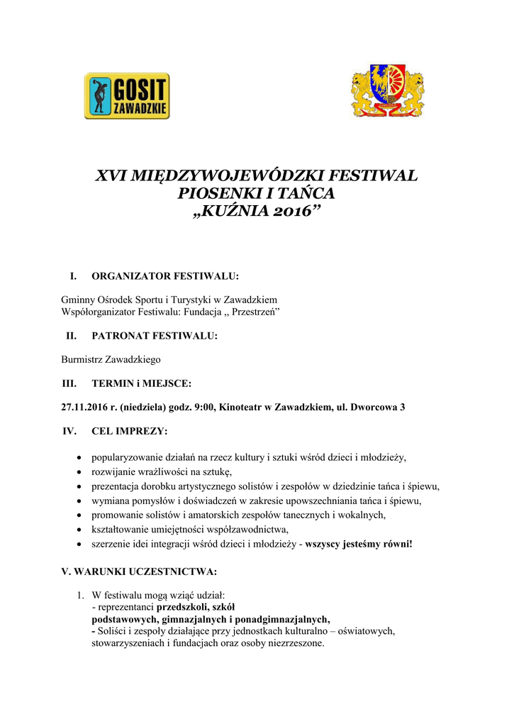 XVI MIĘDZYWOJEWÓDZKI FESTIWAL PIOSENKI I TAŃCA „KUŹNIA 2016’’ I. ORGANIZATOR FESTIWALU: Gminny Ośrodek Sportu i Turystyki w Zawadzkiem Współorganizator Festiwalu: Fundacja ,, Przestrzeń” II. PATRONAT FESTIWALU: Burmistrz Zawadzkiego III. TERMIN i MIEJSCE: 27.11.2016 r. (niedziela) godz. 9:00, Kinoteatr w Zawadzkiem, ul. Dworcowa 3 IV. CEL IMPREZY: popularyzowanie działań na rzecz kultury i sztuki wśród dzieci i młodzieży, rozwijanie wrażliwości na sztukę, prezentacja dorobku artystycznego solistów i zespołów w dziedzinie tańca i śpiewu, wymiana pomysłów i doświadczeń w zakresie upowszechniania tańca i śpiewu, promowanie solistów i amatorskich zespołów tanecznych i wokalnych, kształtowanie umiejętności współzawodnictwa, szerzenie idei integracji wśród dzieci i młodzieży - wszyscy jesteśmy równi! V. WARUNKI UCZESTNICTWA: 1. W festiwalu mogą wziąć udział: - reprezentanci przedszkoli, szkół podstawowych, gimnazjalnych i ponadgimnazjalnych, - Soliści i zespoły działające przy jednostkach kulturalno – oświatowych, stowarzyszeniach i fundacjach oraz osoby niezrzeszone. 2. Kwalifikacja solistów i zespołów następuje po przesłaniu Karty Zgłoszeniowej Festiwalu „KUŹNIA 2016” za pomocą poczty elektronicznej na adres: - [email protected] lub listownie na adres: Gminny Ośrodek Sportu i Turystyki, 47-120 Zawadzkie, ul. Opolska 23 VI. PATRONAT MEDIALNY Krajobrazy Zawadzkiego Strzelec Opolski TV zawadzkie VII.KOMITET ORGANIZACYJNY: Monika Skibińska – tel.: 663 576 476 Małgorzata Rabicka – tel.: 535 447 453 REGULAMIN FESTIWALU 1. Dzieci i młodzież zgłaszane są w odpowiednich dla siebie grupach wiekowych w kategoriach: a) taniec - zespół - duet - solo b) śpiew - zespół - duet - solo 2. Zgłaszającym winna być instytucja kultury, placówka szkolna, placówka przedszkolna, stowarzyszenie/fundacja lub osoba prywatna. 3. Koszty dojazdu oraz wpisowego w kwocie 5 zł/os. ponoszą organy delegujące (w ramach wpisowego Organizator zapewnia ciepły posiłek). 4. Wpisowe pobierane będzie przed rozpoczęciem imprezy w dniu festiwalu. 5. Uczestnicy powinni nadesłać zgłoszenie do dnia 14.11.2016 r. na adres e-mail: [email protected], [email protected] lub Gminny Ośrodek Sportu i Turystyki 47-120 Zawadzkie, ul. Opolska 23 Po tym terminie zgłoszenia nie będą brane pod uwagę. 6. W przypadku dużej ilości chętnych w placówkach macierzystych proponowane są wstępne eliminacje. 7. Ogłoszenie wyników oraz koncert laureatów nastąpi w galowej części Festiwalu godzina zakończenia zależy od ilości zgłoszeń. 8. Brak uczestnictwa wykonawcy w koncercie galowym pozbawia ewentualnej nagrody. 9. Wszelkie sprawy nie ujęte w regulaminie rozstrzyga Organizator. GŁÓWNE ZASADY KONKURSOWE I. KONKURENCJE TANECZNE: 1. Wykonawcy prezentują jeden układ w wybranej przez siebie kategorii tanecznej: widowisko taneczne – oparte na różnych technikach tanecznych (układ do 5 minut) miniatura taneczna – oparta na technikach tańca nowoczesnego (układ do 4 minut) Inne formy taneczne: technika tańca współczesnego, jazzowego, towarzyskiego (układ do 3 min.) taniec ludowy- (układ do 3 min.) taniec mażoretkowy – (układ do 2 min.) 2. Przekroczenie regulaminowego czasu występu, określonego przy każdej z kategorii powoduje utratę punktu. 3. Repertuar i choreografia musi być dostosowana do wieku i możliwości wykonawców. II. KONKURENCJE WOKALNE: 1. Uczestnik (solista lub zespół) prezentuje jeden utwór, którego czas nie przekracza 3 minut. 2. W zakresie akompaniamentu wykonawca korzysta z własnego nagrania muzycznego w systemie uzgodnionym z Organizatorem. 3. Istnieje możliwość odtworzenia akompaniamentu za pośrednictwem odtwarzaczy: CD Audio, MP3 lub USB-PenDrive, po wcześniejszym zgłoszeniu i uzgodnieniu z organizatorem. 4. Wykonawcy towarzyszyć może akompaniator lub zespół akompaniujący (organizator nie zapewnia instrumentów muzycznych oraz pozostałych elementów nagłośnienia scenicznego (poza mikrofonami i okablowaniem doprowadzającym dźwięk do realizatora dźwięku). 5. Repertuar prezentowany podczas występu musi być zgodny ze zgłoszeniem. Ewentualne, uzasadnione zmiany należy niezwłocznie zgłosić organizatorowi. 6. Repertuar wokalny musi być dostosowany do wieku uczestnika. Niecenzurowane słowa i gesty skutkują dyskwalifikacją. III. POSTANOWIENIA KOŃCOWE 1. Prezentacje konkursowe oceniać będą Jury, którego skład podany zostanie bezpośrednio przed rozpoczęciem Festiwalu, w dniu 27.11.2016 roku o godz. 9:00. 2. Każdy zespół powinien mieć odpowiednią liczbę opiekunów, gwarantującą bezpieczeństwo uczestników. 3. Koszty przejazdu i wpisowego pokrywa instytucja delegująca uczestników Festiwalu. 4. Opiekunowie powinni zgłosić obecność uczestników Festiwalu u organizatora, co najmniej pół godziny przed rozpoczęciem Festiwalu. W razie nieprzewidzianych sytuacji prosi się niezwłocznie o kontakt tel.: 663 576 476, 535 447 453. 5. Organizator nie odpowiada za rzeczy pozostawione przez uczestników w szatniach. 6. W przypadku rezygnacji z uczestnictwa należy telefonicznie powiadomić Organizatora przynajmniej na dzień przed rozpoczęciem Festiwalu. Kontakt tel.: 77/4616 521, 663 576 476 lub 535 447 453 7. Wszelkie kwestie nieuwzględnione w Regulaminie Festiwalu „KUŹNIA 2016” rozstrzyga Organizator. IV. NAGRODY I WYRÓŻNIENIA 1. GRAND PRIX Burmistrza Zawadzkiego 2. I, II, III miejsce w kategorii oraz wyróżnienia. 3. Dyplomy uczestnictwa