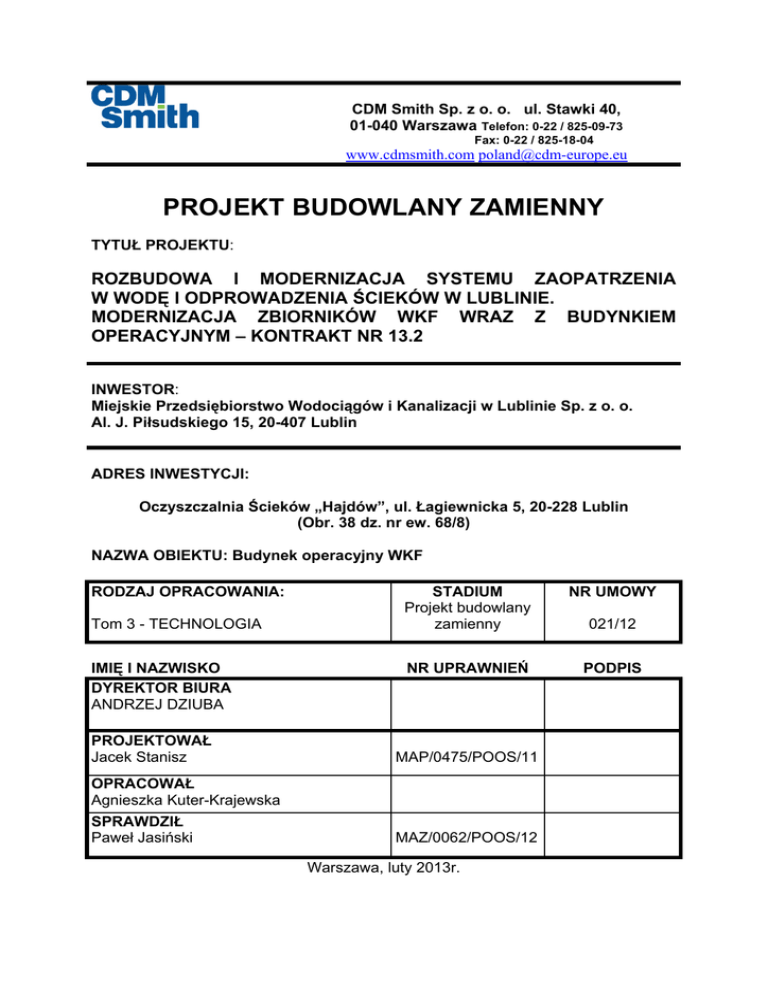CDM Smith Sp. z o. o. ul. Stawki 40, 01-040 Warszawa Telefon: 0-22 / 825-09-73 Fax: 0-22 / 825-18-04 www.cdmsmith.com [email protected] PROJEKT BUDOWLANY ZAMIENNY TYTUŁ PROJEKTU: ROZBUDOWA I MODERNIZACJA SYSTEMU ZAOPATRZENIA W WODĘ I ODPROWADZENIA ŚCIEKÓW W LUBLINIE. MODERNIZACJA ZBIORNIKÓW WKF WRAZ Z BUDYNKIEM OPERACYJNYM – KONTRAKT NR 13.2 INWESTOR: Miejskie Przedsiębiorstwo Wodociągów i Kanalizacji w Lublinie Sp. z o. o. Al. J. Piłsudskiego 15, 20-407 Lublin ADRES INWESTYCJI: Oczyszczalnia Ścieków „Hajdów”, ul. Łagiewnicka 5, 20-228 Lublin (Obr. 38 dz. nr ew. 68/8) NAZWA OBIEKTU: Budynek operacyjny WKF RODZAJ OPRACOWANIA: Tom 3 - TECHNOLOGIA IMIĘ I NAZWISKO DYREKTOR BIURA ANDRZEJ DZIUBA PROJEKTOWAŁ Jacek Stanisz STADIUM Projekt budowlany zamienny NR UMOWY NR UPRAWNIEŃ PODPIS MAP/0475/POOS/11 OPRACOWAŁ Agnieszka Kuter-Krajewska SPRAWDZIŁ Paweł Jasiński MAZ/0062/POOS/12 Warszawa, luty 2013r. 021/12 Rozbudowa i modernizacja systemu zaopatrzenia w wodę i odprowadzenia ścieków w Lublinie. Modernizacja zbiorników WKF wraz z budynkiem operacyjnym – kontrakt nr 13/2. PROJEKT BUDOWLANY - ZAMIENNY OŚWIADCZENIE PROJEKTANTÓW Oświadczam, że projekt budowlany zamienny został sporządzony zgodnie z wymaganiami ustawy Prawa Budowlanego, obowiązującymi przepisami oraz zasadami wiedzy technicznej. Projektant Autorzy Imię i nazwisko Uprawnienia Projektant Jacek Stanisz MAP/0475/POOS/11 Sprawdzający Paweł Jasiński MAZ/0062/POOS/12 Podpis 2 CDM Smith Sp. z o. o. Rozbudowa i modernizacja systemu zaopatrzenia w wodę i odprowadzenia ścieków w Lublinie. Modernizacja zbiorników WKF wraz z budynkiem operacyjnym – kontrakt nr 13/2. PROJEKT BUDOWLANY - ZAMIENNY SPIS ZAWARTOŚCI PROJEKTU BUDOWLANEGO Tom I Tom II Tom III Tom IV Projekt zagospodarownia terenu Konstrukcja Technologia Elektryka SPIS TREŚCI 1. 2. 3. 4. 5. 6. 7. 8. 9. 10. 11. 12. 13. 14. 15. Informacje ogólne ............................................................................................................ 4 Przedmiot i zakres opracowania ................................................................................... 4 Lokalizacja ........................................................................................................................ 4 Opis stanu istniejącego................................................................................................... 4 Projektowany schemat technologiczny. ....................................................................... 5 Przewody .......................................................................................................................... 8 Opis zmian w projekcie budowlano wykonawczym. .................................................. 9 Wytyczne realizacji inwestycji...................................................................................... 10 Wytyczne elektryczne i AKPiA. ................................................................................... 10 Wytyczne konstrukcyjne. .............................................................................................. 11 Ocena zagrożenia wybuchem ..................................................................................... 11 Wytyczne BHP. .............................................................................................................. 11 Sieci zewnętrzne ............................................................................................................ 11 Zestawienie materiałów i elementów sieci zewnętrznych ....................................... 12 Zewstawienie urządzeń, armatury i przewodów budynku operacyjnego WKF 13 Załącznik 1. Ocena zagrożenia wybuchem przestrzeni zewnętrznych WKF. 2. Kopia uprawnień i zaświadczenie o przynależności do Izby Inżynierskiej projektanta. 3. Kopia uprawnień i zaświadczenie o przynależności do Izby Inżynierskiej sprawdzającego. Spis rysunków 96108/T/PBW/72/01 96108/T/PBW/72/02 96108/T/PBW/72/03 96108/T/PBW/72/04 96108/T/PBW/72/05 96108/T/PBW/72/06 96108/T/PBW/72/07 96108/T/PBW/72/08 Schemat technologiczny Budynek operacyjny WKF. Demontaże Demontaże dla zbiorników WKF nr 2, 3 i 4 Budynek operacyjny WKF. Rzut parteru Budynek operacyjny WKF. Rzut piętra Budynek operacyjny WKF. Przekroje A-A, B-B, C-C, D-D, E-E, Rzut kopuły Przekroje F-F, G-G, K-K Przekroje J-J, H-H, L-L skala 1:100 skala 1:100 skala 1:50 skala 1: 50 skala 1: 50 skala 1: 50 skala 1: 50 3 CDM Smith Sp. z o. o. Rozbudowa i modernizacja systemu zaopatrzenia w wodę i odprowadzenia ścieków w Lublinie. Modernizacja zbiorników WKF wraz z budynkiem operacyjnym – kontrakt nr 13/2. PROJEKT BUDOWLANY - ZAMIENNY 1. Informacje ogólne Inwestor: Projektant: Podstawa opracowania: Miejskie Przedsiębiorstwo Wodociągów i Kanalizacji w Lublinie Sp. z o. o. Al. J. Piłsudskiego 15, 20-407 Lublin CDM Smith Sp. z o. o. ul. Stawki 40, 01-040 Warszawa Umowa zawarta pomiędzy Inwestorem a Projektantem. 2. Przedmiot i zakres opracowania Przedmiotem opracowania jest projekt budowlano wykonawczy zamienny modernizacji czterech istniejących komór WKF z budynkiem operacyjnym, w ramach Projektu „Rozbudowa i modernizacja systemu zaopatrzenia w wodę i odprowadzania ścieków w Lublinie. Modernizacja zbiorników WKF wraz budynkiem operacyjnym – kontrakt nr 13.2 „ Zakres niniejszej dokumentacji obejmuje część technologiczną wraz z wytycznymi branżowymi. Celem inwestycji jest modernizacja części technologicznej i budowlanej. Projekt obejmuje przebudowę następujących obiektów: - Wydzielone komory fermentacyjne, WKF-1; 2; 3 i 4, Opracowanie jest projektem zamiennym do projektu budowlanego: „ Rozbudowa i modernizacja systemu zaopatrzenia w wodę i odprowadzania ścieków w Lublinie. Modernizacja części osadowej oczyszczalni ścieków – kontrakt nr 13” wykonanym przez CDM Sp. z o.o. we wrześniu 2009r., na podstawie którego zostało wydane prawomocne pozwolenie na budowę – decyzja nr 595/1
