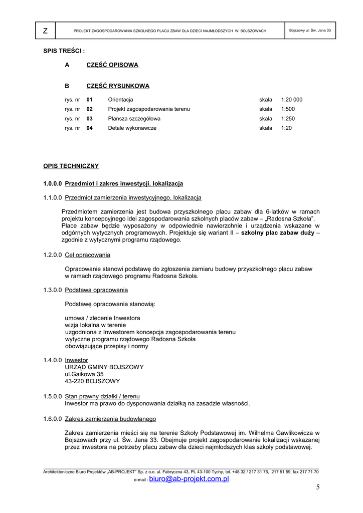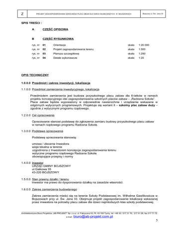 Z PROJEKT ZAGOSPODAROWANIA SZKOLNEGO PLACU ZBAW DLA DZIECI NAJMŁODSZYCH W BOJSZOWACH Bojszowy ul. Św. Jana 33 SPIS TREŚCI : A CZĘŚĆ OPISOWA B CZĘŚĆ RYSUNKOWA rys. nr 01 Orientacja skala 1:20 000 rys. nr 02 Projekt zagospodarowania terenu skala 1:500 rys. nr 03 Plansza szczegółowa skala 1:250 rys. nr 04 Detale wykonawcze skala 1:20 OPIS TECHNICZNY 1.0.0.0 Przedmiot i zakres inwestycji, lokalizacja 1.1.0.0 Przedmiot zamierzenia inwestycyjnego, lokalizacja Przedmiotem zamierzenia jest budowa przyszkolnego placu zabaw dla 6-latków w ramach projektu koncepcyjnego idei zagospodarowania szkolnych placów zabaw – „Radosna Szkoła”. Place zabaw będzie wyposażony w odpowiednie nawierzchnie i urządzenia wskazane w odgórnych wytycznych programowych. Projektuje się wariant II – szkolny plac zabaw duży – zgodnie z wytycznymi programu rządowego. 1.2.0.0 Cel opracowania Opracowanie stanowi podstawę do zgłoszenia zamiaru budowy przyszkolnego placu zabaw w ramach rządowego programu Radosna Szkoła. 1.3.0.0 Podstawa opracowania Podstawę opracowania stanowią: umowa / zlecenie Inwestora wizja lokalna w terenie uzgodniona z Inwestorem koncepcja zagospodarowania terenu wytyczne programu rządowego Radosna Szkoła obowiązujące przepisy i normy 1.4.0.0 Inwestor URZĄD GMINY BOJSZOWY ul.Gaikowa 35 43-220 BOJSZOWY 1.5.0.0 Stan prawny działki / terenu Inwestor ma prawo do dysponowania działką na zasadzie własności. 1.6.0.0 Zakres zamierzenia budowlanego Zakres zamierzenia mieści się na terenie Szkoły Podstawowej im. Wilhelma Gawlikowicza w Bojszowach przy ul. Św. Jana 33. Obejmuje projekt zagospodarowanie lokalizacji wskazanej przez inwestora na potrzeby placu zabaw dla dzieci najmłodszych klas szkoły podstawowej. ____________________________________________________________________________________________________________________ Architektoniczne Biuro Projektów „AB-PROJEKT” Sp. z o.o. ul. Fabryczna 43, PL 43-100 Tychy, tel. +48 32 / 217 31 76, 217 51 59, fax 217 71 70 e-mail : [email protected] 5 Z PROJEKT ZAGOSPODAROWANIA SZKOLNEGO PLACU ZBAW DLA DZIECI NAJMŁODSZYCH W BOJSZOWACH Bojszowy ul. Św. Jana 33 2.0.0.0 Istniejący stan zagospodarowania terenu 2.1.0.0 Charakterystyka terenu Teren przyszłego placu zabaw zlokalizowany jest tuż przy ogrodzeniu szkolnym w północno - wschodnim narożniku terenu szkoły w rejonie wejścia głównego do szkoły. Teren obsadzony jest drzewami iglastymi typu świerk (10 sztuk w różnym wieku), wierzba (1 szt.), modrzew (1 szt.; brak na mapie), tuja (1 szt.). Po środku terenu został urządzony tzw. skalniak, a tuz obok stoi stalowa wiata rowerowa. Z trzech stron placu biegną ciągi piesze wykonane z betonowych płyt chodnikowych. Od strony zachodniej teren sąsiaduje z asfaltowym placem przedszkolnym. Od wschodu i północy graniczy z istniejącym ogrodzeniem terenu szkolnego. Od strony ogrodzenia przy ul. Św. Jana teren posiada niewielką skarpę obsadzoną drzewami. Nawierzchnię w przeważającej mierze stanowi podłoże trawiaste. 2.1.1.0 Powierzchnia terenu Powierzchnia wytyczonej lokalizacji, na której realizowana będzie Inwestycja wynosi 525 m2. 2.1.3.0 Dostępność komunikacyjna lokalizacji Całość terenu inwestycji ma dostęp pieszy od strony ul. Św. Jana oraz z terenu szkolnego. 2.1.4.0 Orientacja obiektów w stosunku do stron świata Teren inwestycji o kształcie prostokąta położony dłuższym bokiem na kierunku wschód zachód. Od strony południowej zlokalizowany jest najbliższy budynek szkolny. 2.1.5.0 Istniejące ukształtowanie terenu Teren płaski z minimalnym spadkiem w kierunku wschodnim 3.0.0.0 Projektowane zagospodarowanie terenu Projektuje się ogrodzony plac zabaw z wejściami poprzez dwuskrzydłowe furtki o szer. 150 cm (otwierane na 180 st.) od strony ul. Św Jana oraz od strony południowej z terenu szkolnego. Projektowane ogrodzenie wykonać jako drewniane na wys. 80cm. Furtka w ogrodzeniu projektowanym dwuskrzydłowa szerokości 150cm, drewniana ze skrzydłem głównym szerokości 100cm. Furtkę w ogrodzeniu istniejącym wykonać w miejscu zdemontowanego stalowego przęsła. W celu uzyskania odpowiedniej przestrzeni dla funkcjonowania placu zabaw projektuje się wycinkę wszystkich świerków oraz pozostawienie trzech największych drzew – wierzby, modrzewia oraz tui. Należy zdemontować istniejący skalniak. Wiatę rowerową proponuje się przenieść w inną lokalizację np. pomiędzy budynkiem szkolnym, a projektowanym placem zabaw w południowo – wschodni narożnik. Od strony ul. Św. Jana w środku założenia zaprojektowano półkolisty układ z nawierzchni syntetycznej (np. Tartanowej) stanowiący strefę komunikacji. Bezpośrednio przy istniejącym ogrodzeniu od strony ulicy zachowuje się pas zieleni niskiej oraz istniejący drzewostan. Większą część powierzchni placu zabaw wypełniać będzie tzw. nawierzchnia bezpieczna wykonana np. z granulatu gumowego niwelującego skutki upadku z urządzenia. Każde urządzeń ma przewidzianą strefę bezpieczeństwa, w obrębie której nie wolno zlokalizować innego urządzenia (min. 150cm od każdego urządzenia i 390cm dla huśtawki wahadłowej w obrębie nawierzchni bezpiecznej). Całość wyposażona zostanie w ławki oraz śmietniki zgodnie z zapotrzebowaniem. ____________________________________________________________________________________________________________________ Architektoniczne Biuro Projektów „AB-PROJEKT” Sp. z o.o. ul. Fabryczna 43, PL 43-100 Tychy, tel. +48 32 / 217 31 76, 217 51 59, fax 217 71 70 e-mail : [email protected] 6 Z PROJEKT ZAGOSPODAROWANIA SZKOLNEGO PLACU ZBAW DLA DZIECI NAJMŁODSZYCH W BOJSZOWACH Bojszowy ul. Św. Jana 33 3.1.0.0 Podział i projektowane powierzchnie placu zabaw. Projektuje się podział na trzy rodzaje powierzchni: - nawierzchnia trawiasta jako teren towarzyszący – wyprofilowana ze spadkiem 1-3% - przed założeniem trawnika należy odpowiednio przygotować teren (u