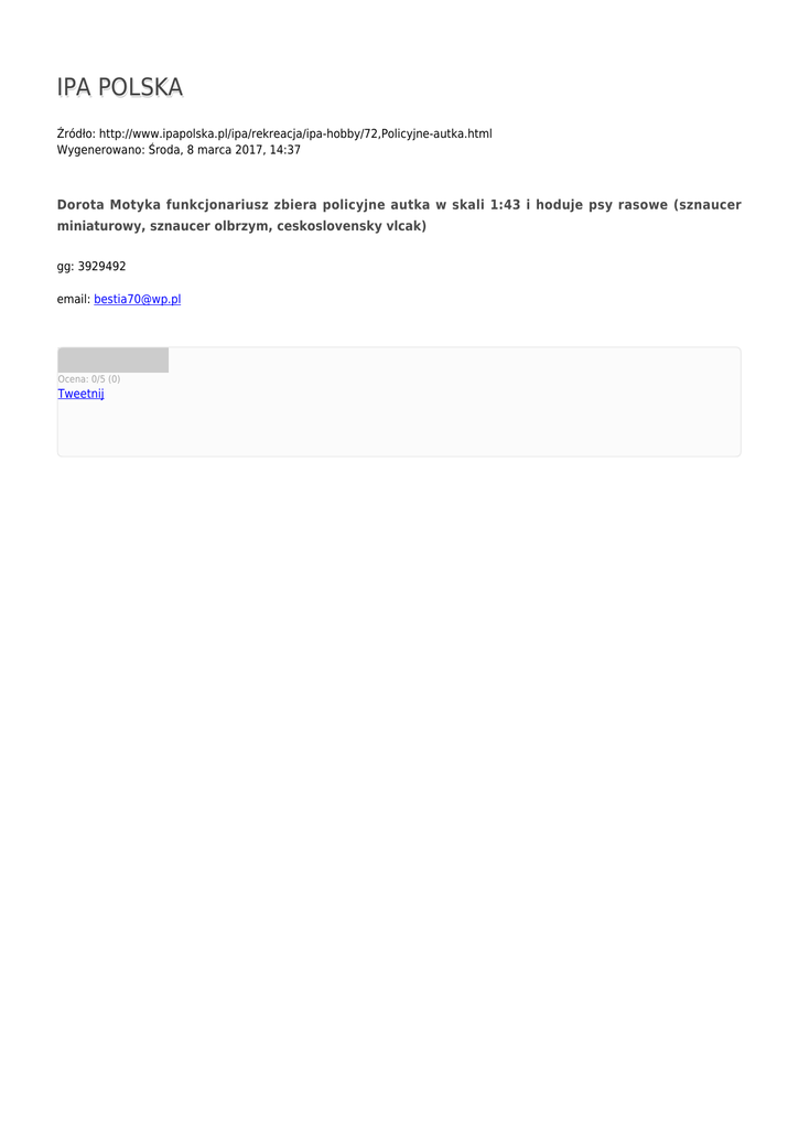 IPA POLSKA Źródło: http://www.ipapolska.pl/ipa/rekreacja/ipa-hobby/72,Policyjne-autka.html Wygenerowano: Środa, 8 marca 2017, 14:37 Dorota Motyka funkcjonariusz zbiera policyjne autka w skali 1:43 i hoduje psy rasowe (sznaucer miniaturowy, sznaucer olbrzym, ceskoslovensky vlcak) gg: 3929492 email: [email protected] Ocena: 0/5 (0) Tweetnij