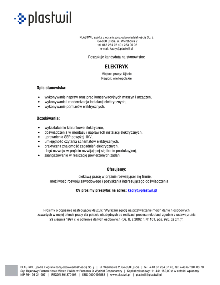 PLASTWIL spółka z ograniczoną odpowiedzialnością Sp. j. 64-850 Ujście, ul. Wierzbowa 2 tel. 067 284 07 40 / 283 05 02 e-mail: [email protected] Poszukuje kandydata na stanowisko: ELEKTRYK Miejsce pracy: Ujście Region: wielkopolskie Opis stanowiska: • • • wykonywanie napraw oraz prac konserwacyjnych maszyn i urządzeń, wykonywanie i modernizacja instalacji elektrycznych, wykonywanie pomiarów elektrycznych. Oczekiwania: • • • • • • wykształcenie kierunkowe elektryczne, doświadczenia w montażu i naprawach instalacji elektrycznych, uprawnienia SEP powyżej 1KV, umiejętność czytania schematów elektrycznych, praktyczna znajomość zagadnień elektrycznych, chęć rozwoju w prężnie rozwijającej się firmie produkcyjnej, zaangażowanie w realizację powierzonych zadań. Oferujemy: ciekawą pracę w prężnie rozwijającej się firmie, możliwość rozwoju zawodowego i pozyskania interesującego doświadczenia CV prosimy przesyłać na adres: [email protected] Prosimy o dopisanie następującej klauzuli: "Wyrażam zgodę na przetwarzanie moich danych osobowych zawartych w mojej ofercie pracy dla potrzeb niezbędnych do realizacji procesu rekrutacji zgodnie z ustawą z dnia 29 sierpnia 1997 r. o ochronie danych osobowych (Dz. U. z 2002 r. Nr 101, poz. 926, ze zm.)". PLASTWIL Spółka z ograniczoną odpowiedzialnością Sp. j. | ul. Wierzbowa 2, 64-850 Ujście | tel. +48 67 284 07 40, fax +48 67 284 03 78 Sąd Rejonowy Poznań Nowe Miasto i Wilda w Poznaniu IX Wydział Gospodarczy | Kapitał zakładowy: 11 441 152,00 zł w całości wpłacony NIP 764-26-34-997 | REGON 301370103 | KRS 0000495588 | www.plastwil.pl | [email protected]