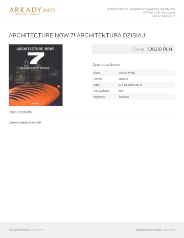 Dobra28 sp zoo. księgarnia wysyłkowa arkady.info ul. Dobra 28, Warszawa +48 22 444 86 97 ARCHITECTURE NOW 7! ARCHITEKTURA DZISIAJ Cena: 126,00 PLN Opis słownikowy Autor Jodidio Philip Format 20x25,5 ISBN 978-83-89192-82-0 Rok wydania 2011 Wydawca Taschen Opis produktu Oprawa miękka, Stron 480 Plik wygenerowano: 08-03-2017 Powered by TCPDF (www.tcpdf.org) Oprogramowanie sklepu: AptusShop