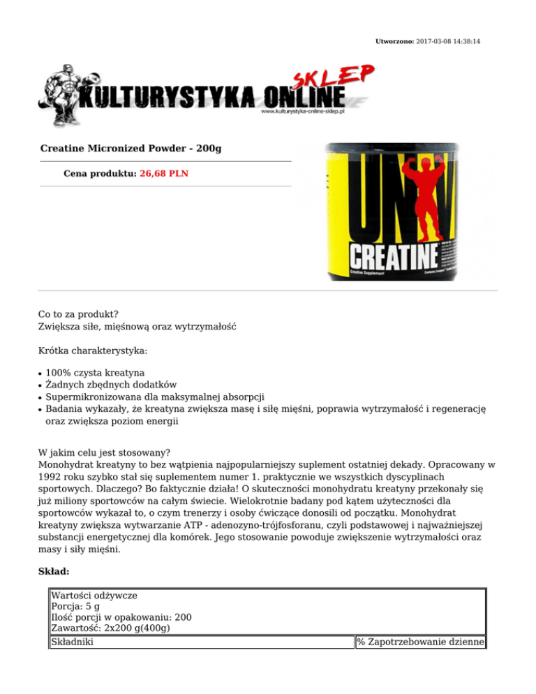 Utworzono: 2017-03-08 14:38:14 Creatine Micronized Powder - 200g Cena produktu: 26,68 PLN Co to za produkt? Zwiększa siłe, mięśnową oraz wytrzymałość Krótka charakterystyka: ● ● ● ● 100% czysta kreatyna Żadnych zbędnych dodatków Supermikronizowana dla maksymalnej absorpcji Badania wykazały, że kreatyna zwiększa masę i siłę mięśni, poprawia wytrzymałość i regenerację oraz zwiększa poziom energii W jakim celu jest stosowany? Monohydrat kreatyny to bez wątpienia najpopularniejszy suplement ostatniej dekady. Opracowany w 1992 roku szybko stał się suplementem numer 1. praktycznie we wszystkich dyscyplinach sportowych. Dlaczego? Bo faktycznie działa! O skuteczności monohydratu kreatyny przekonały się już miliony sportowców na całym świecie. Wielokrotnie badany pod kątem użyteczności dla sportowców wykazał to, o czym trenerzy i osoby ćwiczące donosili od początku. Monohydrat kreatyny zwiększa wytwarzanie ATP - adenozyno-trójfosforanu, czyli podstawowej i najważniejszej substancji energetycznej dla komórek. Jego stosowanie powoduje zwiększenie wytrzymałości oraz masy i siły mięśni. Skład: Wartości odżywcze Porcja: 5 g Ilość porcji w opakowaniu: 200 Zawartość: 2x200 g(400g) Składniki % Zapotrzebowanie dzienne Creatine Monohydrate 5g ** © 2008 Fitness Authority Sposób użycia: 1 porcję (5 gram) zmieszanę z wodą lub sokiem przyjmuj rano na czczo. Drugą porcję bezpośrednio po treningu siłowym. Adres: http://www.ko.sklep.pl/ Telefon: kom. 782 010 880 Email: [email protected]