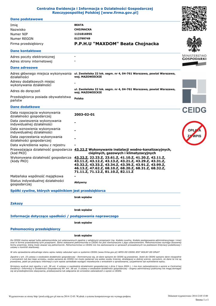 Centralna Ewidencja i Informacja o Działalności Gospodarczej Rzeczypospolitej Polskiej [www.firma.gov.pl] Dane podstawowe Imię Nazwisko Numer NIP Numer REGON BEATA Firma przedsiębiorcy P.P.H.U "MAXDOM" Beata Chojnacka CHOJNACKA 1131816955 012799749 Dane kontaktowe Adres poczty elektronicznej Adres strony internetowej Dane adresowe Adres głównego miejsca wykonywania ul. Zwoleńska 22 lok. segm. nr 4, 04761 Warszawa, powiat Warszawa, woj. MAZOWIECKIE działalności Adresy dodatkowych miejsc wykonywania działalności Adres do doręczeń ul. Zwoleńska 22 lok. segm. nr 4, 04761 Warszawa, powiat Warszawa, woj. MAZOWIECKIE Przedsiębiorca posiada obywatelstwa państw Polska Dane dodatkowe Data rozpoczęcia wykonywania działalności gospodarczej Data zawieszenia wykonywania indywidualnej działalności Data wznowienia wykonywania indywidualnej działalności Data zaprzestania wykonywania działalności gospodarczej Data wykreślenia wpisu z rejestru Przeważająca działalność gospodarcza (kod PKD) Wykonywana działalność gospodarcza (kody PKD) Małżeńska wspólność majątkowa Status indywidualnej działalności gospodarczej 20030201 43.22.Z Wykonywanie instalacji wodnokanalizacyjnych, cieplnych, gazowych i klimatyzacyjnych 43.22.Z, 22.23.Z, 23.61.Z, 41.10.Z, 41.20.Z, 42.11.Z, 43.11.Z, 43.12.Z, 43.13.Z, 43.21.Z, 43.29.Z, 43.31.Z, 43.32.Z, 43.33.Z, 43.34.Z, 43.39.Z, 43.91.Z, 43.99.Z, 46.13.Z, 47.62.Z, 68.10.Z, 68.20.Z, 68.31.Z, 68.32.Z, 71.11.Z, 71.12.Z, 81.10.Z, 82.11.Z Aktywny Spółki cywilne, których wspólnikiem jest przedsiębiorca brak wpisów Zakazy brak wpisów Informacje dotyczące upadłości / postępowania naprawczego brak wpisów Pełnomocnicy przedsiębiorcy brak wpisów Do CEIDG można wpisać tylko pełnomocników już ustanowionych zgodnie z odrębnymi przepisami (np. Kodeks cywilny, Kodeks postępowania administracyjnego i inne) oraz w formie przewidzianej tymi przepisami. Samo wskazanie pełnomocnika w CEIDG nie jest równoznaczne z jego ustanowieniem. Pełnomocnictwo wymaga stosownej formy pisemnej, którą może okazać się pełnomocnik. Pełnomocnictwo w CEIDG nie ma zastosowania w sprawach prowadzonych na podstawie Ordynacji podatkowej i ustawy o kontroli skarbowej. W celu sprawdzenia aktualnego stanu wpisu należy odszukać wpis w systemie CEIDG (www.firma.gov.pl) WPIS DO CEIDG JEST WOLNY OD OPŁAT Zgodnie z art. 33 ustawy o swobodzie działalności gospodarczej Domniemywa się, że dane wpisane do CEIDG są prawdziwe. Jeżeli do CEIDG wpisano dane niezgodnie z wnioskiem lub bez tego wniosku, osoba wpisana do CEIDG nie może zasłaniać się wobec osoby trzeciej, działającej w dobrej wierze, zarzutem, że dane te nie są prawdziwe, jeżeli po powzięciu informacji o tym wpisie zaniedbała wystąpić niezwłocznie z wnioskiem o sprostowanie, uzupełnienie lub wykreślenie wpisu. Niniejszy wydruk jest zgodny z art. 38 ust. 4 ustawy o swobodzie działalności gospodarczej z dnia 2 lipca 2004 r. i ma moc zaświadczenia o wpisie w Centralnej Ewidencji i Informacji o Działalności Gospodarczej RP. Art. 38 ust. 5 ustawy o swobodzie działalności gospodarczej Organy administracji publicznej nie mogą domagać się od przedsiębiorców okazywania, przekazywania lub załączania do wniosków zaświadczeń o wpisie w CEIDG. Wygenerowano ze strony http://prod.ceidg.gov.pl stan na 20141205. Wydruk z systemu komputerowego nie wymaga podpisu. Dokument wygenerowano: 20141205 13:00 Strona 1 z 1