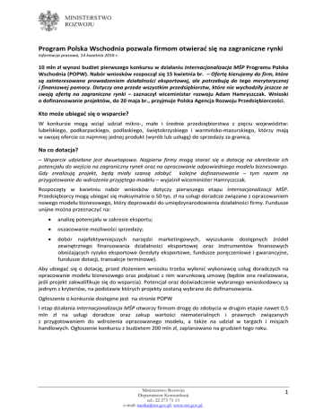 Program Polska Wschodnia pozwala firmom otwierać się na zagraniczne rynki Informacja prasowa, 14 kwietnia 2016 r. 10 mln zł wynosi budżet pierwszego konkursu w działaniu Internacjonalizacja MŚP Programu Polska Wschodnia (POPW). Nabór wniosków rozpoczął się 15 kwietnia br. – Ofertę kierujemy do firm, które są zainteresowane prowadzeniem działalności eksportowej, ale potrzebują do tego merytorycznej i finansowej pomocy. Dotyczy ona przede wszystkim przedsiębiorstw, które nie wychodziły jeszcze ze swoją ofertą na zagraniczne rynki – zaznaczył wiceminister rozwoju Adam Hamryszczak. Wnioski o dofinansowanie projektów, do 20 maja br., przyjmuje Polska Agencja Rozwoju Przedsiębiorczości. Kto może ubiegać się o wsparcie? W konkursie mogą wziąć udział mikro-, małe i średnie przedsiębiorstwa z pięciu województw: lubelskiego, podkarpackiego, podlaskiego, świętokrzyskiego i warmińsko-mazurskiego, którzy mają w swojej ofercie co najmniej jednej produkt (wyrób lub usługę) do sprzedaży za granicą. Na co dotacja? – Wsparcie udzielane jest dwuetapowo. Najpierw firmy mogą starać się o dotację na określenie ich potencjału do wejścia na zagraniczny rynek oraz na opracowanie odpowiedniego modelu biznesowego. Gdy zrealizują projekt, będą miały szansę zdobyć kolejne dofinansowanie – tym razem na przygotowanie do wdrożenia przyjętego modelu – wyjaśnił wiceminister Hamryszczak. Rozpoczęty w kwietniu nabór wniosków dotyczy pierwszego etapu Internacjonalizacji MŚP. Przedsiębiorcy mogą ubiegać się maksymalnie o 50 tys. zł na usługi doradcze związane z opracowaniem nowego modelu biznesowego, który doprowadzi do umiędzynarodowienia działalności firmy. Fundusze unijne można przeznaczyć na: analizę potencjału w zakresie eksportu; oszacowanie możliwości sprzedaży; dobór najefektywniejszych narzędzi marketingowych, wyszukanie dostępnych źródeł zewnętrznego finansowania działalności eksportowej oraz instrumentów finansowych obniżających ryzyko eksportowe (kredyty eksportowe, fundusze poręczeniowe i gwarancyjne, fundusze dotacji, transakcje terminowe). Aby ubiegać się o dotację, przed złożeniem wniosku trzeba wyłonić wykonawcę usług doradczych na opracowanie modelu biznesowego oraz podpisać z nim warunkową umowę (będzie ona realizowana, jeśli projekt zakwalifikuje się do wsparcia). Potencjał oraz doświadczenie wybranego wnioskodawcy są jednym z kryteriów, na podstawie których projekty zostaną wybrane do dofinansowania. Ogłoszenie o konkursie dostępne jest na stronie POPW I etap działania Internacjonalizacja MŚP otworzy firmom drogę do zdobycia w drugim etapie nawet 0,5 mln zł na usługi doradcze oraz zakup wartości niematerialnych i prawnych związanych z przygotowaniem do wdrożenia opracowanego modelu, a także na udział w targach i misjach handlowych. Ogłoszenie konkursu z budżetem 200 mln zł, zaplanowano na grudzień tego roku. Ministerstwo Rozwoju Departament Komunikacji tel.: 22 273 71 13 e-mail: [email protected], www.mr.gov.pl, 1