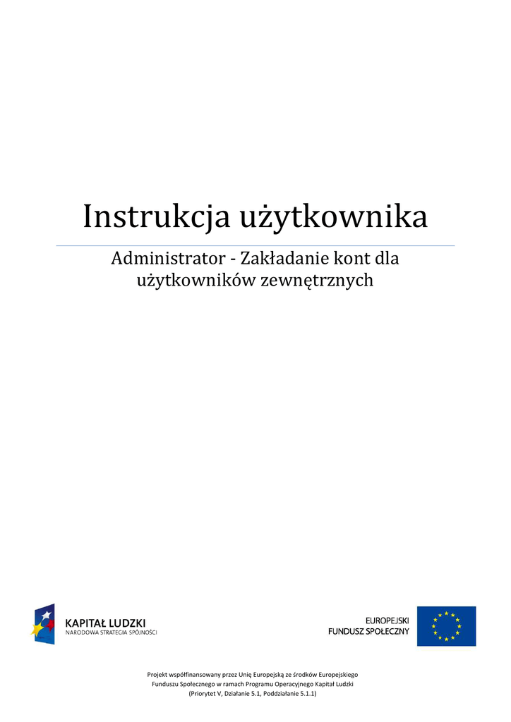 Instrukcja użytkownika Administrator - Zakładanie kont dla użytkowników zewnętrznych Projekt współfinansowany przez Unię Europejską ze środków Europejskiego Funduszu Społecznego w ramach Programu Operacyjnego Kapitał Ludzki (Priorytet V, Działanie 5.1, Poddziałanie 5.1.1) Projekt współfinansowany przez Unię Europejską ze środków Europejskiego Funduszu Społecznego w ramach Programu Operacyjnego Kapitał Ludzki (Priorytet V, Działanie 5.1, Poddziałanie 5.1.1) Zawartość 1. Logowanie ....................................................................................................................................... 3 2. Podmioty ......................................................................................................................................... 3 3. 2.1. Przeglądanie i wyszukiwanie podmiotów ............................................................................... 3 2.2. Tworzenie podmiotów ............................................................................................................ 4 Użytkownicy .................................................................................................................................... 6 3.1. Przeglądanie i wyszukiwanie użytkowników ........................................................................... 6 3.2. Tworzenie użytkowników ........................................................................................................ 7 4. Przypisanie użytkowników do grup SharePoint .............................. Błąd! Nie zdefiniowano zakładki. Strona 2 z 9 Projekt współfinansowany przez Unię Europejską ze środków Europejskiego Funduszu Społecznego w ramach Programu Operacyjnego Kapitał Ludzki (Priorytet V, Działanie 5.1, Poddziałanie 5.1.1) 1. Logowanie W celu zalogowania do aplikacji służącej do zarządzania użytkownikami zewnętrznymi, należy wprowadzić swój login i hasło, a następnie wybrać opcję Zaloguj. 2. Podmioty Aby móc przeglądać listę podmiotów oraz tworzyć nowe, należy wybrać z menu zakładkę Podmioty. 2.1. Przeglądanie i wyszukiwanie podmiotów Aplikacja umożliwia wyszukiwanie podmiotów z uwzględnieniem następujących kryteriów: • • • • nazwa podmiotu, kategoria podmiotu (wybór z listy), typ podmiotu w ramach wybranej kategorii (wybór z listy), województwo (wybór z listy) Po wprowadzeniu kryteriów, w celu wyszukania podmiotów należy wybrać Znajdź. Strona 3 z 9 Projekt współfinansowany przez Unię Europejską ze środków Europejskiego Funduszu Społecznego w ramach Programu Operacyjnego Kapitał Ludzki (Priorytet V, Działanie 5.1, Poddziałanie 5.1.1) Spowoduje to wyświetlenie listy podmiotów, spełniających wprowadzone kryteria. Aby przejść do podglądu wybranego podmiotu należy wybrać opcję Zobacz, znajdującą się przy jego nazwie. Spowoduje to wyświetlenie wszystkich informacji dotyczących wybranego podmiotu wraz z możliwością ich edycji. W przypadku zmiany danych, należy je potwierdzić wybierając Zapisz. 2.2. Tworzenie podmiotów Aby utworzyć nowy podmiot należy wybrać opcję Utwórz nowy podmiot, znajdującą się poniżej kryteriów wyszukiwania podmiotów. Strona 4 z 9 Projekt współfinansowany przez Unię Europejską ze środków Europejskiego Funduszu Społecznego w ramach Programu Operacyjnego Kapitał Ludzki (Priorytet V, Działanie 5.1, Poddziałanie 5.1.1) Spowoduje to przejście do formularza dodawania nowego podmiotu, w którym należy wprowadzić wszystkie niezbędne informacje, a mianowicie: • • • • • • nazwa podmiotu, kategoria (wybór z listy), typ (wybór z listy), województwo (wybór z listy), adres, klasyfikacja budżetowa. Aby zapisać wprowadzone dane należy wybrać opcję Zapisz. Powyższe czynności spowodują utworzenie nowego podmiotu, dla którego następnie należy utworzyć użytkownika (Patrz pkt. 3.2.). W przypadku gdy w jednostce występuje więcej niż jeden rozdział klasyfikacji budżetowej, należy stworzyć odrębne podmioty zgodnie z poniższym przykładem: Jednostka: Urząd Statystyczny w Białymstoku Podmiot nr 1: Urząd Statystyczny w Białymstoku – z klasyfikacją budżetową: część 58, dział 720, rozdział 72002, Podmiot nr 2: Urząd Statystyczny w Białymstoku – z klasyfikacją budżetową: część 58, dział 750, rozdział 75007, Strona 5 z 9 Projekt współfinansowany przez Unię Europejską ze środków Europejskiego Funduszu Społecznego w ramach Programu Operacyjnego Kapitał Ludzki (Priorytet V, Działanie 5.1, Poddziałanie 5.1.1) 3. UŜytkownicy Aby móc przeglądać dotychczasowych i tworzyć nowych użytkowników, należy wybrać z menu zakładkę Użytkownicy. 3.1. Przeglądanie i wyszukiwanie uŜytkowników Aplikacja umożliwia wyszukiwanie istniejących użytkowników, za pomocą następujących kryteriów: • • • • imię i nazwisko, login, nazwa podmiotu, e-mail. Aby wyszukać użytkowników za pomocą wskazanych kryteriów, należy wybrać opcję Znajdź. Spowoduje to wyświetlenie listy użytkowników z możliwością wejścia do podglądu/edycji wybranego za pomocą opcji Zobacz, znajdującej się przy nazwisku użytkownika. Wejście do szczegółów wybranego użytkownika umożliwia wprowadzenie zmian w jego danych oraz ich zapisanie za pomocą opcji Zapisz. Strona 6 z 9 Projekt współfinansowany przez Unię Europejską ze środków Europejskiego Funduszu Społecznego w ramach Programu Operacyjnego Kapitał Ludzki (Priorytet V, Działanie 5.1, Poddziałanie 5.1.1) 3.2. Tworzenie uŜytkowników Aby utworzyć nowego użytkownika należy wybrać opcję Utwórz nowego użytkownika, znajdującą się poniżej kryteriów wyszukiwania. Spowoduje to przejście do formularza dodawania nowego użytkownika, który wymaga określenia następujących informacji: • • • • • • • imię i nazwisko, login, e-mail, hasło, podmiot, do którego ma być przypisany (wybór z listy), czy ak