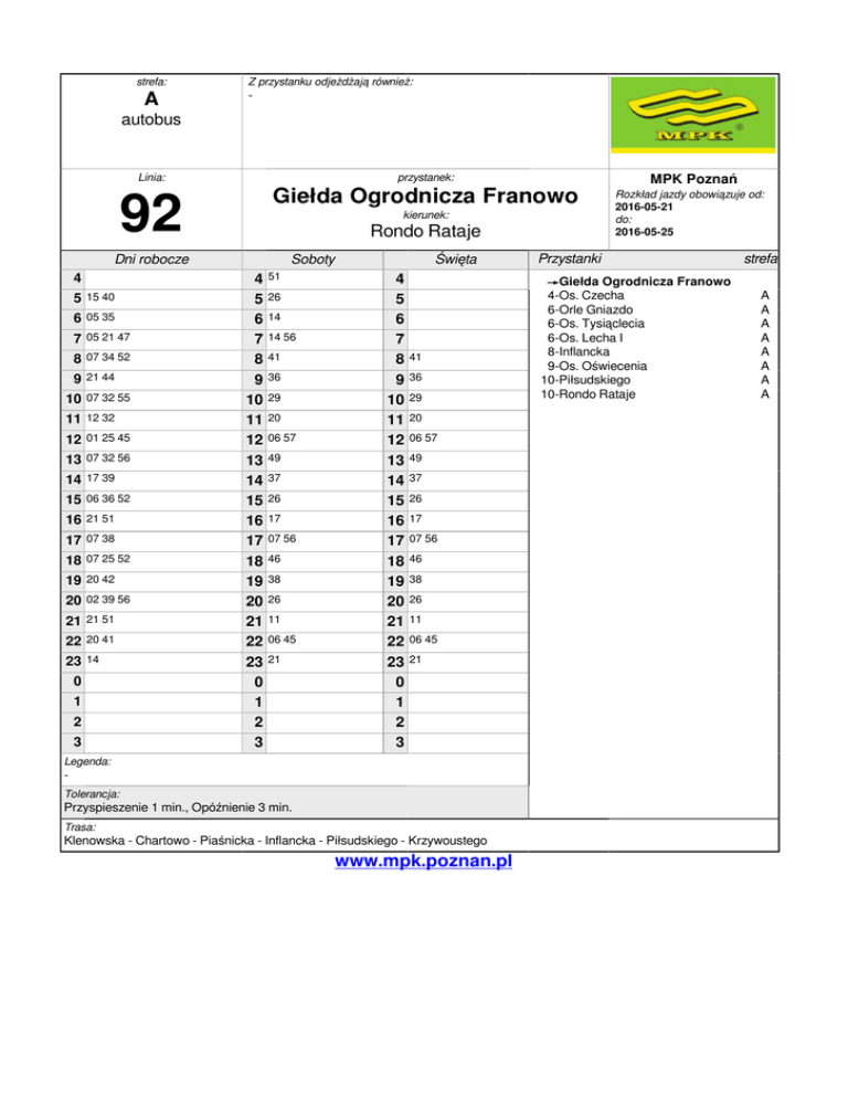 strefa: A Z przystanku odjeżdżają również: - autobus Linia: przystanek: 92 Dni robocze 4 5 15 40 6 05 35 7 05 21 47 8 07 34 52 9 21 44 10 07 32 55 11 12 32 12 01 25 45 13 07 32 56 14 17 39 15 06 36 52 16 21 51 17 07 38 18 07 25 52 19 20 42 20 02 39 56 21 21 51 22 20 41 23 14 0 1 2 3 Giełda Ogrodnicza Franowo kierunek: Rondo Rataje 4 5 6 7 8 9 10 11 12 13 14 15 16 17 18 19 20 21 22 23 0 1 2 3 51 Soboty 26 14 14 56 41 36 29 20 06 57 49 37 26 17 07 56 46 38 26 11 06 45 21 4 5 6 7 8 9 10 11 12 13 14 15 16 17 18 19 20 21 22 23 0 1 2 3 Święta 41 36 29 20 06 57 49 37 26 17 07 56 46 38 26 11 06 45 21 Legenda: - Tolerancja: Przyspieszenie 1 min., Opóźnienie 3 min. Trasa: Klenowska - Chartowo - Piaśnicka - Inflancka - Piłsudskiego - Krzywoustego www.mpk.poznan.pl MPK Poznań Rozkład jazdy obowiązuje od: 2016-05-21 do: 2016-05-25 Przystanki →Giełda Ogrodnicza Franowo 4-Os. Czecha 6-Orle Gniazdo 6-Os. Tysiąclecia 6-Os. Lecha I 8-Inflancka 9-Os. Oświecenia 10-Piłsudskiego 10-Rondo Rataje strefa A A A A A A A A