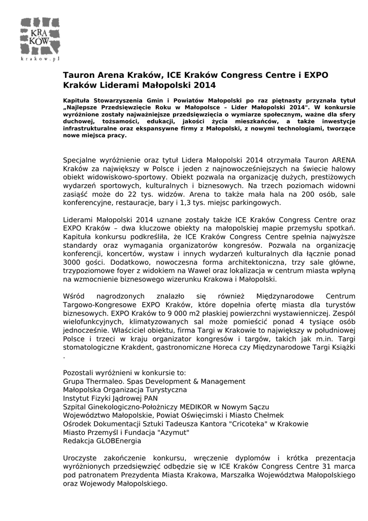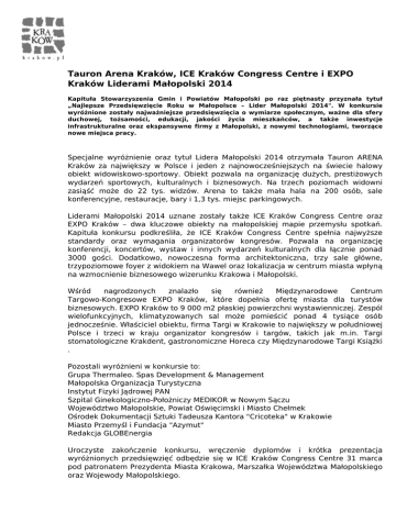 Tauron Arena Kraków, ICE Kraków Congress Centre i EXPO Kraków Liderami Małopolski 2014 Kapituła Stowarzyszenia Gmin i Powiatów Małopolski po raz piętnasty przyznała tytuł „Najlepsze Przedsięwzięcie Roku w Małopolsce – Lider Małopolski 2014". W konkursie wyróżnione zostały najważniejsze przedsięwzięcia o wymiarze społecznym, ważne dla sfery duchowej, tożsamości, edukacji, jakości życia mieszkańców, a także inwestycje infrastrukturalne oraz ekspansywne firmy z Małopolski, z nowymi technologiami, tworzące nowe miejsca pracy. Specjalne wyróżnienie oraz tytuł Lidera Małopolski 2014 otrzymała Tauron ARENA Kraków za największy w Polsce i jeden z najnowocześniejszych na świecie halowy obiekt widowiskowo-sportowy. Obiekt pozwala na organizację dużych, prestiżowych wydarzeń sportowych, kulturalnych i biznesowych. Na trzech poziomach widowni zasiąść może do 22 tys. widzów. Arena to także mała hala na 200 osób, sale konferencyjne, restauracje, bary i 1,3 tys. miejsc parkingowych. Liderami Małopolski 2014 uznane zostały także ICE Kraków Congress Centre oraz EXPO Kraków – dwa kluczowe obiekty na małopolskiej mapie przemysłu spotkań. Kapituła konkursu podkreśliła, że ICE Kraków Congress Centre spełnia najwyższe standardy oraz wymagania organizatorów kongresów. Pozwala na organizację konferencji, koncertów, wystaw i innych wydarzeń kulturalnych dla łącznie ponad 3000 gości. Dodatkowo, nowoczesna forma architektoniczna, trzy sale główne, trzypoziomowe foyer z widokiem na Wawel oraz lokalizacja w centrum miasta wpłyną na wzmocnienie biznesowego wizerunku Krakowa i Małopolski. Wśród nagrodzonych znalazło się również Międzynarodowe Centrum Targowo-Kongresowe EXPO Kraków, które dopełnia ofertę miasta dla turystów biznesowych. EXPO Kraków to 9 000 m2 płaskiej powierzchni wystawienniczej. Zespól wielofunkcyjnych, klimatyzowanych sal może pomieścić ponad 4 tysiące osób jednocześnie. Właściciel obiektu, firma Targi w Krakowie to największy w południowej Polsce i trzeci w kraju organizator kongresów i targów, takich jak m.in. Targi stomatologiczne Krakdent, gastronomiczne Horeca czy Międzynarodowe Targi Książki . Pozostali wyróżnieni w konkursie to: Grupa Thermaleo. Spas Development & Management Małopolska Organizacja Turystyczna Instytut Fizyki Jądrowej PAN Szpital Ginekologiczno-Położniczy MEDIKOR w Nowym Sączu Województwo Małopolskie, Powiat Oświęcimski i Miasto Chełmek Ośrodek Dokumentacji Sztuki Tadeusza Kantora "Cricoteka" w Krakowie Miasto Przemyśl i Fundacja "Azymut" Redakcja GLOBEnergia Uroczyste zakończenie konkursu, wręczenie dyplomów i krótka prezentacja wyróżnionych przedsięwzięć odbędzie się w ICE Kraków Congress Centre 31 marca pod patronatem Prezydenta Miasta Krakowa, Marszałka Województwa Małopolskiego oraz Wojewody Małopolskiego. Więcej informacji na temat konkursu na: www.sgpm.krakow.pl Powered by TCPDF (www.tcpdf.org)