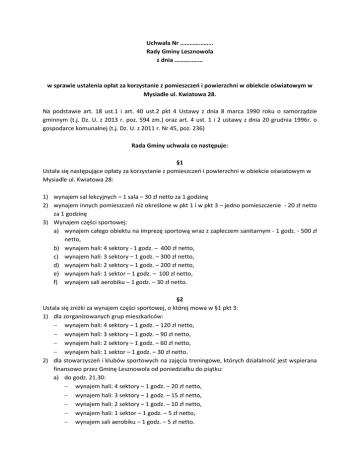 Uchwała Nr ………………… Rady Gminy Lesznowola z dnia ……………… w sprawie ustalenia opłat za korzystanie z pomieszczeń i powierzchni w obiekcie oświatowym w Mysiadle ul. Kwiatowa 28. Na podstawie art. 18 ust.1 i art. 40 ust.2 pkt 4 Ustawy z dnia 8 marca 1990 roku o samorządzie gminnym (t.j. Dz. U. z 2013 r. poz. 594 zm.) oraz art. 4 ust. 1 i 2 ustawy z dnia 20 grudnia 1996r. o gospodarce komunalnej (t.j. Dz. U. z 2011 r. Nr 45, poz. 236) Rada Gminy uchwala co następuje: §1 Ustala się następujące opłaty za korzystanie z pomieszczeń i powierzchni w obiekcie oświatowym w Mysiadle ul. Kwiatowa 28: 1) wynajem sal lekcyjnych – 1 sala – 30 zł netto za 1 godzinę 2) wynajem innych pomieszczeń niż określone w pkt 1 i w pkt 3 – jedno pomieszczenie - 20 zł netto za 1 godzinę 3) Wynajem części sportowej: a) wynajem całego obiektu na imprezę sportową wraz z zapleczem sanitarnym - 1 godz. - 500 zł netto, b) wynajem hali: 4 sektory - 1 godz. – 400 zł netto, c) wynajem hali: 3 sektory – 1 godz. – 300 zł netto, d) wynajem hali: 2 sektory – 1 godz. – 200 zł netto, e) wynajem hali: 1 sektor – 1 godz. – 100 zł netto, f) wynajem sali aerobiku – 1 godz. – 30 zł netto. §2 Ustala się zniżki za wynajem części sportowej, o której mowa w §1 pkt 3: 1) dla zorganizowanych grup mieszkańców: − wynajem hali: 4 sektory – 1 godz. – 120 zł netto, − wynajem hali: 3 sektory – 1 godz. – 90 zł netto, − wynajem hali: 2 sektory – 1 godz. – 60 zł netto, − wynajem hali: 1 sektor – 1 godz. – 30 zł netto. 2) dla stowarzyszeń i klubów sportowych na zajęcia treningowe, których działalność jest wspierana finansowo przez Gminę Lesznowola od poniedziałku do piątku: a) do godz. 21.30: − wynajem hali: 4 sektory – 1 godz. – 20 zł netto, − wynajem hali: 3 sektory – 1 godz. – 15 zł netto, − wynajem hali: 2 sektory – 1 godz. – 10 zł netto, − wynajem hali: 1 sektor – 1 godz. – 5 zł netto, − wynajem sali aerobiku – 1 godz. – 5 zł netto. b) w godz. 21.30– 23.00: − wynajem hali: 4 sektory – 1 godz. – 120 zł netto, − wynajem hali: 3 sektory – 1 godz. – 90 zł netto, − wynajem hali: 2 sektory – 1 godz. – 60 zł netto, − wynajem hali: 1 sektor – 1 godz. – 30 zł netto. 3) dla stowarzyszeń i klubów sportowych na zajęcia treningowe, których działalność jest wspierana finansowo przez Gminę Lesznowola w sobotę i niedzielę: a) do godz. 18.00: − wynajem hali: 4 sektory – 1 godz. – 20 zł netto, − wynajem hali: 3 sektory – 1 godz. – 15 zł netto, − wynajem hali: 2 sektory – 1 godz. – 10 zł netto, − wynajem hali: 1 sektor – 1 godz. – 5 zł netto, − wynajem sali aerobiku – 1 godz. – 5 zł netto. b) w godz. 18.00 – 23.00: − wynajem hali: 4 sektory – 1 godz. – 120 zł netto, − wynajem hali: 3 sektory – 1 godz. – 90 zł netto, − wynajem hali: 2 sektory – 1 godz. – 60 zł netto, − wynajem hali: 1 sektor – 1 godz. – 30 zł netto. 4) dla stowarzyszeń i klubów sportowych na imprezę sportową, których działalność jest wspierana finansowo przez Gminę Lesznowola: − wynajem hali: 4 sektory – 1 godz. – 120 zł netto, − wynajem hali: 3 sektory – 1 godz. – 90 zł netto, − wynajem hali: 2 sektory – 1 godz. – 60 zł netto, − wynajem hali: 1 sektor – 1 godz. – 30 zł netto. §3 Opłaty powinny być określone w wysokości netto i brutto a płatność wykonywana z dołu za każdy miesiąc na podstawie wystawionej faktury przez Gminę Lesznowola. §4 Tracą moc uchwała Nr 489/XXXIX/2014 Rady Gminy Lesznowola z dnia 27 marca 2014 r. w sprawie w ustalenia opłat za korzystanie z pomieszczeń i powierzchni w obiekcie oświatowym w Mysiadle ul. Kwiatowa 28 (Dz. Urzęd. Woj. Maz. z 2014 r poz. 3934 z 11 kwietnia 2014 r.), oraz Nr 596/XLV/2014 Rady Gminy Lesznowola z dnia 24 września 2014 r. w sprawie zmiany uchwały Nr 489/XXXIX/2014 Rady Gminy Lesznowola z dnia 27 marca 2014 r. w sprawie w ustalenia opłat za korzystanie z pomieszczeń i powierzchni w obiekcie oświatowym w Mysiadle ul. Kwiatowa 28 (Dz. Urzęd. Woj. Maz. z 2014 r. poz. 9735 z 17 października 2014 r.) §5 Wykonanie uchwały powierza się Wójtowi Gminy Lesznowola. §6 Uchwała wchodzi w życie po upływie 14 dni od daty opublikowania w Dzienniku Urzędowym Województwa Mazowieckiego z mocą obowiązującą od 1 sierpnia 2015 r. Uzasadnienie Uchwała doprecyzowuje na jaki rodzaj zajęć sportowych stosuje się zniżki w opłatach za korzystanie z obiektu sportowego. Wprowadza się również zniżki dla stowarzyszeń i klubów sportowych, które korzystają z obiektu sportowego w celu przeprowadzenia imprezy sportowej.
