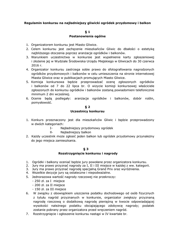 Regulamin konkursu na najładniejszy gliwicki ogródek przydomowy i balkon §1 Postanowienia ogólne 1. Organizatorem konkursu jest Miasto Gliwice. 2. Celem konkursu jest zachęcenie mieszkańców Gliwic do dbałości o estetykę najbliższego otoczenia poprzez aranżacje ogródków i balkonów. 3. Warunkiem uczestnictwa w konkursie jest wypełnienie karty zgłoszeniowej i złożenie jej w Wydziale Środowiska Urzędu Miejskiego w Gliwicach do 30 czerwca 2016 r. 4. Organizator konkursu zastrzega sobie prawo do sfotografowania nagrodzonych ogródków przydomowych i balkonów w celu umieszczenia na stronie internetowej Miasta Gliwice oraz w publikacjach promujących Miasto Gliwice. 5. Komisja konkursowa będzie przeprowadzać ocenę zgłoszonych ogródków i balkonów od 7 do 22 lipca br. O wizycie komisji konkursowej właściciele zgłoszonych do konkursu ogródków i balkonów zostaną powiadomieni telefonicznie minimum 2 dni wcześniej. 6. Ocenie będą podlegały: aranżacje ogródków i balkonów, dobór roślin, pomysłowość. §2 Uczestnicy konkursu 1. Konkurs przeznaczony jest dla mieszkańców Gliwic i będzie przeprowadzony w dwóch kategoriach: INajładniejszy przydomowy ogródek IINajładniejszy balkon 2. Każdy uczestnik może zgłosić jeden balkon lub ogródek przydomowy przynależny do jego miejsca zamieszkania. §3 Rozstrzygnięcie konkursu i nagrody 1. 2. 3. 4. 5. 6. 7. Ogródki i balkony oceniać będzie jury powołane przez organizatora konkursu. Jury ma prawo przyznać nagrody za I, II i III miejsce w każdej z ww. kategorii. Jury ma prawo przyznać nagrodę specjalną Grand Prix oraz wyróżnienia. Wszelkie decyzje jury są ostateczne i niepodważalne. Jednorazowa wartość nagrody rzeczowej nie przekroczy: - 250 zł. za I miejsce - 200 zł. za II miejsce - 150 zł. za III miejsce W związku z obowiązkiem uiszczenia podatku dochodowego od osób fizycznych z tytułu nagród przyznanych w konkursie, organizator zwiększy przyznaną nagrodę rzeczową o dodatkową nagrodę pieniężną w kwocie odpowiadającej wysokości należnego podatku obciążającego zdobywcę nagrody; podatek zostanie pobrany przez organizatora przed wręczeniem nagród. Rozstrzygnięcie i ogłoszenie konkursu nastąpi w IV kwartale br.