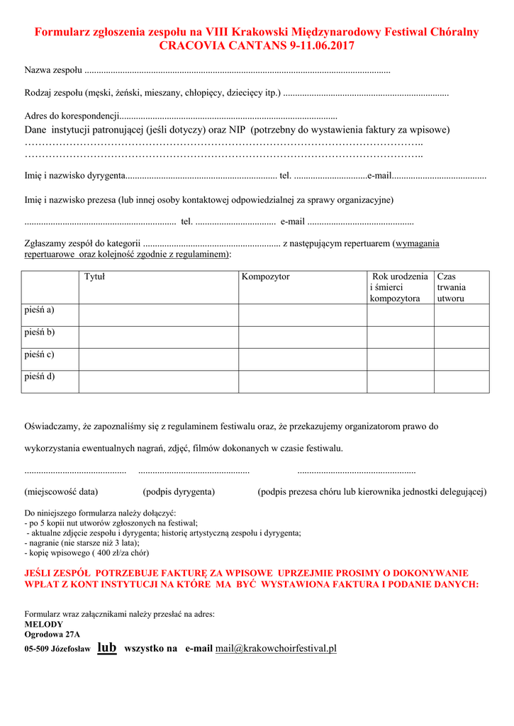 Formularz zgłoszenia zespołu na VIII Krakowski Międzynarodowy Festiwal Chóralny CRACOVIA CANTANS 9-11.06.2017 Nazwa zespołu ................................................................................................................................. Rodzaj zespołu (męski, żeński, mieszany, chłopięcy, dziecięcy itp.) ...................................................................... Adres do korespondencji............................................................................................ Dane instytucji patronującej (jeśli dotyczy) oraz NIP (potrzebny do wystawienia faktury za wpisowe) …………………………………………………………………………………………………….. …………………………………………………………………………………………………….. Imię i nazwisko dyrygenta................................................................ tel. ...............................e-mail........................................ Imię i nazwisko prezesa (lub innej osoby kontaktowej odpowiedzialnej za sprawy organizacyjne) ................................................................ tel. .................................. e-mail ............................................. Zgłaszamy zespół do kategorii .......................................................... z następującym repertuarem (wymagania repertuarowe oraz kolejność zgodnie z regulaminem): Tytuł Kompozytor Rok urodzenia Czas i śmierci trwania kompozytora utworu pieśń a) pieśń b) pieśń c) pieśń d) Oświadczamy, że zapoznaliśmy się z regulaminem festiwalu oraz, że przekazujemy organizatorom prawo do wykorzystania ewentualnych nagrań, zdjęć, filmów dokonanych w czasie festiwalu. ........................................... (miejscowość data) ............................................... (podpis dyrygenta) .................................................. (podpis prezesa chóru lub kierownika jednostki delegującej) Do niniejszego formularza należy dołączyć: - po 5 kopii nut utworów zgłoszonych na festiwal; - aktualne zdjęcie zespołu i dyrygenta; historię artystyczną zespołu i dyrygenta; - nagranie (nie starsze niż 3 lata); - kopię wpisowego ( 400 zł/za chór) JEŚLI ZESPÓŁ POTRZEBUJE FAKTURĘ ZA WPISOWE UPRZEJMIE PROSIMY O DOKONYWANIE WPŁAT Z KONT INSTYTUCJI NA KTÓRE MA BYĆ WYSTAWIONA FAKTURA I PODANIE DANYCH: Formularz wraz załącznikami należy przesłać na adres: MELODY Ogrodowa 27A 05-509 Józefosław lub wszystko na e-mail [email protected]