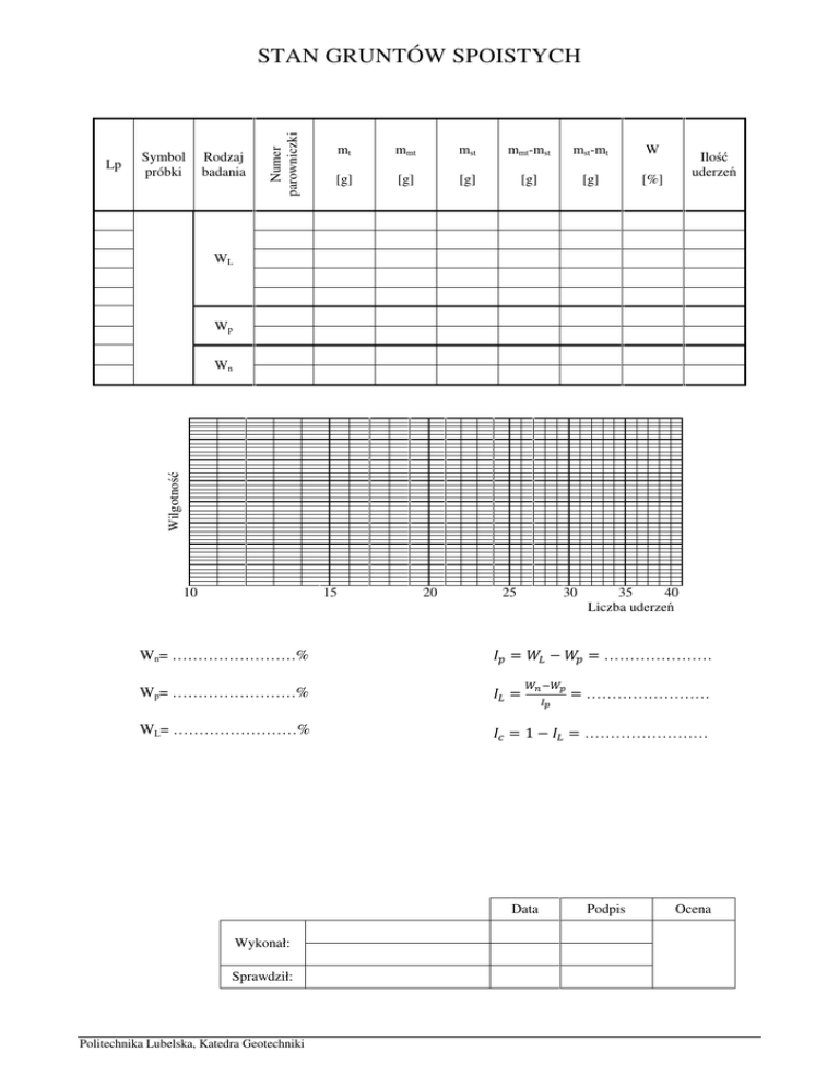 Lp Symbol próbki Rodzaj badania Numer parowniczki STAN GRUNTÓW SPOISTYCH mt mmt mst mmt-mst mst-mt W [g] [g] [g] [g] [g] [%] Ilość uderzeń WL Wp Wilgotność Wn 10 15 20 25 30 35 40 Liczba uderzeń Wn= ……………………% ܫ = ܹ − ܹ = ………………… Wp= ……………………% ܫ = WL= ……………………% ܫ = 1 − ܫ = …………………… ௐ ିௐ Data Wykonał: Sprawdził: Politechnika Lubelska, Katedra Geotechniki ூ = …………………… Podpis Ocena