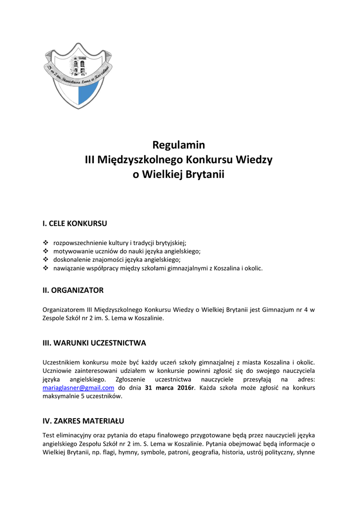 Regulamin III Międzyszkolnego Konkursu Wiedzy o Wielkiej Brytanii I. CELE KONKURSU rozpowszechnienie kultury i tradycji brytyjskiej; motywowanie uczniów do nauki języka angielskiego; doskonalenie znajomości języka angielskiego; nawiązanie współpracy między szkołami gimnazjalnymi z Koszalina i okolic. II. ORGANIZATOR Organizatorem III Międzyszkolnego Konkursu Wiedzy o Wielkiej Brytanii jest Gimnazjum nr 4 w Zespole Szkół nr 2 im. S. Lema w Koszalinie. III. WARUNKI UCZESTNICTWA Uczestnikiem konkursu może być każdy uczeń szkoły gimnazjalnej z miasta Koszalina i okolic. Uczniowie zainteresowani udziałem w konkursie powinni zgłosić się do swojego nauczyciela języka angielskiego. Zgłoszenie uczestnictwa nauczyciele przesyłają na adres: [email protected] do dnia 31 marca 2016r. Każda szkoła może zgłosić na konkurs maksymalnie 5 uczestników. IV. ZAKRES MATERIAŁU Test eliminacyjny oraz pytania do etapu finałowego przygotowane będą przez nauczycieli języka angielskiego Zespołu Szkół nr 2 im. S. Lema w Koszalinie. Pytania obejmować będą informacje o Wielkiej Brytanii, np. flagi, hymny, symbole, patroni, geografia, historia, ustrój polityczny, słynne budowle i miejsca, słynne osoby, święta i tradycje, pop kultura oraz inne zagadnienia dotyczące życia codziennego w tym kraju. V. ZASADY I PRZEBIEG KONKURSU Konkurs składać się będzie z dwóch etapów: eliminacji oraz finału. Pytania w obu etapach będą sformułowane w języku angielskim. Etap 1. Eliminacje przeprowadzone będą w Zespole Szkół nr 2 im. S. Lema w Koszalinie dnia 8 kwietnia 2016r. o godz. 12:00. Czas trwania eliminacji to 45 minut. Nazwiska 10 najlepszych uczniów podane zostaną na stronie internetowej szkoły www.zs2koszalin.pl w dniu 12.04.2016r. Etap 2. Finał konkursu odbędzie się dnia 22 kwietnia 2016r. o godz. 12:00 w Zespole Szkół nr 2 im. S. Lema w Koszalinie. Etap finałowy będzie miał formę zbliżoną do teleturnieju ‘1 z 10’. W finale bierze udział dziesięciu najlepszych uczniów wyłonionych poprzez eliminacje szkole. VI. NAGRODY Trzy najlepsze osoby otrzymają nagrody oraz dyplomy. Każdy uczestnik etapu finałowego otrzyma dyplom uczestnictwa w konkursie. VII. JURY Nad prawidłowością przebiegu etapu finałowego czuwać będzie jury w składzie trzech nauczycieli języka angielskiego z Zespołu Szkół nr 2 im. S. Lema w Koszalinie. VIII. POSTANOWIENIA KOŃCOWE Informacje na temat konkursu będą zamieszczone na stronie internetowej szkoły: www.zs2koszalin.pl Organizator zastrzega sobie prawo do zmian w regulaminie, o czym uczestnicy zostaną powiadomieni.