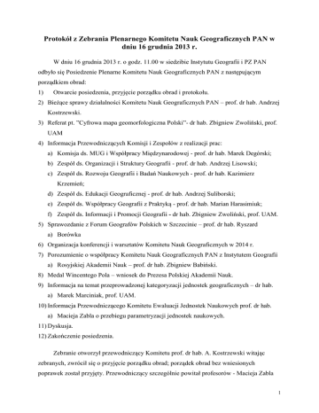 Protokół z Zebrania Plenarnego Komitetu Nauk Geograficznych PAN w dniu 16 grudnia 2013 r. W dniu 16 grudnia 2013 r. o godz. 11.00 w siedzibie Instytutu Geografii i PZ PAN odbyło się Posiedzenie Plenarne Komitetu Nauk Geograficznych PAN z następującym porządkiem obrad: 1) Otwarcie posiedzenia, przyjęcie porządku obrad i protokołu. 2) Bieżące sprawy działalności Komitetu Nauk Geograficznych PAN – prof. dr hab. Andrzej Kostrzewski. 3) Referat pt. ”Cyfrowa mapa geomorfologiczna Polski”- dr hab. Zbigniew Zwoliński, prof. UAM 4) Informacja Przewodniczących Komisji i Zespołów z realizacji prac: a) Komisja ds. MUG i Współpracy Międzynarodowej - prof. dr hab. Marek Degórski; b) Zespół ds. Organizacji i Struktury Geografii - prof. dr hab. Andrzej Lisowski; c) Zespół ds. Rozwoju Geografii i Badań Naukowych - prof. dr hab. Kazimierz Krzemień; d) Zespół ds. Edukacji Geograficznej - prof. dr hab. Andrzej Suliborski; e) Zespół ds. Współpracy Geografii z Praktyką - prof. dr hab. Marian Harasimiuk; f) Zespół ds. Informacji i Promocji Geografii - dr hab. Zbigniew Zwoliński, prof. UAM. 5) Sprawozdanie z Forum Geografów Polskich w Szczecinie – prof. dr hab. Ryszard a) Borówka 6) Organizacja konferencji i warsztatów Komitetu Nauk Geograficznych w 2014 r. 7) Porozumienie o współpracy Komitetu Nauk Geograficznych PAN z Instytutem Geografii a) Rosyjskiej Akademii Nauk – prof. dr hab. Zbigniew Babiński. 8) Medal Wincentego Pola – wniosek do Prezesa Polskiej Akademii Nauk. 9) Informacja na temat przeprowadzonej kategoryzacji jednostek geograficznych – dr hab. a) Marek Marciniak, prof. UAM. 10) Informacja Przewodniczącego Komitetu Ewaluacji Jednostek Naukowych prof. dr hab. a) Macieja Zabla o przebiegu parametryzacji jednostek naukowych. 11) Dyskusja. 12) Zakończenie posiedzenia. Zebranie otworzył przewodniczący Komitetu prof. dr hab. A. Kostrzewski witając zebranych, zwrócił się o przyjęcie porządku obrad; porządek obrad bez wniesionych poprawek został przyjęty. Przewodniczący szczególnie powitał profesorów - Macieja Zabla 1 przewodniczącego Komisji ds. Ewaluacji Jednostek Naukowych oraz Marka Marciniaka z Wydziału Nauk Geograficznych i Geologicznych UAM. Nieobecność w posiedzeniu usprawiedliwili profesorowie J. Jania, A. Jankowski oraz P. Migoń. Równocześnie przewodniczący zaznaczył, że na plenarnym posiedzeniu jest wymagane quorum i wszystkie uchwały są prawomocne. Z kolei przewodniczący podkreślił, że posiedzenie komitetu odbywa się w szczególnym okresie dla polskiej geografii spowodowanym: zmianą Ministra Nauki i Szkolnictwa Wyższego, nową kadencją Centralnej Komisji ds. Stopni i Tytułów, zakończeniem parametryzacji jednostek geograficznych, posiedzeniem kierowników jednostek geograficznych, zorganizowanym Forum Geografów w Szczecinie, a także ograniczonymi środkami finansowymi na badania podstawowe. Następnie przewodniczący zwrócił się do zebranych o uczczenie chwilą ciszy pamięć zmarłych Profesorów – Władysława Matuszkiewicza i Wojciecha Froehlicha podkreślając ich wkład - odpowiednio do polskiej botaniki i geografii fizycznej, a także do nauki światowej. Bieżące sprawy komitetu załatwiano w ramach prac sekretariatu (prof. A. Kostrzewski, dr hab. E. Roo-Zielińska, J. Więckowska), które odbyły się w dniach 30 07 2013; 12 09 2013; 22 11 2013; 25 11 2013; 26 11 2013; 5 12 2013. Prezydium odbyło się dwukrotnie 26 czerwca i 25 października 2013. Podstawą wymiany poglądów dotyczących rozwoju geografii w Polsce była Konferencja Kierowników Jednostek Geograficznych, która odbyła się w dniach 4-5 11 2013 roku w Kielcach. W dniu 6 listopada 2013 roku odbyło się spotkanie przewodniczącego KNG prof. A. Kostrzewskiego, dyrektora IG i PZPAN prof. M. Degórskiego oraz sekretarza KNG dr hab. E. Roo-Zielińskiej z przewodniczącym Komitetu Ewaluacji Jednostek Naukowych prof. M. Zablem w sprawie zasad kategoryzacji jednostek geograficznych. Następnie prof. A. Kostrzewski przedstawił list prof. A. Jackowskiego, przewodniczącego PTG zawierający propozycję wspólnej organizacji z Komitetem Nauk Geograficznych Zjazdu Geografów Polskich w Lublinie w czerwcu 2015 roku – propozycja została przyjęta w formie uchwały. Członkowie Komitetu zaakceptowali wspólną organizację zjazdu. Przewodniczący przedstawił list od Ministra Dziekońskiego o deklaracji stałej współpracy z Komitetem Nauk Geograficznych. Prof. A. Kostrzewski przypomniał kierunki działalności Komitetu na lata 2011-2015, podkreślając, że zdecydowana większość z nich została zrealizowana. Zwrócił się z prośbą do 2 przedstawicieli jednostek geograficznych o przesyłanie ankiet dotyczących stanu geografii w Polsce w latach 2009-2013, której wyniki będą podstawą opracowania raportu na konferencję MUG w Krakowie. Przewodniczący poinformował, że Komitet Nauk Geograficznych popiera inicjatywę Wydziału Oceanografii i Geografii Uniwersytetu Gdańskiego dotyczącą włączenia dyscypliny Ochrona Środowiska do dziedziny Nauk o Ziemi i powołania dyscypliny gospodarka przestrzenna oraz przypisanie odpowiedniego miejsca kierunkowi ochrona środowiska . Z kolei dr hab. E. Roo-Zielińska przedstawiła propozycję prof. A. Żelaźniewicza powołania Sekcji Nauk o Ziemi w ramach Wydziału III PAN. Prof. A. Kostrzewski poinformował, że Komitet Nauk Geograficznych patronuje przygotowywanemu Słownikowi Geograficznemu Polsko-Ukraińskiemu, który zawierać będzie podstawowe terminy i pojęcia z zakresu nauki o krajobrazie, współinicjatorem jest Komitet Nauk Geograficznych PAN oraz Akademia Nauk Ukrainy. Przewodniczący komitetu przedstawił założenia organizacji Ogólnopolskego Dnia Geografa w dniu 23 kwietnia 2014 roku. Centralne obchody odbędą się w Warszawie, a organizatorem będzie Wydział Geografii i Studiów Regionalnych UW (prof. dr hab. Andrzej Lisowski). Do połowy grudnia przedstawio
