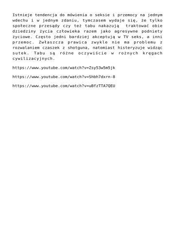Istnieje tendencja do mówienia o seksie i przemocy na jednym wdechu i w jednym zdaniu, tymczasem wydaje się, że tylko społeczne przesądy czy też tabu nakazują traktować obie dziedziny życia człowieka razem jako agresywne podniety życiowe. Często jedni bardziej akceptują w TV seks, a inni przemoc. Zwłaszcza prawica zwykle nie ma problemu z rozwalaniem czaszek z shotguna, natomiast histeryzuje widząc sutek. Tabu są różne oczywiście w rożnych kręgach cywilizacyjnych. https://www.youtube.com/watch?v=Zsy53w5m5jk https://www.youtube.com/watch?v=Shbh7dxrn-8 https://www.youtube.com/watch?v=uBfzTTA7QEU