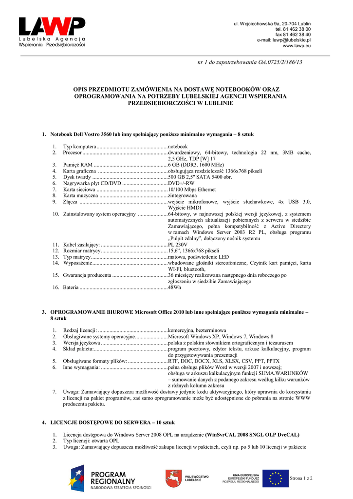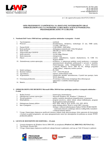 ul. Wojciechowska 9a, 20-704 Lublin tel. 81 462 38 00 fax 81 462 38 40 e-mail: [email protected] www.lawp.eu nr 1 do zapotrzebowania OA.0725/2/186/13 OPIS PRZEDMIOTU ZAMÓWIENIA NA DOSTAWĘ NOTEBOOKÓW ORAZ OPROGRAMOWANIA NA POTRZEBY LUBELSKIEJ AGENCJI WSPIERANIA PRZEDSIĘBIORCZOŚCI W LUBLINIE 1. Notebook Dell Vostro 3560 lub inny spełniający poniższe minimalne wymagania – 8 sztuk 1. 2. 3. 4. 5. 6. 7. 8. 9. 10. 11. 12. 13. 14. 15. 16. Typ komputera .................................................. notebook Procesor ............................................................ dwurdzeniowy, 64-bitowy, technologia 22 nm, 3MB cache, 2,5 GHz, TDP [W] 17 Pamięć RAM .................................................... 6 GB (DDR3, 1600 MHz) Karta graficzna ................................................. obsługująca rozdzielczość 1366x768 pikseli Dysk twardy ..................................................... 500 GB 2,5" SATA 5400 obr. Nagrywarka płyt CD/DVD ................................ DVD+/-RW Karta sieciowa .................................................. 10/100 Mbps Ethernet Karta muzyczna ................................................ zintegrowana Złącza .............................................................. wejście mikrofonowe, wyjście słuchawkowe, 4x USB 3.0, Wyjście HMDI Zainstalowany system operacyjny ..................... 64-bitowy, w najnowszej polskiej wersji językowej, z systemem automatycznych aktualizacji pobieranych z serwera w siedzibie Zamawiającego, pełna kompatybilność z Active Directory w ramach Windows Server 2003 R2 PL, obsługa programu „Pulpit zdalny”, dołączony nośnik systemu Kabel zasilający: ............................................... PL 230V Rozmiar matrycy ............................................... 15,6”, 1366x768 pikseli Typ matrycy ...................................................... matowa, podświetlenie LED Wyposażenie ..................................................... wbudowane głośniki stereofoniczne, Czytnik kart pamięci, karta WI-FI, bluetooth, Gwarancja producenta ....................................... 36 miesięcy realizowana następnego dnia roboczego po zgłoszeniu w siedzibie Zamawiającego Bateria .............................................................. 48Wh 3. OPROGRAMOWANIE BIUROWE Microsoft Office 2010 lub inne spełniające poniższe wymagania minimalne – 8 sztuk 1. 2. 3. 4. 5. 6. 7. Rodzaj licencji: ................................................. komercyjna, bezterminowa Obsługiwane systemy operacyjne ....................... Microsoft Windows XP, Windows 7, Windows 8 Wersja językowa ............................................... polska z polskim słownikiem ortograficznym i tezaurusem Skład pakietu:.................................................... program pocztowy, edytor tekstu, arkusz kalkulacyjny, program do przygotowywania prezentacji Obsługiwane formaty plików: ............................ RTF, DOC, DOCX, XLS, XLSX, CSV, PPT, PPTX Inne wymagania: ............................................... pełna obsługa plików Word w wersji 2007 i nowszej; obsługa w arkuszu kalkulacyjnym funkcji SUMA.WARUNKÓW – sumowanie danych z podanego zakresu według kilku warunków z różnych kolumn zakresu Uwaga: Zamawiający dopuszcza możliwość dostawy jedynie kodu aktywacyjnego, który uprawnia do korzystania z licencji na pakiet programów, zaś samo oprogramowanie może być udostępnione do pobrania na stronie WWW producenta pakietu. 4. LICENCJE DOSTĘPOWE DO SERWERA – 10 sztuk 1. 2. 3. Licencja dostępowa do Windows Server 2008 OPL na urządzenie (WinSvrCAL 2008 SNGL OLP DvcCAL) Typ licencji: otwarta OPL Uwaga: Zamawiający dopuszcza możliwość zakupu licencji w pakietach, czyli np. po 5 lub 10 licencji w pakiecie Strona 1 z 2 ul. Wojciechowska 9a, 20-704 Lublin tel. 81 462 38 00 fax 81 462 38 40 e-mail: [email protected] www.lawp.eu 4. Zamawiający jest samorządową jednostką organizacyjną i w związku z tym możliwa jest dostawa licencji typu GOV – o ile warunki takiej licencji dopuszczają jednostkę tego typu. 5. INNE MINIMALNE WYMAGANIA DLA DOSTAWY ZESTAWÓW KOMPUTEROWYCH, OPROGRAMOWANIA ORAZ ZASILACZY AWARYJNYCH 1. 2. Notebooki powinny być objęte gwarancją producenta na okres minimum 36 miesięcy z naprawą w następny dniu roboczym w siedzibie Zamawiającego. Termin i sposób realizacji dostawy przez Wykonawcę: a) Termin realizacji dostawy: do dnia 13 grudnia 2013 r. w godzinach od 8:00 do 15:00. b) Dostawa do siedziby Zamawiającego na terenie Lublina. Powyższe czynności Wykonawca powinien wykonać w ramach własnych zasobów ludzkich i sprzętowych z uwzględnieniem konieczności dostawy w godzinach pracy Zamawiającego. Zamawiający dopuszcza dostawę realizowaną za pomocą firm spedycyjnych. Strona 2 z 2