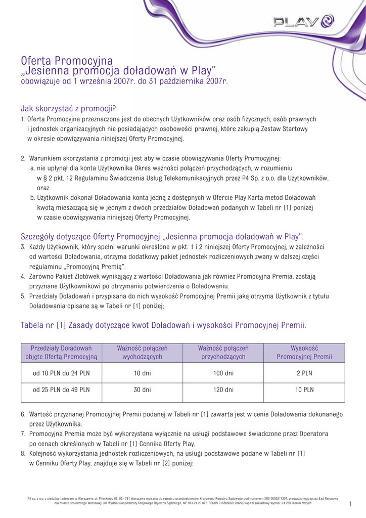 Oferta Promocyjna „Jesienna promocja doładowań w Play” obowiązuje od 1 września 2007r. do 31 października 2007r. Jak skorzystać z promocji? 1. Oferta Promocyjna przeznaczona jest do obecnych Użytkowników oraz osób fizycznych, osób prawnych i jednostek organizacyjnych nie posiadających osobowości prawnej, które zakupią Zestaw Startowy w okresie obowiązywania niniejszej Oferty Promocyjnej. 2. Warunkiem skorzystania z promocji jest aby w czasie obowiązywania Oferty Promocyjnej: a. nie upłynął dla konta Użytkownika Okres ważności połączeń przychodzących, w rozumieniu w § 2 pkt. 12 Regulaminu Świadczenia Usług Telekomunikacyjnych przez P4 Sp. z o.o. dla Użytkowników, oraz b. Użytkownik dokonał Doładowania konta jedną z dostępnych w Ofercie Play Karta metod Doładowań kwotą mieszczącą się w jednym z dwóch przedziałów Doładowań podanych w Tabeli nr [1] poniżej w czasie obowiązywania niniejszej Oferty Promocyjnej. Szczegóły dotyczące Oferty Promocyjnej „Jesienna promocja doładowań w Play”. 3. Każdy Użytkownik, który spełni warunki określone w pkt. 1 i 2 niniejszej Oferty Promocyjnej, w zależności od wartości Doładowania, otrzyma dodatkowy pakiet jednostek rozliczeniowych zwany w dalszej części regulaminu „Promocyjną Premią”. 4. Zarówno Pakiet Złotówek wynikający z wartości Doładowania jak również Promocyjna Premia, zostają przyznane Użytkownikowi po otrzymaniu potwierdzenia o Doładowaniu. 5. Przedziały Doładowań i przypisana do nich wysokość Promocyjnej Premii jaką otrzyma Użytkownik z tytułu Doładowania opisane są w Tabeli nr [1] poniżej; Tabela nr [1] Zasady dotyczące kwot Doładowań i wysokości Promocyjnej Premii. Przedziały Doładowań objęte Ofertą Promocyjną Ważność połączeń wychodzących Ważność połączeń przychodzących Wysokość Promocyjnej Premii od 10 PLN do 24 PLN 10 dni 100 dni 2 PLN od 25 PLN do 49 PLN 30 dni 120 dni 10 PLN 6. Wartość przyznanej Promocyjnej Premii podanej w Tabeli nr [1] zawarta jest w cenie Doładowania dokonanego przez Użytkownika. 7. Promocyjna Premia może być wykorzystana wyłącznie na usługi podstawowe świadczone przez Operatora po cenach określonych w Tabeli nr [1] Cennika Oferty Play. 8. Kolejność wykorzystania jednostek rozliczeniowych, na usługi podstawowe podane w Tabeli nr [1] w Cenniku Oferty Play, znajduje się w Tabeli nr [2] poniżej: P4 sp. z o.o. z siedzibą i adresem w Warszawie, ul. Pileckiego 63, 02 - 781 Warszawa wpisana do rejestru przedsiębiorców Krajowego Rejestru Sądowego pod numerem KRS 0000217207, prowadzonego przez Sąd Rejonowy dla miasta stołecznego Warszawy, XIII Wydział Gospodarczy Krajowego Rejestru Sądowego, NIP 951-21-20-077, REGON 015808609, której kapitał zakładowy wynosi: 24 250 000,00 złotych 1 Tabela nr [2] Kolejność wykorzystania jednostek rozliczeniowych na usługi podstawowe w Ofercie Play. Kolejność Jednostki rozliczeniowe 1. Minuty przyznane w ramach usługi Zbieraj Minuty oraz przyznane w wyniku uczestnictwa w promocjach:minuty, SMS-y, MMS-y, pakiety na przesyłanie danych Jednostki rozliczeniowe przyznane w ramach Promocyjnej Premii, Premii z tytułu doładowań Jednostki rozliczeniowe zawarte w Pakiecie Złotówek 2. 3. 9. Z zastrzeżeniem postanowień pkt. 10 poniżej, Promocyjna Premia jest ważna przez 30 dni kalendarzowych od daty Doładowania. 10. Każde Doładowanie, w związku z którym przysługuje Promocyjna Premia, dokonane przed upływem terminu ważności aktualnie przysługującej Promocyjnej Premii, powoduje zwiększenie dotychczasowej Promocyjnej Premii o przyznaną kwotę wynikającą z nowego Doładowania, a data ważności Promocyjnej Premii jest liczona od daty nowego Doładowania. 11. Po przekroczeniu Okresu ważności połączeń przychodzących określonego w Tabeli nr [1] niniejszej Oferty Promocyjnej, Użytkownik traci Promocyjną Premię i niewykorzystaną wartość Pakietu Złotówek. Dodatkowe informacje 12. Skorzystanie z niniejszej Oferty Promocyjnej nie wyklucza korzystania z innych Ofert Promocyjnych dostępnych łącznie z Ofertą Play Karta, chyba, że warunki innych Ofert Promocyjnych stanowią inaczej. 13. Operator zastrzega sobie prawo do wycofania Oferty Promocyjnej „Jesienna promocja doładowań w Play” w każdym czasie bez podawania przyczyny. 14. Niniejsze warunki Oferty Promocyjnej są dostępne na stronie internetowej www.playmobile.pl 15. Wszelkie wyrazy lub wyrażenia pisane w treści regulaminu niniejszej Oferty Promocyjnej z dużej litery należy rozumieć zgodnie z ich definicją zawartą w Regulaminie Świadczenia Usług Telekomunikacyjnych przez P4 sp. z o.o. dla Użytkowników oraz Cennikiem Oferty Play, chyba że treść niniejszej oferty stanowi inaczej. 16. W sprawach nieuregulowanych treścią regulaminu niniejszej Oferty Promocyjnej stosują się postanowienia Oferty Play Karta zawarte w Cenniku Oferty Play. 17. W przypadku rozbieżności pomiędzy postanowieniami niniejszej Oferty Promocyjnej a postanowieniami Cennika Oferty Play lub Regulaminu Świadczenia Usług Telekomunikacyjnych przez P4 Sp. z o.o. dla Użytkowników, postanowienia niniejszej Oferty Promocyjnej będą miały charakter nadrzędny. 18. Wszystkie ceny podane w niniejszym dokumencie podane są w złotych polskich (PLN) i zawierają podatek od towarów i usług (VAT), o ile nie wskazano inaczej. 2 P4 sp. z o.o. z siedzibą i adresem w Warszawie, ul. Pileckiego 63, 02 - 781 Warszawa wpisana do rejestru przedsiębiorców Krajowego Rejestru Sądowego pod numerem KRS 0000217207, prowadzonego przez Sąd Rejonowy dla miasta stołecznego Warszawy, XIII Wydział Gospodarczy Krajowego Rejestru Sądowego, NIP 951-21-20-077, REGON 015808609, której kapitał zakładowy wynosi: 24 250 000,00 złotych