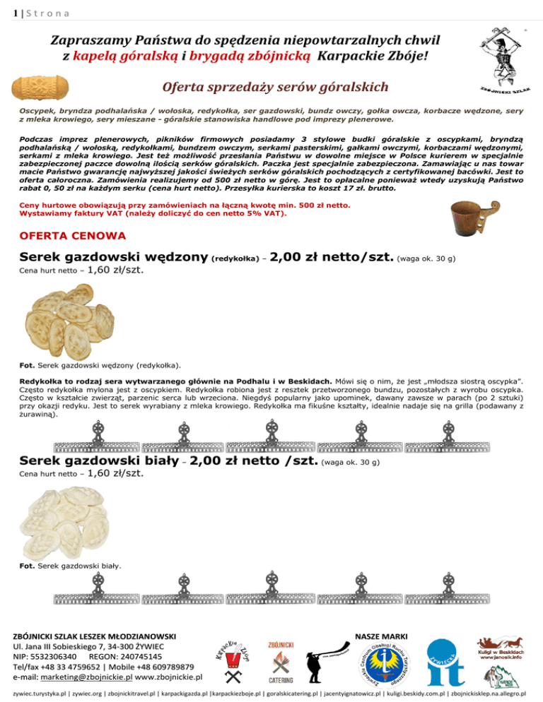 1|Strona Zapraszamy Państwa do spędzenia niepowtarzalnych chwil z kapelą góralską i brygadą zbójnicką Karpackie Zbóje! Oferta sprzedaży serów góralskich Oscypek, bryndza podhalańska / wołoska, redykołka, ser gazdowski, bundz owczy, gołka owcza, korbacze wędzone, sery z mleka krowiego, sery mieszane - góralskie stanowiska handlowe pod imprezy plenerowe. Podczas imprez plenerowych, pikników firmowych posiadamy 3 stylowe budki góralskie z oscypkami, bryndzą podhalańską / wołoską, redykołkami, bundzem owczym, serkami pasterskimi, gałkami owczymi, korbaczami wędzonymi, serkami z mleka krowiego. Jest też możliwość przesłania Państwu w dowolne miejsce w Polsce kurierem w specjalnie zabezpieczonej paczce dowolną ilością serków góralskich. Paczka jest specjalnie zabezpieczona. Zamawiając u nas towar macie Państwo gwarancję najwyższej jakości świeżych serków góralskich pochodzących z certyfikowanej bacówki. Jest to oferta całoroczna. Zamówienia realizujemy od 500 zł netto w górę. Jest to opłacalne ponieważ wtedy uzyskują Państwo rabat 0, 50 zł na każdym serku (cena hurt netto). Przesyłka kurierska to koszt 17 zł. brutto. Ceny hurtowe obowiązują przy zamówieniach na łączną kwotę min. 500 zł netto. Wystawiamy faktury VAT (należy doliczyć do cen netto 5% VAT). OFERTA CENOWA Serek gazdowski wędzony (redykołka) – 2,00 zł netto/szt. (waga ok. 30 g) Cena hurt netto – 1,60 zł/szt. Fot. Serek gazdowski wędzony (redykołka). Redykołka to rodzaj sera wytwarzanego głównie na Podhalu i w Beskidach. Mówi się o nim, że jest „młodsza siostrą oscypka”. Często redykołka mylona jest z oscypkiem. Redykołka robiona jest z resztek przetworzonego bundzu, pozostałych z wyrobu oscypka. Często w kształcie zwierząt, parzenic serca lub wrzeciona. Niegdyś popularny jako upominek, dawany zawsze w parach (po 2 sztuki) przy okazji redyku. Jest to serek wyrabiany z mleka krowiego. Redykołka ma fikuśne kształty, idealnie nadaje się na grilla (podawany z żurawiną). Serek gazdowski biały – 2,00 zł netto /szt. (waga ok. 30 g) Cena hurt netto – 1,60 zł/szt. Fot. Serek gazdowski biały. ZBÓJNICKI SZLAK LESZEK MŁODZIANOWSKI Ul. Jana III Sobieskiego 7, 34-300 ŻYWIEC NIP: 5532306340 REGON: 240745145 Tel/fax +48 33 4759652 | Mobile +48 609789879 e-mail: [email protected] www.zbojnickie.pl NASZE MARKI zywiec.turystyka.pl | zywiec.org | zbojnickitravel.pl | karpackigazda.pl |karpackiezboje.pl | goralskicatering.pl | jacentyignatowicz.pl | kuligi.beskidy.com.pl | zbojnickisklep.na.allegro.pl 2|Strona Gołka mała – 7,00 zł netto /szt. (waga ok. 110 g) Cena hurt netto – 5,50 zł/szt. Fot. Gołka mała. Gołka średnia wędzona/nie wędzona (biała) – 11 zł netto/szt. (waga ok. 200 g) Cena hurt netto – 8,00 zł/szt. Gołka duża wędzona/nie wędzona (biała) – 15 zł netto/szt. (waga ok. 270 g) Cena hurt netto – 11,00 zł/szt. Fot. Gołka średnia / duża. Gołka to tradycyjna nazwa wędzonego, krowiego sera produkowanego w sposób zbliżony do oscypka, który produkowany jest z mleka owczego. Czasami jest on mylony z oscypkiem ze względu na stosowanie podobnych form (oscypek - wrzecionowaty, gołka walcowata), jednak smak obu serów jest zupełnie inny. Produkowany był przez górali w dawnych czasach w okresie jesienno-zimowym, kiedy owiec nie dojono. Korbacze w wiązkach po ok. 10 dkg wędzone i nie wędzone po 6 zł netto/wiązka Cena hurt netto– 4,00 zł biały, 4,50 zł wędzony Korbacze zwijane wędzone (waga ok. 15 gram) -1,50 zł netto / szt. Cena hurt netto – 1,20 zł/szt. Fot. Korbacze w wiązkach białe / wędzone. Korboc to rodzaj sera góralskiego produkowany z mleka krowiego. Jego historia sięga blisko dwustu lat. Kształtem przypomina długie nitki makaronu, najczęściej splecione w warkocz lub wiązki. Smak ma łagodny, mniej słony niż oscypek, nie jest też tak twardy. Bardzo często podawany jako zakąska na góralskich weselach, stanowi też dodatek wielu sałatek i innych potraw. Jest to idealna przekąska do piwa. Można spotkać korbacze wędzone o ciemnobrązowej barwie oraz całkiem jasne, niewędzone. ZBÓJNICKI SZLAK LESZEK MŁODZIANOWSKI Ul. Jana III Sobieskiego 7, 34-300 ŻYWIEC NIP: 5532306340 REGON: 240745145 Tel/fax +48 33 4759652 | Mobile +48 609789879 e-mail: [email protected] www.zbojnickie.pl NASZE MARKI zywiec.turystyka.pl | zywiec.org | zbojnickitravel.pl | karpackigazda.pl |karpackiezboje.pl | goralskicatering.pl | jacentyignatowicz.pl | kuligi.beskidy.com.pl | zbojnickisklep.na.allegro.pl 3|Strona Oscypek tradycyjny – 37 zł netto /szt. (waga ok. 600-750 gram) Dostępny od maja do października – cena hurt netto 32 zł/szt. netto Fot. Oscypek tradycyjny. Oscypek, oszczypek to twardy wędzony ser przygotowywany z mleka owczego, charakterystyczny dla polskich gór, szczególnie Podhala, Pienin i Beskidów. W smaku jest nieco pikantny, lekko słonawy i posiada aromat dymu z ogniska. Produkowany w postaci niedużych, wrzecionowatych bloków z typowym dla regionu zdobieniem brzegów. Zdobienie odciskane jest w rozszczepialnej drewnianej foremce, tzw. "oscypiorce". Właśnie od scypania (rozszczepiania) tych foremek pochodzi najprawdopodobniej nazwa sera: gwarowe uozscypek (uproszczone następnie do uoscypek) można przetłumaczyć jako rozszczepek. Tradycyjnie jego wyrobem trudnią się bacowie na hali. Po wydojeniu owiec do drewnianego skopka – "gielety" mleko zlewane jest przez lniane płótno (w ten sposób odcedza się np. źdźbła trawy itp.) do drewnianej "puciery" (rodzaj kadzi). Następnie należy dodać "klog" (wysuszoną i sproszkowaną podpuszczkę), dzięki temu z mleka powstaje masa serowa, którą należy odcisnąć i uformować. Podczas odciskania ser maczany jest w gorącej wodzie. Po uformowaniu sera moczy się go przez dobę w solance – "rosole", która usuwa z niego nadmiar wody w procesie osmozy (kąpiel ma też własności bakteriobójcze). 