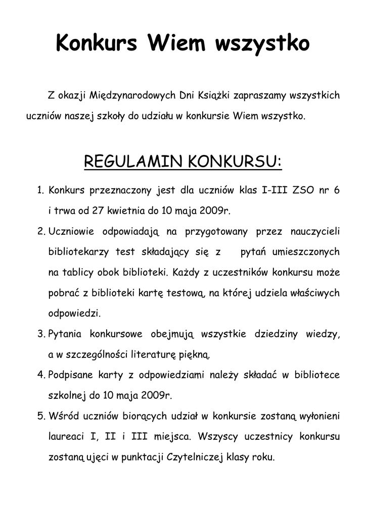 Konkurs Wiem wszystko Z okazji Międzynarodowych Dni Książki zapraszamy wszystkich uczniów naszej szkoły do udziału w konkursie Wiem wszystko. REGULAMIN KONKURSU: 1. Konkurs przeznaczony jest dla uczniów klas I-III ZSO nr 6 i trwa od 27 kwietnia do 10 maja 2009r. 2. Uczniowie odpowiadają na przygotowany przez nauczycieli bibliotekarzy test składający się z pytań umieszczonych na tablicy obok biblioteki. Każdy z uczestników konkursu może pobrać z biblioteki kartę testową, na której udziela właściwych odpowiedzi. 3. Pytania konkursowe obejmują wszystkie dziedziny wiedzy, a w szczególności literaturę piękną. 4. Podpisane karty z odpowiedziami należy składać w bibliotece szkolnej do 10 maja 2009r. 5. Wśród uczniów biorących udział w konkursie zostaną wyłonieni laureaci I, II i III miejsca. Wszyscy uczestnicy konkursu zostaną ujęci w punktacji Czytelniczej klasy roku.