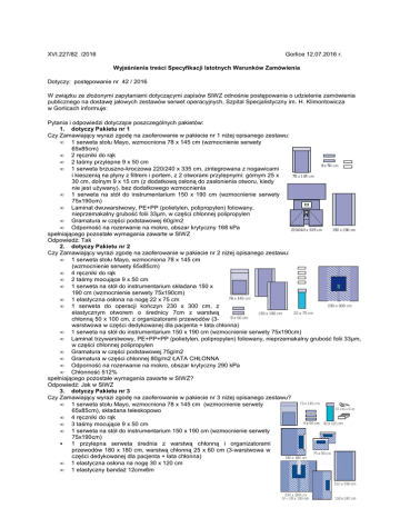 XVI.227/82 /2016 Gorlice 12.07.2016 r. Wyjaśnienia treści Specyfikacji Istotnych Warunków Zamówienia Dotyczy: postępowanie nr 42 / 2016 W związku ze złożonymi zapytaniami dotyczącymi zapisów SIWZ odnośnie postępowania o udzielenie zamówienia publicznego na dostawę jałowych zestawów serwet operacyjnych, Szpital Specjalistyczny im. H. Klimontowicza w Gorlicach informuje: Pytania i odpowiedzi dotyczące poszczególnych pakietów: 1. dotyczy Pakietu nr 1 Czy Zamawiający wyrazi zgodę na zaoferowanie w pakiecie nr 1 niżej opisanego zestawu: • 1 serweta stołu Mayo, wzmocniona 78 x 145 cm (wzmocnienie serwety 65x85cm) • 2 ręczniki do rąk • 2 taśmy przylepne 9 x 50 cm • 1 serweta brzuszno-kroczowa 220/240 x 335 cm, zintegrowana z nogawicami i kieszenią na płyny z filtrem i portem, z 2 otworami przylepnymi: górnym 25 x 30 cm, dolnym 9 x 15 cm (z dodatkową osłoną do zasłonienia otworu, kiedy nie jest używany), bez dodatkowego wzmocnienia • 1 serweta na stół do instrumentarium 150 x 190 cm (wzmocnienie serwety 75x190cm) • Laminat dwuwarstwowy, PE+PP (polietylen, polipropylen) foliowany, nieprzemakalny grubość folii 33µm, w części chłonnej polipropylen • Gramatura w części podstawowej 60g/m2 • Odporność na rozerwanie na mokro, obszar krytyczny 168 kPa spełniającego pozostałe wymagania zawarte w SIWZ Odpowiedź: Tak 2. dotyczy Pakietu nr 2 Czy Zamawiający wyrazi zgodę na zaoferowanie w pakiecie nr 2 niżej opisanego zestawu: • 1 serweta stołu Mayo, wzmocniona 78 x 145 cm (wzmocnienie serwety 65x85cm) • 4 ręczniki do rąk • 2 taśmy mocujące 9 x 50 cm • 1 serweta na stół do instrumentarium składana 150 x 190 cm (wzmocnienie serwety 75x190cm) • 1 elastyczna osłona na nogę 22 x 75 cm • 1 serweta do operacji kończyn 230 x 300 cm, z elastycznym otworem o średnicy 7cm z warstwą chłonną 50 x 100 cm, z organizatorami przewodów (3warstwowa w części dedykowanej dla pacjenta + łata chłonna) • 1 serweta na stół do instrumentarium 150 x 190 cm (wzmocnienie serwety 75x190cm) • Laminat trzywarstwowy, PE+PP+PP (polietylen, polipropylen) foliowany, nieprzemakalny grubość folii 33µm, w części chłonnej polipropylen • Gramatura w części podstawowej 75g/m2 • Gramatura w części chłonnej 80g/m2 ŁATA CHŁONNA • Odporność na rozerwanie na mokro, obszar krytyczny 290 kPa • Chłonność 512% spełniającego pozostałe wymagania zawarte w SIWZ? Odpowiedź: Jak w SIWZ 3. dotyczy Pakietu nr 3 Czy Zamawiający wyrazi zgodę na zaoferowanie w pakiecie nr 3 niżej opisanego zestawu? • 1 serweta stołu Mayo, wzmocniona 78 x 145 cm (wzmocnienie serwety 65x85cm), składana teleskopowo • 4 ręczniki do rąk • 3 taśmy mocujące 9 x 50 cm • 1 serweta na stół do instrumentarium 150 x 190 cm (wzmocnienie serwety 75x190cm) • 1 przylepna serweta średnia z warstwą chłonną i organizatorami przewodów 180 x 180 cm, warstwą chłonną 25 x 60 cm (3-warstwowa w części dedykowanej dla pacjenta + łata chłonna) • 1 elastyczna osłona na nogę 30 x 120 cm • 1 elastyczny bandaż 12cmx6m 1 • • 2 przylepne serwety 75 x 90 cm z warstwą chłonną 25 x 60 cm (3-warstwowe na całej powierzchni) 1 serweta z wycięciem „U” z warstwą chłonną i organizatorami przewodów, 230x260cm, wycięcie 20 x 100 cm, warstwa chłonna 75 x 140 cm (3-warstwowa w części dedykowanej dla pacjenta + łata chłonna) • 1 serweta przylepna duża 150x240cm z warstwą chłonną 25 x 60 cm i organizatorami przewodów (3warstwowa w części dedykowanej dla pacjenta) • Laminat trzywarstwowy, PE+PP+PP (polietylen, polipropylen) foliowany, nieprzemakalny grubość folii 33µm, w części chłonnej polipropylen • Gramatura w części podstawowej 75g/m2 • Gramatura w części chłonnej 80g/m2 ŁATA CHŁONNA • Odporność na rozerwanie na mokro, obszar krytyczny 290 kPa • Chłonność: 512% spełniającego pozostałe wymagania zawarte w SIWZ? Odpowiedź: Jak w SIWZ 4. dotyczy Pakietu nr 4 Czy Zamawiający wyrazi zgodę na zaoferowanie w pakiecie nr 4 serwety o wymiarze 230x300cm i chłonności 512%, spełniającej pozostałe wymagania zawarte w SIWZ? Odpowiedź: Tak 5. dotyczy Pakietu nr 5 Czy Zamawiający wyrazi zgodę na zaoferowanie w pakiecie nr 5 niżej opisanego zestawu? • 1 taśma mocująca 9 x 50 cm • 1 serweta stołu Mayo, wzmocniona 78 x 145 cm (wzmocnienie serwety 65x85cm), składana teleskopowo • 2 ręczniki do rąk • 2 przylepne serwety 75 x 90 cm • 1 przylepna serweta średnia 180 x 180 cm • 1 przylepna serweta duża 150 x 240 cm • 1 serweta na stół do instrumentarium 150 x 190 cm (wzmocnienie serwety 75x190cm) spełniającego pozostałe wymagania zawarte w SIWZ? Odpowiedź: Jak w SIWZ 6. dotyczy Pakietu nr 6 Czy Zamawiający wyrazi zgodę na zaoferowanie w pakiecie nr 6 niżej opisanego zestawu? • 1 taśma mocująca 9 x 50 cm • 1 serweta stołu Mayo, wzmocniona 78 x 145 cm (wzmocnienie serwety 65x85cm), składana teleskopowo • 4 ręczniki do rąk • 2 przylepne serwety 75 x 90 cm z warstwą chłonną 15x50cm (3warstwowe na całej powierzchni + łata chłonna) • 1 przylepna serweta średnia 180 x 180 cm z warstwą chłonną 15x50cm i organizatorami przewodów (3-warstwowa w części dedykowanej dla pacjenta + łata chłonna) • 1 przylepna serweta duża 150 x 240 cm (3-warstwowa w części dedykowanej dla pacjenta) • 1 serweta na stół do instrumentarium 150 x 190 cm (wzmocnienie serwety 75x190cm) • Laminat trzywarstwowy, PE+PP+PP (polietylen, polipropylen) foliowany, nieprzemakalny grubość folii 33µm, w części chłonnej polipropylen • Gramatura w części podstawowej 75g/m2 • Gramatura w części chłonnej 80g/m2 ŁATA CHŁONNA • Odporność na rozerwanie na mokro, obszar krytyczny 290 kPa • Chłonność 512% spełniającego pozostałe wymagania zawarte w SIWZ? Odpowiedź: Jak w SIWZ 7. dotyczy Pakietu nr 7 Czy Zamawiający wyrazi zgodę na zaoferowanie w pakiecie nr