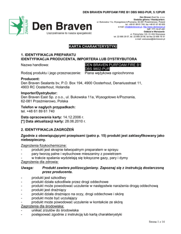DEN BRAVEN PURFOAM FIRE B1 DBS 9802-PUR, 5.12PUR Den Braven East Sp. z o.o. Siedziba główna / Headquarters: ul. Bukowska 11a, Wysogotowo k/Poznania, 62-081 Przeźmierowo, Poland tel. +48 61 89 61 740, fax +48 61 81 62 825 e-mail: [email protected], http://www.denbraven.pl NIP: 777-10-07-481 Oddział w Warszawie: ul. Połczyńska 122, 01-304 Warszawa tel. 22 666 29 57, tel. 22 666 29 58, tel./fax 22 666 16 51 e-mail: [email protected] KARTA CHARAKTERYSTYKI 1. IDENTYFIKACJA PREPARATU IDENTYFIKACJA PRODUCENTA, IMPORTERA LUB DYSTRYBUTORA Nazwa handlowa: Rodzaj produktu i jego przeznaczenie: DEN BRAVEN PURFOAM FIRE B1 DBS 9802-PUR Piana wężykowa ogniochronna Producent: Den Braven Sealants bv, P.O. Box 194, 4900 Oosterhout, Denariusstraat 11, 4903 RC Oosterhout, Holandia Importer/Dystrybutor: Den Braven East Sp. z o.o., ul. Bukowska 11a, Wysogotowo k/Poznania, 62-081 Przeźmierowo, Polska Telefon w nagłych przypadkach: tel. +48 61 89 61 740 Data opracowania karty: 14.12.2006 r. [*] Data aktualizacji karty: 28.06.2010 r. 2. IDENTYFIKACJA ZAGROŻEŃ Zgodnie z obowiązującymi przepisami (patrz p. 15) produkt jest zaklasyfikowany jako niebezpieczny. Zagrożenia fizykochemiczne: produkt jest skrajnie łatwopalnym preparatem w sprayu pary tworzą palne i wybuchowe mieszaniny z powietrzem w trakcie spalania wydzielają się toksyczne gazy, pary i dymy Zagrożenia dla zdrowia: Uwaga: Produkt zawiera poliizocyjaniany. Zapoznaj się z instrukcją dostarczoną przez producenta. produkt jest szkodliwy produkt działa szkodliwie przez drogi oddechowe produkt może powodować uczulenie w następstwie narażenia drogą oddechową produkt jest drażniący produkt działa drażniąco na oczy, drogi oddechowe i skórę produkt może być uczulający produkt może powodować uczulenie w kontakcie ze skórą Zagrożenia dla środowiska: unikać zrzutów do środowiska postępować zgodnie z instrukcją lub kartą charakterystyki Strona 1 z 14 DEN BRAVEN PURFOAM FIRE B1 DBS 9802-PUR, 5.12PUR może działać szkodliwie na środowisko wodne produkt ulega powolnej biodegradacji Inne zagrożenia: Uwaga! Pojemnik pod ciśnieniem. Chronić przed promieniami słonecznymi i temperaturami powyżej 50oC (np. ciepłem pochodzącym z żarówki). Także po zużyciu nie otwierać gwałtownie ani nie spalać. Nie rozpylać w kierunku płomienia ani żarzących się przedmiotów. Trzymać z dala od źródeł ognia. Nie palić tytoniu. zawiera do 20% wagowych składników skrajnie łatwopalnych w przypadku braku wystarczającej wentylacji możliwe jest tworzenie się mieszanin wybuchowych trzymać w miejscu niedostępnym dla dzieci 3. SKŁAD I INFORMACJA O SKŁADNIKACH Klasyfikację substancji zawartych w produkcie podano zgodnie z tabelą 3.2 załącznika VI do Rozporządzenia Parlamentu Europejskiego i Rady (WE) nr 1272/2008 (rozporządzenie GHS) z uwzględnieniem 30 i 31 ATP do 67/548/EEC oraz na podstawie danych dostarczonych przez producenta. Jako gazy pędne - mieszanina izobutanu i eteru dimetylowego. 2,5% ÷ 10% Izobutan Nr indeksowy: 601-004-00-0 Nr CAS: 75-28-5 Nr WE: 200-857-2 F+; R12 2,5% ÷ 10% Eter dimetylowy; tlenek metylenu Nr indeksowy: 603-019-00-8 Nr CAS: 115-10-6 Nr WE: 204-065-8 F+; R12 2,5% ÷ 10% 1,1,1,2-tetrafluoroetan Nr indeksowy: brak Nr CAS: 811-97-2 Nr WE: 212-377-0 Substancja nie jest umieszczona w wykazie. Klasyfikację przeprowadzono na podstawie danych dostarczonych przez producenta. Substancja nie stwarza zagrożenia dla zdrowia i życia człowieka oraz dla środowiska. 25% ÷ 50% Izomery i homologi diizocyjanianu 4,4’-metylenodifenylu - substancje są polimerami Nr indeksowy: brak Nr CAS: 9016-87-9 Nr WE: brak Xn; R20; Xi; R36/37/38; R42/43 Znaczenie symboli i treść zwrotów R – patrz p. 16. Strona 2 z 14 DEN BRAVEN PURFOAM FIRE B1 DBS 9802-PUR, 5.12PUR 4. PIERWSZA POMOC Wskazania ogólne: W przypadku wystąpienia jakichkolwiek niepokojących objawów wezwać natychmiast lekarza lub odwieźć poszkodowanego do szpitala, pokazać opakowanie preparatu, etykietę lub kartę charakterystyki. Pierwsza pomoc przy narażeniu inhalacyjnym: osobę poszkodowaną wynieść ze skażonej atmosfery osobie poszkodowanej zapewnić spokój, chronić przed utratą ciepła w przypadku wystąpienia niepokojących objawów wezwać lekarza Uwaga: Objawy astmy i obrzęku płuc mogą być opóźnione, mogą wystąpić do 48 godzin od narażenia, dodatkowo potęguje je wysiłek fizyczny, należy zapewnić zatrutemu spokój i obserwację lekarską. Pierwsza pomoc przy skażeniu oczu: usunąć szkła kontaktowe przemywać oczy dużą ilością letniej wody, co najmniej 15 min. (przy odwiniętych powiekach), unikać silnego strumienia wody ze względu na ryzyko uszkodzenia rogówki, w przypadku zanieczyszczenia jednego oka chronić w trakcie przemywania drugie oko przed zanieczyszczeniem konieczna konsultacja okulistyczna Uwaga: Osoby narażone na skażenie oczu powinny być pouczone o konieczności i sposobie ich natychmiastowego płukania. Pierwsza pomoc przy skażeniu skóry: zdjąć skażoną odzież, przemywać skórę dużą ilością wody z mydłem w razie wystąpienia podrażnienia skóry lub uczulenia zapewnić poszkodowanemu konsultację dermatologiczną Pierwsza pomoc przy przyjęciu doustnym: ze względu na postać (aerozol) połknięcie jest mało prawdopodobne jeśli poszkodowany jest przytomny powinien wypłukać jamę ustną wodą nie wywoływać wymiotów w przypadku, gdy osoba poszkodowana wymiotuje, skierować jej głowę w dół, w celu uniknięcia zachłyśnięcia się wymiocinami nie podawać do picia mleka, roślinnych lub zwierzęcych kwasów tłuszczowych (olejów) natychmiast skonsultować się z lekarzem, pokazać opakowanie, etykietę lub kartę charakterystyki osobie poszkodowanej zapewnić spokój, chronić przed utratą ciepła 5. POSTĘPOWANIE W PRZYPADKU POŻARU Zagrożenia pożarowe: produkt jest skrajnie łatwopalnym preparatem w sprayu pary tworzą palne i wybuchowe mieszaniny