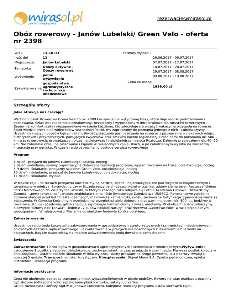 [email protected] Obóz rowerowy - Janów Lubelski/ Green Velo - oferta nr 2398 Wiek 13-18 lat Ilość dni 11 26.06.2017 - 06.07.2017 Miejscowość Janów Lubelski 07.07.2017 - 17.07.2017 Tematyka Obozy aktywne , Obozy rowerowe 18.07.2017 - 28.07.2017 Wyżywienie pełne wyżywienie 09.08.2017 - 19.08.2017 gospodarstwa agroturystyczne Zakwaterowanie i schorniska młodzieżowe Terminy wyjazdu: 29.07.2017 - 08.08.2017 Cena za osobę 1699.00 zł Szczegóły oferty Jakie atrakcje nas czekają? Wschodni Szlak Rowerowy Green Velo to ok. 2000 km specjalnie wytyczonej trasy, która daje radość podróżowania i poznawania. Szlak jest znakomicie oznakowany, bezpieczny i wyposażony w infrastrukturę dla turystów rowerowych . Zapewnia komfort jazdy i niezapomniane wrażenia każdemu, kto zdecyduje się przeżyć wakacyjną przygodę na rowerze. Szlak wiedzie przez pięć województw wschodniej Polski, my zapraszamy do poznania jednego z nich - Lubelszczyzny. Uczestnicy naszych obozów będą mieli możliwość połączenia pasji jeżdżenia na rowerze z poznawaniem ciekawych miejsc historycznych i przyrodniczych, panujących zwyczajów oraz smaków kuchni regionalnej. Przed nami do pokonania ok. 500 km tras rowerowych, prowadzących przez najciekawsze i najpiękniejsze miejsca Roztocza. Dziennie przejedziemy ok. 40 -50 km. Nie zabraknie czasu na plażowanie i kąpiele w miejscowych kąpieliskach, a po całodziennym wysiłku na wieczorną integrację przy ognisku. W czasie rajdu zapewniamy obsługę serwisu rowerowego Program 1 dzień –przyjazd do Janowa Lubelskiego, kolacja, nocleg 2 dzień –śniadanie, sprawy organizacyjne dotyczące realizacji programu, wyjazd rowerami na trasę, obiadokolacja, nocleg. 3-9 dzień –śniadanie, przejazdy szlakiem Green Velo, obiadokolacja, nocleg 10 dzień – śniadanie, przejazd do Janowa Lubelskiego, obiadokolacja, nocleg 11 dzień – śniadanie, wyjazd W trakcie rajdu na trasach przejazdu odwiedzimy najbardziej znane i najatrakcyjniejsze pod względem krajobrazowym i turystycznym miejsca. Sprawdzimy czy w Szczebrzeszynie chrząszcz brzmi w trzcinie, udamy się na teren Roztoczańskiego Parku Narodowego do Zwierzyńca –miasta, w którym każdego roku odbywa się Letnia Akademia Filmowa. Odwiedzimy Zamość –„perłę renesansu” , miasto znajdujące się na liście Światowego Dziedzictwa UNESCO. Renesansowe założenie obronne stanowi przykład "miasta idealnego", malownicze kamieniczki, rynek, zachowane fortyfikacje z pewnością warte są zobaczenia. W Górecku Kościelnym przejedziemy przepiękną aleją dębową z drzewami mającymi ok. 500 lat, będzimy w rowerowej stolicy - Józefowie, gdzie znajdują się rozległe kamieniołomy z wieżą widokową. W okolicach Suśca zobaczymy niezwykłe "Szumy nad Tanwią" - jeden z „7 cudów Polskiej Natury” oraz rezerwat „Czartowe Pole” wraz z przepięknymi wodospadami . W miejscowości Florianka odwiedzimy hodowlę konika polskiego. Zakwaterowanie Uczestnicy rajdu będą korzystali z zakwaterowania w gospodarstwach agroturystycznych i schroniskach młodzieżowych, położonych na trasie rajdu rowerowego. Zakwaterowanie w pokojach wieloosobowych z łazienkami lub łazienki na korytarzach. Bagaże uczestników na miejsce zakwaterowania będą dowożone samochodem. Świadczenia Zakwaterowanie: 10 noclegów w gospodarstwach agroturystycznych i schroniskach młodzieżowych.Wyżywienie: całodzienne 3 posiłki: śniadania, obiadokolacje, suchy prowiant na czas przejazdu trasami rajdu. Pierwszy posiłek kolacja w dniu przyjazdu. Ostatni posiłek: śniadanie w dniu wyjazdu, suchy prowiant na drogę powrotną –dla podróży trwającej powyżej 5 godzin. Transport: autokar turystyczny. Ubezpieczenie: Signal Iduna S.A. Opieka pedagogiczna, opieka instruktora. Realizacja programu. Informacje praktyczne Cena nie obejmuje: dopłat za transport z miast wyszczególnionych w planie podróży. Rowery na czas przejazdu powinny być złożone (odkręcone koła) zapakowane płasko w torby, sakwy lub karton. Grupa rozpoczyna i kończy rajd w w Janowie Lubelskim. Kolejność realizacji programu ustala kierownik rajdu. Na obóz należy zabrać: rower -sprawny technicznie, zgodnie z przepisami ruchu drogowego, obowiązkowo kask rowerowy i kamizelkę odblaskową, wygodny strój do jazdy na rowerze przystosowany zarówno na dni upalne jak i chłodniejsze, wygodne obuwie, kurtkę przeciwdeszczową/pelerynę, rękawiczki rowerowe, okulary słoneczne, strój kąpielowy, na wyjazdy w trasę mały plecak . Każdy uczestnik powinien posiadać min 1 szt. zapasowej dętki oraz linkę zabezpieczającą do zapinania roweru. W cenie obozu zapewniamy serwis rowerowy. Koszty zakupu części rowerowych potrzebnych do naprawy roweru, ponosi uczestnik. Bagaże uczestników będą dowożone na miejsce zakwaterowania samochodem. Należy zabrać ze sobą kwotę ok. 40 zł na bilety wstępu do zwiedzanych obiektów. Planowany przyjazd do ośrodka ok. godz. 17.00 Jak rezerwować Aby wstępnie zarezerwować wyjazd, Klient powinien: -podać w wyszukiwarce parametry obozu/kolonii, którymi jest zainteresowany (np. kraj, miasto, tematykę wyjazdu, wiek itp.) i kliknąć Wyszukaj oferty -po wyświetleniu wyników wyszukiwania przeczytać opisy wyjazdów, wybrać jeden z nich i kliknąćPrzejdź do rezerwacji, gdzie znajduje się Formularz rezerwacyjny -wypełnić Formularz rezerwacyjny, w którym należy podać prawidłowe dane osobowe uczestników wyjazdu, niezbędne do dokonania rezerwacji -po wprowadzeniu danych zaakceptować Regulamin i Warunki uczestnictwa Organizatora imprezy turystycznej (znajdujące się przy opisie oferty) i kliknąć Wyślij Kolejne kroki: - po potwierdzeniu telefonicznym i mailowym przezKonsultanta mirasol.pl dostępności miejsc i otrzymaniu mailem Potwierdzenia rezerwacji, należy wpłacić wymaganą zaliczkę lub całą kwotę za wyjazd - w momencie dokonania wpłaty zawarta zostaje Umowa pomiędzy Klientem a Org