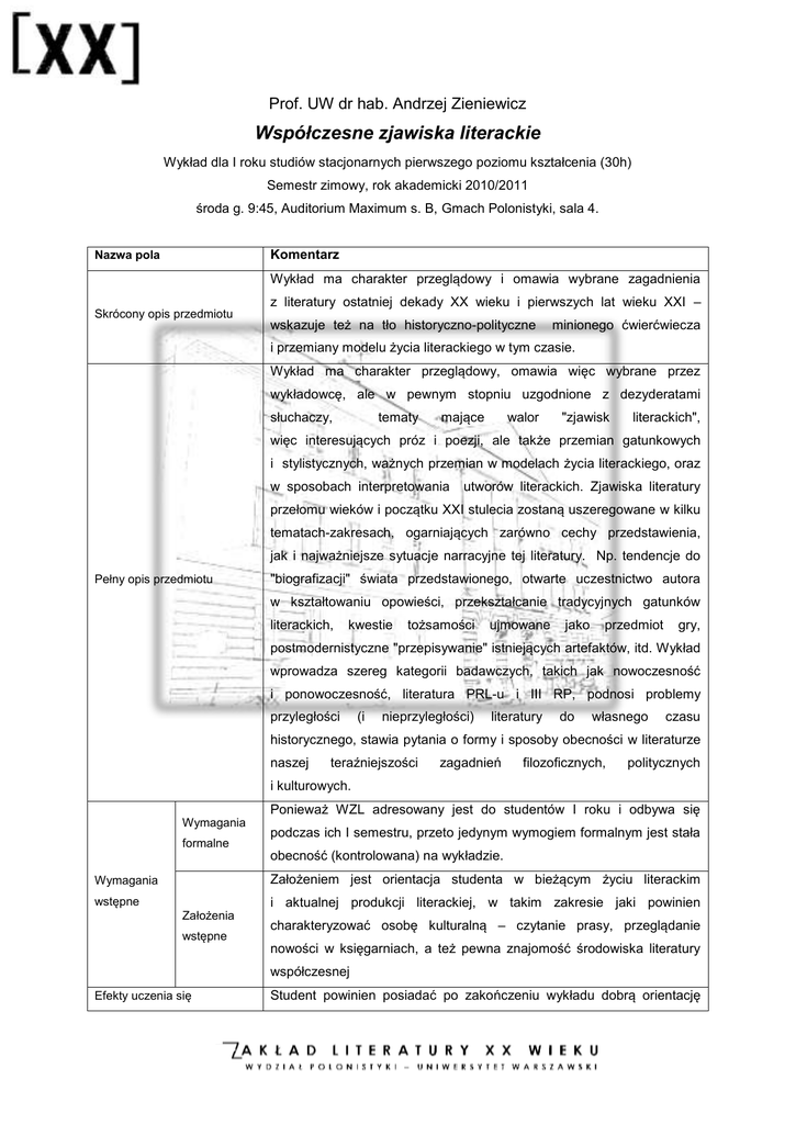 Prof. UW dr hab. Andrzej Zieniewicz Współczesne zjawiska literackie Wykład dla I roku studiów stacjonarnych pierwszego poziomu kształcenia (30h) Semestr zimowy, rok akademicki 2010/2011 środa g. 9:45, Auditorium Maximum s. B, Gmach Polonistyki, sala 4. Komentarz Nazwa pola Wykład ma charakter przeglądowy i omawia wybrane zagadnienia Skrócony opis przedmiotu z literatury ostatniej dekady XX wieku i pierwszych lat wieku XXI – wskazuje też na tło historyczno-polityczne minionego ćwierćwiecza i przemiany modelu życia literackiego w tym czasie. Wykład ma charakter przeglądowy, omawia więc wybrane przez wykładowcę, ale w pewnym stopniu uzgodnione z dezyderatami słuchaczy, tematy mające walor "zjawisk literackich", więc interesujących próz i poezji, ale także przemian gatunkowych i stylistycznych, ważnych przemian w modelach życia literackiego, oraz w sposobach interpretowania utworów literackich. Zjawiska literatury przełomu wieków i początku XXI stulecia zostaną uszeregowane w kilku tematach-zakresach, ogarniających zarówno cechy przedstawienia, jak i najważniejsze sytuacje narracyjne tej literatury. Np. tendencje do Pełny opis przedmiotu "biografizacji" świata przedstawionego, otwarte uczestnictwo autora w kształtowaniu opowieści, przekształcanie tradycyjnych gatunków literackich, kwestie tożsamości ujmowane jako przedmiot gry, postmodernistyczne "przepisywanie" istniejących artefaktów, itd. Wykład wprowadza szereg kategorii badawczych, takich jak nowoczesność i ponowoczesność, literatura PRL-u i III RP, podnosi problemy przyległości (i nieprzyległości) literatury do własnego czasu historycznego, stawia pytania o formy i sposoby obecności w literaturze naszej teraźniejszości zagadnień filozoficznych, politycznych i kulturowych. Ponieważ WZL adresowany jest do studentów I roku i odbywa się Wymagania formalne podczas ich I semestru, przeto jedynym wymogiem formalnym jest stała obecność (kontrolowana) na wykładzie. Założeniem jest orientacja studenta w bieżącym życiu literackim Wymagania wstępne Założenia wstępne i aktualnej produkcji literackiej, w takim zakresie jaki powinien charakteryzować osobę kulturalną – czytanie prasy, przeglądanie nowości w księgarniach, a też pewna znajomość środowiska literatury współczesnej Efekty uczenia się Student powinien posiadać po zakończeniu wykładu dobrą orientację w zagadnieniach literatury najnowszej, powinien umieć dostrzec ją w szerszym dyskursie historycznym literatury XX wieku, a też rozumieć szereg jednoczesnych procesów, które w tej najnowszej literaturze zachodzą Metody dydaktyczne Wykład - z możliwymi elementami konwersatorium (w zależności od aktywności słuchaczy) Wiedza studenta i korzyści wyniesione z wykładu zostaną ocenione Metody i kryteria oceniania poprzez pisemny sprawdzian przeprowadzony na ostatnich zajęciach. Sposób zaliczenia Zaliczenie na ocenę. Sposób realizacji przedmiotu Przedmiot jest realizowany w sali dydaktycznej. Język wykładowy polski 1. Od "powieści-worka" do sylwy współczesnej. Ewolucja powiązań biografii i powieści w literaturze najnowszej. P. Czapliński, Ślady przełomu 2. Historia i trauma. Doświadczenie ekstremalne i jego literackie ekwiwalenty. Pamięć i postpamięć. (M. Głowiński, H. Grynberg, M. Tulli) M. Hirsch, Family Frames 3. DDE (Dorosłe Dzieci Epoki) Cienie PRLu w narracjach z przełomu stuleci (J. Sosnowski, J. Pilch, A. Stasiuk) A. Mencwel, Rodzinna Europa po raz pierwszy 4. Autoryzowanie opowieści. Kryzys fikcji jako figura literacka. Senilia. Późne wiersze-opowieści Cz. Miłosza, Zb. Herberta, T. Różewicza. St. Balbus, Zagłada gatunków, "Teksty Drugie" 1999 n 6 Zakres tematów 5. Feministka jako bohaterka literacka, jako instytucja polityczna i jako zagadnienie filozoficzne (A. Graff, J. Bracxh-Czayna, I. Iwasiów) 6. Queer, kamp, gender – czyli problemy auto-identyfikacji (M. Witkowski, D. Masłowska) J. Butler, Uwikłani w płeć 7. Między dokumentem a spotęgowaną fikcją (W. Kuczok, M. Nahacz, P. Huelle, St. Chwin) Co dalej literaturo?, pod red. A. Brodzka-wald, H. Gosk i A. Werner 8.Poza granice reportażu (M. Wilk, A. Tuszyńska, J. M. Rymkiewicz) 9. Co wyrosło z pokolenia "bruLionu"? (E. Tkaczyszyn-Dycki, T. Różycki i młodsi poeci) S. Fish, Czy na tych ćwiczeniach jest tekst? [w:] tegoż, Interpretacja. Retoryka. Polityka 10. Sagi rodzinne (J. Olczak-Ronikier, K.T. Toeplitz, M. Wyka) 11. „Powrót centrali" czyli literatura najnowsza wobec kultury masowej P. Czapliński, Polska do wymiany 12-15. Tematy zajęć do ustalenia z audytorium. P. Czapliński, Ślady przełomu Ph. Lejeune, Wariacje na temat pewnego paktu St. Balbus, Zagłada gatunków, "Teksty Drugie" 1999 nr 6 S. Fish, Czy na tych ćwiczeniach jest tekst? [w:] tegoż, Interpretacja. Retoryka. Polityka J. Butler, Uwikłani w płeć A. Mencwel, Rodzinna Europa po raz pierwszy Co dalej literaturo? Jak zmienia się współcześnie pojęcie i sytuacja literatury, pod red. A. Brodzkiej-Wald, H. Gosk i A. Wernera M. Hirsch, Family Frames H. Grynberg, Prawda nieartystyczna M. Głowiński, Czarne sezony M. Tulli, Skaza J. Sosnowski, Wielościan J. Pilch, Tysiąc spokojnych miast A. Stasiuk, Dukla Cz. Miłosz, Druga przestrzeń T. Różewicz, Nożyk profesora Literatura J.M. Rymkiewicz, Zachód słońca w Milanówku A. Graff, Świat bez kobiet J. Brach-Czayna, Szczeliny istnienia M. Witkowski, Lubiewo D. Masłowska, Paw królowej W.Kuczok, Bombel P. Huelle, Castorp M. Wilk, Wilczy notes A. Tuszyńska, Rodzinna historia lęku D. Foks, Z. Libera, Co robi łączniczka? M. Abramowicz, Każdy przyniósł co miał najlepszego P. Szewc, Zmierzchy i poranki E. Tkaczyszyn-Dycki, Piosenka o zależnościach i uzależnieniach T. Różycki, Wiersze J. Dehnel, Lala J. Olczak-Ronikier, W ogrodzie pamięci K.T. Toeplitz, Książka mojego ojca M. Wyka, Przypisy do biografii.