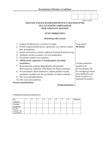 Kuratorium Oświaty w Lublinie KOD UCZNIA ZESTAW ZADAŃ KONKURSOWYCH Z MATEMATYKI DLA UCZNIÓW GIMNAZJUM ROK SZKOLNY 2014/2015 ETAP OKRĘGOWY Instrukcja dla ucznia 1. Zestaw konkursowy zawiera 8 zadań. 2. Przed rozpoczęciem pracy sprawdź, czy zestaw zadań jest kompletny. 3. Jeżeli zauważysz usterki, zgłoś je Komisji Konkursowej. 4. Zadania czytaj uważnie i ze zrozumieniem. 5. Przedstaw pełne rozwiązania. 6. (Obliczenia zapisane w brudnopisie nie będą oceniane.) 7. Rozwiązania zapisuj długopisem lub piórem. Rozwiązania zapisane ołówkiem nie będą oceniane. 8. W nawiasach obok numerów zadań podano liczbę punktów możliwych do uzyskania za dane zadanie. 9. Nie używaj kalkulatora. 10. Nie używaj korektora. Pracuj samodzielnie. POWODZENIA! Czas pracy: 90 minut Liczba punktów możliwych do uzyskania: 40 Do następnego etapu zakwalifikujesz się, jeżeli uzyskasz co najmniej 32 punkty. Wypełnia komisja konkursowa : Nr. zadania Liczba punktów Liczba punktów po weryfikacji 1 2 3 4 5 6 7 8 Razem Zadanie 1 ( 5p ). Oceń prawdziwość zdań. Wybierz P, jeśli zdanie jest prawdziwe lub F – jeśli jest fałszywe. a) Iloczyn liczb 6,3 * 10 7 oraz 3 * 104 zapisany w notacji wykładniczej jest równy 1,89 * 102 P F b) Gdy koło o promieniu 6 dm wykona 100 obrotów, to na tej samej drodze koło o promieniu 4 cm wykona 150 obrotów. P F c) Jeżeli różnica między długością boku trójkąta równobocznego a jego wysokością wynosi 2 3 , to długość boku tego trójkąta jest równa 2. P F d) Jeżeli x 2 81 , to x 5 może mieć wartość 16. P F e) Odległość między punktami A 3;2 i B 2;1 wynosi P F 2 34 . Zadanie 2 ( 5p ). W zadaniu 2 wybierz prawidłową odpowiedź. a) Jeżeli a jest liczbą całkowitą, to jaki największy obwód może mieć trójkąt o bokach długości: 3 cm, 4 cm i a cm. A. 12 b) C. 13 D. 14 Stosunek miar kątów wewnętrznych trójkąta jest równy 5:6:7. Miara kąta rozwartego między wysokościami trójkąta poprowadzonymi z wierzchołków dwóch mniejszych kątów jest równa A. 1100 c) B. 10 B. 900 C. 1000 D. 80 0 Kasia uzyskała średnią punktów z czterech sprawdzianów równą 12,5. Ile punktów musi ona uzyskać w kolejnym sprawdzianie, aby średnia z pięciu sprawdzianów wynosiła 13? A. 14 B. 13 C. 15 D. 17 d) Liczba 82_ _ jest podzielna przez 90. Ilorazem tego działania jest liczba A. 90 B.91 C. 19 D. 92 e) Wyznaczając wartość x ze wzoru y zy 1 y yz C. x y A. x z y y zy D. x 1 z B. x x otrzymamy xz Zadanie 3 ( 5p ). Dany jest trójkąt prostokątny ABC, w którym CAB = 30o. Na przyprostokątnej AB w odległości 6 cm od punktu A zaznaczono punkt K tak, że CKB = 60o. Wykonaj rysunek schematyczny i oblicz, o ile dłuższy jest bok AC od odcinka CK. Zadanie 4 ( 6p ). Z punktu A należącego do okręgu o środku w punkcie O i promieniu r, zatoczono łuk o promieniu r, który podzielił koło na dwie figury. Oblicz, jaką część koła o środku O stanowi figura o mniejszym polu. Zadanie 5 ( 5p ). Istnieją liczby dwucyfrowe, które mają te własność, że jeśli wpiszemy cyfrę 5 między jej cyframi, to otrzymamy liczbę trzycyfrową 11 razy większą od danej. Podaj wszystkie liczby o podanej własności. Odpowiedz uzasadnij. Zadanie 6 ( 6p ). Pan Nowak złożył swoje oszczędności w kwocie 12000 zł w trzech bankach : I, II i III. W banku I złożył połowę tego, co w dwóch pozostałych, a w banku II trzecią część tego co w dwóch pozostałych. Jaką część swoich oszczędności złożył w banku III ? Zadanie 7 ( 4p ). Kolejka porusza się z prędkością 300m/minutę. Czy w ciągu 40 sekund objedzie ona tor przedstawiony na rysunku ? Odpowiedź uzasadnij. 20m 60m Zadanie 8 ( 4p ). 1 1,96 4 302 i wykonaj sprawdzenie. 0,001 (5 x 14,4) Rozwiąż równanie BRUDNOPIS :