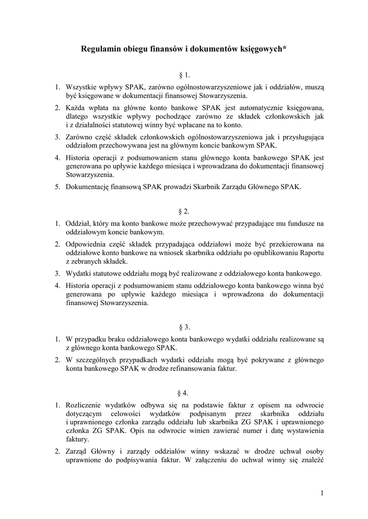 Regulamin obiegu finansów i dokumentów księgowych* § 1. 1. Wszystkie wpływy SPAK, zarówno ogólnostowarzyszeniowe jak i oddziałów, muszą być księgowane w dokumentacji finansowej Stowarzyszenia. 2. Każda wpłata na główne konto bankowe SPAK jest automatycznie księgowana, dlatego wszystkie wpływy pochodzące zarówno ze składek członkowskich jak i z działalności statutowej winny być wpłacane na to konto. 3. Zarówno część składek członkowskich ogólnostowarzyszeniowa jak i przysługująca oddziałom przechowywana jest na głównym koncie bankowym SPAK. 4. Historia operacji z podsumowaniem stanu głównego konta bankowego SPAK jest generowana po upływie każdego miesiąca i wprowadzana do dokumentacji finansowej Stowarzyszenia. 5. Dokumentację finansową SPAK prowadzi Skarbnik Zarządu Głównego SPAK. § 2. 1. Oddział, który ma konto bankowe może przechowywać przypadające mu fundusze na oddziałowym koncie bankowym. 2. Odpowiednia część składek przypadająca oddziałowi może być przekierowana na oddziałowe konto bankowe na wniosek skarbnika oddziału po opublikowaniu Raportu z zebranych składek. 3. Wydatki statutowe oddziału mogą być realizowane z oddziałowego konta bankowego. 4. Historia operacji z podsumowaniem stanu oddziałowego konta bankowego winna być generowana po upływie każdego miesiąca i wprowadzona do dokumentacji finansowej Stowarzyszenia. § 3. 1. W przypadku braku oddziałowego konta bankowego wydatki oddziału realizowane są z głównego konta bankowego SPAK. 2. W szczególnych przypadkach wydatki oddziału mogą być pokrywane z głównego konta bankowego SPAK w drodze refinansowania faktur. § 4. 1. Rozliczenie wydatków odbywa się na podstawie faktur z opisem na odwrocie dotyczącym celowości wydatków podpisanym przez skarbnika oddziału i uprawnionego członka zarządu oddziału lub skarbnika ZG SPAK i uprawnionego członka ZG SPAK. Opis na odwrocie winien zawierać numer i datę wystawienia faktury. 2. Zarząd Główny i zarządy oddziałów winny wskazać w drodze uchwał osoby uprawnione do podpisywania faktur. W załączeniu do uchwał winny się znaleźć 1 wzory podpisów. W przypadku braku odnośnych uchwał osobami uprawnionymi są prezesi zarządów i skarbnicy. 3. Faktury winny być opisane i bez zbędnej zwłoki wprowadzone do dokumentacji finansowej Stowarzyszenia. Może się to odbywać dwiema drogami: a) poprzez skanowanie obu stron dokumentu i przesłanie e-mailem do Skarbnika ZG SPAK, który ma obowiązek wprowadzenia do systemu księgowego, b) poprzez dodanie, zgodnie z instrukcją, do elektronicznego systemu księgowego bezpośrednio przez osobę uprawnioną przez Skarbnika ZG SPAK. 4. Oryginały wszystkich dokumentów księgowych winny być dostarczone Skarbnikowi ZG SPAK raz na kwartał, nie później niż w dniu statutowego posiedzenia Zarządu Głównego SPAK. 5. Skarbnik ZG SPAK nadaje uprawnienia skarbnikom oddziałów do wprowadzania dokumentów do elektronicznego systemu księgowego i określa zasady wprowadzania dokumentów do systemu. W tych zasadach określa wzór opisu faktury. 6. Zarząd Główny wydaje dokumenty zaświadczające o uprawnieniach do podpisu faktur. ______________ * Uchwała Zarządu Głównego SPAK Nr 23/7 z dnia 2014.06.28. 2