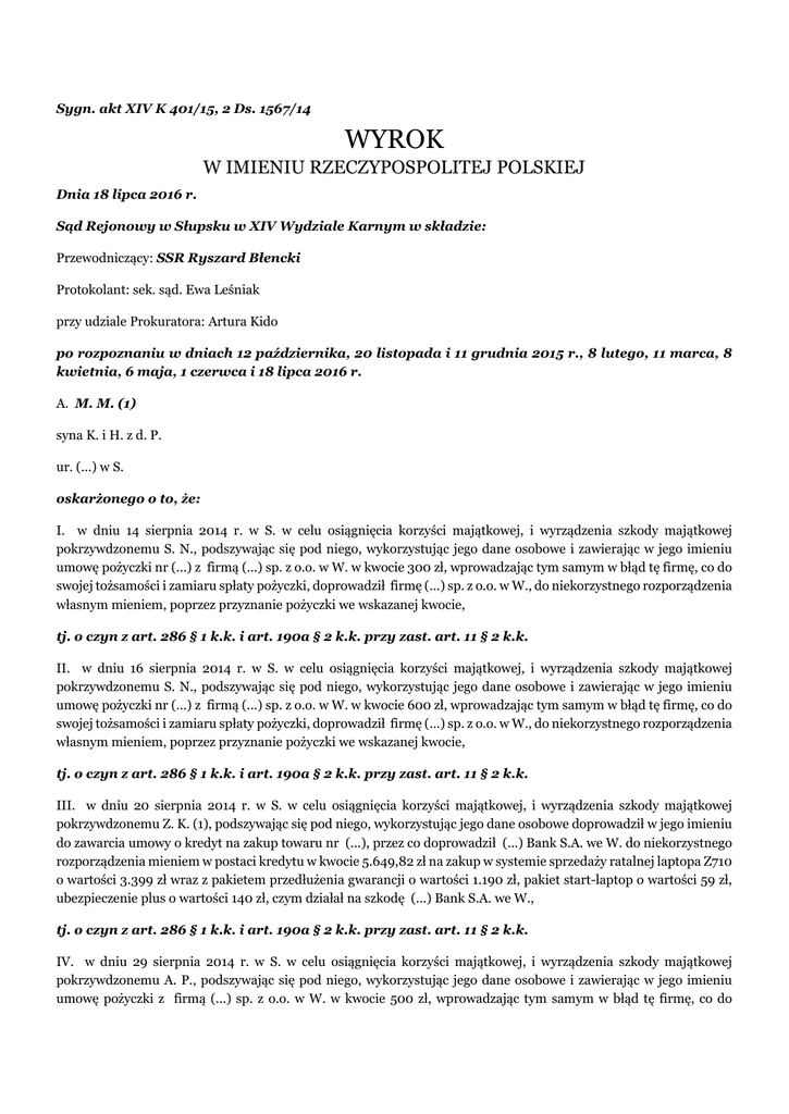 Sygn. akt XIV K 401/15, 2 Ds. 1567/14 WYROK W IMIENIU RZECZYPOSPOLITEJ POLSKIEJ Dnia 18 lipca 2016 r. Sąd Rejonowy w Słupsku w XIV Wydziale Karnym w składzie: Przewodniczący: SSR Ryszard Błencki Protokolant: sek. sąd. Ewa Leśniak przy udziale Prokuratora: Artura Kido po rozpoznaniu w dniach 12 października, 20 listopada i 11 grudnia 2015 r., 8 lutego, 11 marca, 8 kwietnia, 6 maja, 1 czerwca i 18 lipca 2016 r. A. M. M. (1) syna K. i H. z d. P. ur. (...) w S. oskarżonego o to, że: I. w dniu 14 sierpnia 2014 r. w S. w celu osiągnięcia korzyści majątkowej, i wyrządzenia szkody majątkowej pokrzywdzonemu S. N., podszywając się pod niego, wykorzystując jego dane osobowe i zawierając w jego imieniu umowę pożyczki nr (...) z firmą (...) sp. z o.o. w W. w kwocie 300 zł, wprowadzając tym samym w błąd tę firmę, co do swojej tożsamości i zamiaru spłaty pożyczki, doprowadził firmę (...) sp. z o.o. w W., do niekorzystnego rozporządzenia własnym mieniem, poprzez przyznanie pożyczki we wskazanej kwocie, tj. o czyn z art. 286 § 1 k.k. i art. 190a § 2 k.k. przy zast. art. 11 § 2 k.k. II. w dniu 16 sierpnia 2014 r. w S. w celu osiągnięcia korzyści majątkowej, i wyrządzenia szkody majątkowej pokrzywdzonemu S. N., podszywając się pod niego, wykorzystując jego dane osobowe i zawierając w jego imieniu umowę pożyczki nr (...) z firmą (...) sp. z o.o. w W. w kwocie 600 zł, wprowadzając tym samym w błąd tę firmę, co do swojej tożsamości i zamiaru spłaty pożyczki, doprowadził firmę (...) sp. z o.o. w W., do niekorzystnego rozporządzenia własnym mieniem, poprzez przyznanie pożyczki we wskazanej kwocie, tj. o czyn z art. 286 § 1 k.k. i art. 190a § 2 k.k. przy zast. art. 11 § 2 k.k. III. w dniu 20 sierpnia 2014 r. w S. w celu osiągnięcia korzyści majątkowej, i wyrządzenia szkody majątkowej pokrzywdzonemu Z. K. (1), podszywając się pod niego, wykorzystując jego dane osobowe doprowadził w jego imieniu do zawarcia umowy o kredyt na zakup towaru nr (...), przez co doprowadził (...) Bank S.A. we W. do niekorzystnego rozporządzenia mieniem w postaci kredytu w kwocie 5.649,82 zł na zakup w systemie sprzedaży ratalnej laptopa Z710 o wartości 3.399 zł wraz z pakietem przedłużenia gwarancji o wartości 1.190 zł, pakiet start-laptop o wartości 59 zł, ubezpieczenie plus o wartości 140 zł, czym działał na szkodę (...) Bank S.A. we W., tj. o czyn z art. 286 § 1 k.k. i art. 190a § 2 k.k. przy zast. art. 11 § 2 k.k. IV. w dniu 29 sierpnia 2014 r. w S. w celu osiągnięcia korzyści majątkowej, i wyrządzenia szkody majątkowej pokrzywdzonemu A. P., podszywając się pod niego, wykorzystując jego dane osobowe i zawierając w jego imieniu umowę pożyczki z firmą (...) sp. z o.o. w W. w kwocie 500 zł, wprowadzając tym samym w błąd tę firmę, co do swojej tożsamości i zamiaru spłaty pożyczki, doprowadził firmę (...) sp. z o.o. w W. do niekorzystnego rozporządzenia własnym mieniem, poprzez przyznanie pożyczki we wskazanej kwocie, tj. o czyn z art. 286 § 1 k.k. i art. 190a § 2 k.k. przy zast. art. 11 § 2 k.k. V. w dniu 29 sierpnia 2014 r. w S. w celu osiągnięcia korzyści majątkowej, i wyrządzenia szkody majątkowej pokrzywdzonemu A. P., podszywając się pod niego, wykorzystując jego dane osobowe i zawierając w jego imieniu umowę pożyczki z firmą (...) sp. z o.o. w W. w kwocie 1.000 zł oraz tego samego dnia w kwocie 400 złotych, wprowadzając tym samym w błąd tę firmę, co do swojej tożsamości i zamiaru spłaty pożyczki, doprowadził firmę (...) sp. z o.o. w W., do niekorzystnego rozporządzenia własnym mieniem, poprzez przyznanie pożyczki we wskazanej kwocie, tj. o czyn z art. 286 § 1 k.k. i art. 190a § 2 k.k. przy zast. art. 11 § 2 k.k. VI. w dniu 29 sierpnia 2014 r. w S. w celu osiągnięcia korzyści majątkowej, i wyrządzenia szkody majątkowej pokrzywdzonemu A. P., podszywając się pod niego, wykorzystując jego dane osobowe i zawierając w jego imieniu umowę pożyczki z firmą (...) sp. z o.o. w W. w kwocie 600 zł, wprowadzając tym samym w błąd tę firmę, co do swojej tożsamości i zamiaru spłaty pożyczki, doprowadził firmę (...) sp. z o.o. w W., do niekorzystnego rozporządzenia własnym mieniem, poprzez przyznanie pożyczki we wskazanej kwocie, tj. o czyn z art. 286 § 1 k.k. i art. 190a § 2 k.k. przy zast. art. 11 § 2 k.k. VII. w dniu 29 sierpnia 2014 r. w S. w celu osiągnięcia korzyści majątkowej, i wyrządzenia szkody majątkowej pokrzywdzonemu A. P., podszywając się pod niego, wykorzystując jego dane osobowe i zawierając w jego imieniu umowę pożyczki z firmą (...) sp. z o.o. w W. w kwocie 500 zł wprowadzając tym samym w błąd tę firmę, co do swojej tożsamości i zamiaru spłaty pożyczki, doprowadził firmę (...) sp. z o.o. w W., do niekorzystnego rozporządzenia własnym mieniem, poprzez przyznanie pożyczki we wskazanej kwocie, tj. o czyn z art. 286 § 1 k.k. i art. 190a § 2 k.k. przy zast. art. 11 § 2 k.k. VIII. w dniu 06 października 2014 r. w S. w celu osiągnięcia korzyści majątkowej, i wyrządzenia szkody majątkowej pokrzywdzonemu D. K., podszywając się pod niego, wykorzystując jego dane osobowe i zawierając w jego imieniu umowę pożyczki z firmą (...) sp. z o.o. w W. w kwocie 1.000 zł oraz tego samego dnia w kwocie 400 złotych, wprowadzając tym samym w błąd tę firmę, co do swojej tożsamości i zamiaru spłaty pożyczki, doprowadził firmę (...) sp. z o.o. w W., do niekorzystnego rozporządzenia własnym mieniem, poprzez przyznanie pożyczki we wskazanej kwocie, tj. o czyn z art. 286 § 1 k.k. i art. 190a § 2 k.k. przy zast. art. 11 § 2 k.k. IX. w okresie od 8 stycznia 2015 r. do 15 stycznia 2015 r. w S. działając w celu osiągnięcia korzyści majątkowej oraz wspólnie i w porozumieniu z ustalonymi osobami, poprzez namówienie A. L. do złożenia przez Internet nierzetelnego oświadczenia o posiadanych dochodach z ty