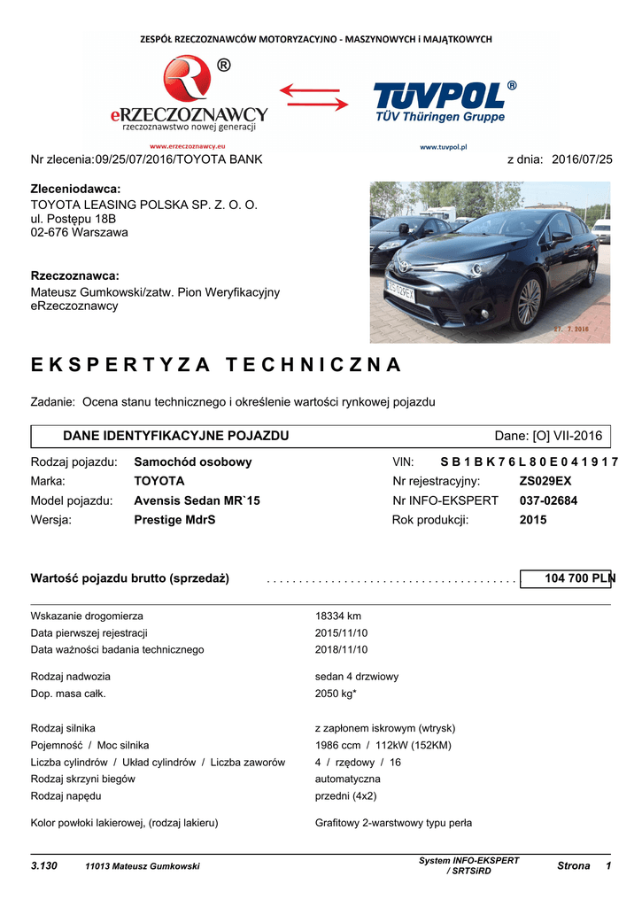 Nr zlecenia:09/25/07/2016/TOYOTA BANK z dnia: 2016/07/25 Zleceniodawca: TOYOTA LEASING POLSKA SP. Z. O. O. ul. Postępu 18B 02-676 Warszawa Rzeczoznawca: Mateusz Gumkowski/zatw. Pion Weryfikacyjny eRzeczoznawcy EKSPERTYZA TECHNICZNA Zadanie: Ocena stanu technicznego i określenie wartości rynkowej pojazdu DANE IDENTYFIKACYJNE POJAZDU Dane: [O] VII-2016 Rodzaj pojazdu: Samochód osobowy VIN: Marka: TOYOTA Nr rejestracyjny: ZS029EX Model pojazdu: Avensis Sedan MR`15 Nr INFO-EKSPERT 037-02684 Wersja: Prestige MdrS Rok produkcji: 2015 Wartość pojazdu brutto (sprzedaż) SB1BK76L80E041917 ........................................ Wskazanie drogomierza 18334 km Data pierwszej rejestracji 2015/11/10 Data ważności badania technicznego 2018/11/10 Rodzaj nadwozia sedan 4 drzwiowy Dop. masa całk. 2050 kg* Rodzaj silnika z zapłonem iskrowym (wtrysk) Pojemność / Moc silnika 1986 ccm / 112kW (152KM) Liczba cylindrów / Układ cylindrów / Liczba zaworów 4 / rzędowy / 16 Rodzaj skrzyni biegów automatyczna Rodzaj napędu przedni (4x2) Kolor powłoki lakierowej, (rodzaj lakieru) Grafitowy 2-warstwowy typu perła 3.130 11013 Mateusz Gumkowski System INFO-EKSPERT / SRTSiRD 104 700 PLN Strona 1 TOYOTA AVENSIS ZS029EX 2016/07/28 WYPOSAŻENIE STANDARDOWE L.p. Nazwa elementu wyposażenia 1 ABS - system zapobiegający blokowaniu kół 2 Autoalarm 3 4 Dźwignia zmiany biegów pokryta skórą Fotel kierowcy podgrzewany 5 Fotel kierowcy regulowany elektr. z pamięcią położenia Fotel kierowcy z regulacją odcinka lędźwiowego elektr. Fotel pasażera podgrzewany Fotel pasażera regulowany elektr. Hamulec postojowy automatyczny Kamera cofania 6 7 8 9 10 11 12 13 14 15 16 17 18 19 20 21 22 23 24 25 26 27 Kierownica wielofunkcyjna pokryta skórą Klimatyzacja automatyczna 2 strefowa Kolumna kierownicy regulowana elektr. z pamięcią położenia Kurtyny powietrzne przednie Lusterka zewnętrzne podgrzewane elektr. Lusterka zewnętrzne regulowane elektrycznie Lusterka zewnętrzne składane elektr. Lusterko wewnętrzne ściemniane automatycznie Oparcie siedzeń tylnych dzielone asymetrycznie Otwór na długie przedmioty w siedzeniu tylnym Poduszka powietrzna kierowcy Poduszka powietrzna kolanowa kierowcy Poduszka powietrzna pasażera Poduszki powietrzne boczne przednie Reflektory przednie LED skrętne Spryskiwacze reflektorów Sterowanie skrzynią biegów przy kierownicy L.p. Nazwa elementu wyposażenia 28 System "inteligentny klucz" 29 System bezkluczykowego otwierania/zamykania samochodu 30 System kontroli trakcji TRC 31 System multimedialny Toyota Touch 2 & Go Plus 32 System ochrony pasażerów "PreCrash" 33 38 39 40 System ostrzegający przed niezamierzoną zmianą pasa ruchu System Pre-Collision System rozpoznawania znaków drogowych System stabilizacji toru jazdy VSC+ System wspomagający pokonywanie wzniesień System wspomagania nagłego hamowania Szyba przednia w dolnej części podgrzewana Szyby przednie regulowane elektr. 41 42 43 44 45 Szyby tylne dodatkowo przyciemniane Szyby tylne regulowane elektr. Światła do jazdy dziennej LED Światła drogowe automatycznie włączane Światła mijania włączane automatycznie 46 Światła p/mgielne przednie 47 Światło dodatkowe STOP LED 48 49 50 51 52 53 54 Tapicerka ze skóry perforowanej Tarcze kół alum. 17" Tempomat Wspomaganie układu kierowniczego Wycieraczki z czujnikiem deszczu Wyświetlacz wielofunkcyjny kolorowy Złącze "USB" 34 35 36 37 WYPOSAŻENIE DODATKOWE L.p. Nazwa elementu wyposażenia 1 Lakier perłowy 2 Pakiet VIP (dopłata) System nawigacji satelitarnej Radioodtwarzacz CD + MP3 System Bluetooth Tuner radiowy cyfrowy DAB Głośniki 10 szt. Wyświetlacz 8" kolorowy, dotykowy 3 Tarcze kół alum. 18" (dopłata) OPIS ZAMONTOWANEGO W POJEŹDZIE OGUMIENIA Koło Marka, typ Przednie lewe: BRIDGESTONE 225/45 Przednie prawe: BRIDGESTONE 225/45 Tylne lewe: BRIDGESTONE 225/45 Tylne prawe: BRIDGESTONE 225/45 3.130 11013 Mateusz Gumkowski R18 R18 R18 R18 95W 95W 95W 95W XL TURANZA ER 300 TL XL TURANZA ER 300 TL XL TURANZA ER 300 TL XL TURANZA ER 300 TL Bieżnik [mm] 6,5 6,5 7,0 6,9 System INFO-EKSPERT / SRTSiRD Strona 2 TOYOTA AVENSIS ZS029EX 2016/07/28 WYLICZENIE WARTOŚCI RYNKOWEJ WARTOŚĆ BAZOWA BRUTTO (14 mies.) ....................................... KOREKTA ZA PIERWSZĄ REJESTRACJĘ KOREKTA ZA WYPOSAŻENIE KOREKTA ZA PRZEBIEG 93 400 PLN 7 232 PLN po korekcie: 100 632 PLN 6 034 PLN po korekcie: 106 666 PLN - 909 PLN po korekcie: 105 757 PLN KOREKTY RÓŻNE: Stan utrzymania i dbałość o pojazd -1 057 PLN KOREKTY RÓŻNE RAZEM - 1 057 PLN po korektach: KOREKTA ZA OGUMIENIE 16 PLN po korekcie: WARTOŚĆ RYNKOWA BRUTTO PO ZAOKRĄGLENIU .............................. 104 700 PLN 104 716 PLN 104 700 PLN Wartość rynkowa brutto wyżej zidentyfikowanego pojazdu, określona na miesiąc lipiec 2016 roku wynosi: 104700 PLN (słownie: sto cztery tysiące siedemset złotych) w tym VAT (23,0%) 19578,05 PLN Wartość określono na podstawie: - notowań wartości rynkowych z katalogu "Pojazdy Samochodowe - Wartości Rynkowe VII-2016" zaakceptowanych przez wykonawcę opinii, - korekt mających wpływ na wartość pojazdu. OPIS STANU TECHNICZNEGO ZESPOŁÓW POJAZDU KABINA KIEROWCY - Szkielet i poszycia zewnętrzne L.p. Nazwa elementu L/P Rodzaj uszkodzenia 1 Drzwi boczne tylne L Zarysowania powłoki lakierowej 2 Błotnik tylny P Zarysowania powłoki lakierowej 3.130 11013 Mateusz Gumkowski Opis System INFO-EKSPERT / SRTSiRD Fot. nr Strona 3 TOYOTA AVENSIS ZS029EX 2016/07/28 KABINA KIEROWCY – Opis powłoki lakierowej Pokrywa przednia: 103-113 Błotnik przedni lewy: 81-88 Dach: 85-87 Błotnik przedni prawy: 90-110 Drzwi przednie lewe: 72-83 Drzwi przednie prawe : 81-82 Drzwi tylne lewe: 70-88 Drzwi tylne prawe: 80-83 Błotnik tylny lewy: 92-105 Błotnik tylny prawy: 99-127 Pokrywa (drzwi) tyłu nadwozia: 71-95 L.p. Nazwa elementu L / P Grubość powłoki [µm] 1 Pokrywa przednia 2 Dach 3 Błotnik przedni L 81-88 4 Drzwi przednie L 72-83 5 Drzwi tylne L 70-