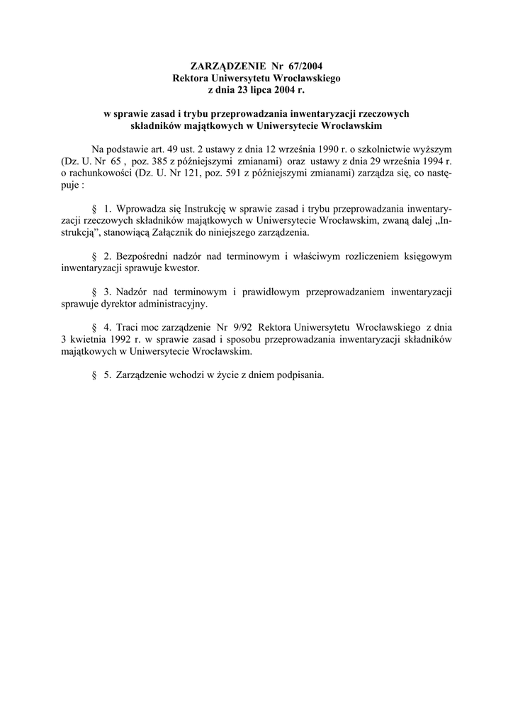 ZARZĄDZENIE Nr 67/2004 Rektora Uniwersytetu Wrocławskiego z