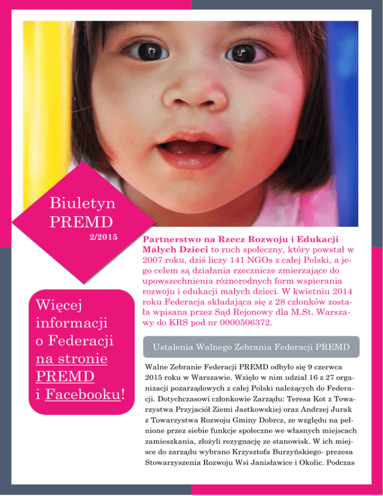 Biuletyn PREMD 2/2015 Więcej informacji o Federacji na stronie PREMD i Facebooku! Partnerstwo na Rzecz Rozwoju i Edukacji Małych Dzieci to ruch społeczny, który powstał w 2007 roku, dziś liczy 141 NGOs z całej Polski, a jego celem są działania rzecznicze zmierzające do upowszechnienia różnorodnych form wspierania rozwoju i edukacji małych dzieci. W kwietniu 2014 roku Federacja składająca się z 28 członków została wpisana przez Sąd Rejonowy dla M.St. Warszawy do KRS pod nr 0000506372. Ustalenia Walnego Zebrania Federacji PREMD Walne Zebranie Federacji PREMD odbyło się 9 czerwca 2015 roku w Warszawie. Wzięło w nim udział 16 z 27 organizacji pozarządowych z całej Polski należących do Federacji. Dotychczasowi członkowie Zarządu: Teresa Kot z Towarzystwa Przyjaciół Ziemi Jastkowskiej oraz Andrzej Jurak z Towarzystwa Rozwoju Gminy Dobrcz, ze względu na pełnione przez siebie funkcje społeczne we własnych miejscach zamieszkania, złożyli rezygnację ze stanowisk. W ich miejsce do zarządu wybrano Krzysztofa Burzyńskiego- prezesa Stowarzyszenia Rozwoju Wsi Janisławice i Okolic. Podczas spotkania zostały omówione plany w obszarze trzech celów Federacji: i. Zapewnienie dzieciom jakościowego środowiska rozwojowo-edukacyjnego zgodnie z Konwencją Praw Dziecka ii. Profesjonalizacja działań członków Federacji PREMD iii. Wymiana doświadczeń pomiędzy członkami Federacji PREMD Ze wszystkimi uwagami, refleksjami, wnioskami i pomysłami zapraszamy pod adres: [email protected] Więcej informacji o spotkaniu na stronie Wpłyńmy na prawo dotyczące wymagań ochrony przeciwpożarowej dla żłobków, przedszkoli- zgłaszajmy swoje uwagi! Naszym celem są działania rzecznicze zmierzające do upowszechniania różnorodnych form wspierania rozwoju i edukacji małych dzieci. Chcemy stwarzać równe możliwości edukacyjne wszystkim dzieciom. Obecne przepisy często niweczą plany o otworzeniu miejsca edukacyjnego dla dzieci, chociaż zapotrzebowanie na żłobki lub przedszkola jest ogromne. Zwracamy się do Was z prośbą o przesyłanie do nas do 20 lipca 2015 roku uwag i wszelkich komentarzy do obowiązującego prawa dotyczącego wymagań ochrony przeciwpożarowej oraz uwag dotyczących barier lokalowych, które hamują rozwój przedszkoli, żłobków i innych placówek opieki nad dziećmi. Nasze stanowisko zostanie zaprezentowane Rzecznikowi Praw Dziecka oraz Posłance, która ma możliwość lobbowania na rzecz tych zmian. Kolejnym krokiem będzie wypracowanie rozwiązań z Główną Komendą Państwową Straży, która uzgadniała ostatnie rozporządzenia przedszkolne MEN i żłobkowe MPiPS. Swoje uwagi przesyłajcie na adres Federacji: [email protected] Dołącz do ZDROWO JEMY, ZDROWO ROŚNIEMY! Fundacja Rozwoju Dzieci jest jednym z partnerów programu Zdrowo jemy, zdrowo rośniemy. Właśnie zakończył się pilotaż tego programu i trwają przygotowania do działań na szeroką - ogólnopolską skalę. Bardzo ważnym jest objęcie programem jak największej liczby dzieci, ponieważ prawidłowe nawyki żywieniowe są jednym z kluczowych elementów rozwoju najmłodszych. Trwa rekrutacja dietetyczek i dietetyków, którzy chcieliby odbyć staż w żłobkach i przedszkolach przeprowadzając analizy jadłospisów, konsultacje oraz warsztaty z zakresu dietetyki dla dzieci i dorosłych. Jeśli znacie kogoś, kto jest absolwentem kierunku Dietetyka lub Żywienie człowieka, przekażcie proszę informację o rekrutacji. Wszystkie szczegóły znajdziecie na stronie: http://zdrowojemy.info/rekrutacja. Wszystkich zainteresowanych edukacją demokratyczną! Zachęcamy do udziału w międzynarodowym zjeździe EUDEC, 1-9 sierpnia 2015 roku. Zachęcamy do wzięcia udziału w organizowanym przez Fundację Bullerbyn zjeździe EUDEC, który rozpocznie się 1sierpnia w Ojrzanowie koło Warszawy i potrwa 9 dni. Podczas konferencji EUDEC spotkamy sygnatariuszy międzynarodowego dokumentu Manifesto 15, który jest deklaracją wizji nowoczesnej i odpowiedzialnej edukacji. Szczególnie namawiamy do wzięcia udziału w bezpłatnym Festiwalu „INSPIRE THE FUTURE” w dniach 7-8 sierpnia. Festiwal podzielony jest na bloki podczas których będą trwały wystąpienia, wykłady, warsztaty oraz liczne działania towarzyszące m.in. prezentacje szkół alternatywnych, projekcje filmów, zjeżdżalnia/ błociarnia dla dzieci. Podczas wystąpień będą poruszane takie tematy jak „Szkoły 1.0 nie są w stanie uczyć dzieci 3.0.”, „Dzieci także są ludźmi”, „Nie oceniaj tego, co mierzymy, zmierz to, co jest cenione”, „Łam zasady, ale najpierw zrozum, dlaczego”. Więcej informacji… TRWAJĄCE KONKURSY Bank Zachodni WBK wystartował z II edycją ogólnopolskiego konkursu skierowanego do społeczności lokalnych – „Tu mieszkam, tu zmieniam”. Wysokość dofinansowania projektów wyniesie od 4 tys. do 10 tys. złotych. Propozycje projektów należy składać do 26 lipca 2015 roku. Więcej informacji... Fundacja BGK im. J. K. Steczkowskiego ogłosiła konkurs „Na dobry początek”. Można wygrać do 10 tysięcy złotych na projekty edukacyjne dla dzieci w wieku 2-8 lat. Do 10 września br. o dotacje mogą ubiegać się fundacje, stowarzyszenia, ośrodki kultury i biblioteki publiczne z siedzibą na terenach wiejskich lub w miejscowościach do 20 tys. mieszkańców. Więcej informacji... Narodowe Centrum Kultury, w związku z przypadającą w 2016 roku tysiąc pięćdziesiątą rocznicą Chrztu Polski, ogłasza nabór do programu Chrzest966. Celem programu jest zwiększenie świadomości Polaków na temat roli i znaczenia chrztu Polski jako jednego z najważniejszych wydarzeń w historii państwowości polskiej oraz jego wpływu na kształt współczesnej Polski. Dofinansowanie można otrzymać m.in. na organizację kampanii edukacyjnych. Wnioski można składać do 30 września 2015. Więcej informacji... Konkurs dla NGO z okolic Warszawy IKEA Warszawa pragnie nawią