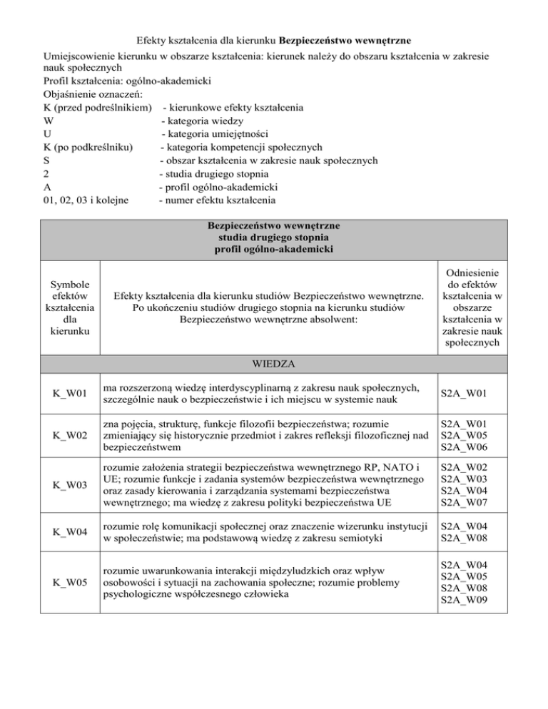 Efekty kształcenia dla kierunku Bezpieczeństwo wewnętrzne Umiejscowienie kierunku w obszarze kształcenia: kierunek należy do obszaru kształcenia w zakresie nauk społecznych Profil kształcenia: ogólno-akademicki Objaśnienie oznaczeń: K (przed podreślnikiem) - kierunkowe efekty kształcenia W - kategoria wiedzy U - kategoria umiejętności K (po podkreślniku) - kategoria kompetencji społecznych S - obszar kształcenia w zakresie nauk społecznych 2 - studia drugiego stopnia A - profil ogólno-akademicki 01, 02, 03 i kolejne - numer efektu kształcenia Bezpieczeństwo wewnętrzne studia drugiego stopnia profil ogólno-akademicki Symbole efektów kształcenia dla kierunku Efekty kształcenia dla kierunku studiów Bezpieczeństwo wewnętrzne. Po ukończeniu studiów drugiego stopnia na kierunku studiów Bezpieczeństwo wewnętrzne absolwent: Odniesienie do efektów kształcenia w obszarze kształcenia w zakresie nauk społecznych WIEDZA K_W01 ma rozszerzoną wiedzę interdyscyplinarną z zakresu nauk społecznych, szczególnie nauk o bezpieczeństwie i ich miejscu w systemie nauk S2A_W01 K_W02 zna pojęcia, strukturę, funkcje filozofii bezpieczeństwa; rozumie zmieniający się historycznie przedmiot i zakres refleksji filozoficznej nad bezpieczeństwem S2A_W01 S2A_W05 S2A_W06 K_W03 rozumie założenia strategii bezpieczeństwa wewnętrznego RP, NATO i UE; rozumie funkcje i zadania systemów bezpieczeństwa wewnętrznego oraz zasady kierowania i zarządzania systemami bezpieczeństwa wewnętrznego; ma wiedzę z zakresu polityki bezpieczeństwa UE S2A_W02 S2A_W03 S2A_W04 S2A_W07 K_W04 rozumie rolę komunikacji społecznej oraz znaczenie wizerunku instytucji w społeczeństwie; ma podstawową wiedzę z zakresu semiotyki S2A_W04 S2A_W08 K_W05 rozumie uwarunkowania interakcji międzyludzkich oraz wpływ osobowości i sytuacji na zachowania społeczne; rozumie problemy psychologiczne współczesnego człowieka S2A_W04 S2A_W05 S2A_W08 S2A_W09 zna dzieje organów policyjnych i systemu bezpieczeństwa wewnętrznego na ziemiach polskich; rozumie rolę i miejsce instytucji policyjnych w systemie prawno-politycznym i w rozwoju społecznym Polski S2A_W02 S2A_W04 S2A_W05 S2A_W08 K_W07 zna prawne i organizacyjne aspekty ochrony ludności, mienia i dóbr kultury oraz zasady kierowania działaniami na rzecz ochrony ludności S2A_W02 S2A_W03 S2A_W04 S2A_W07 K_W08 rozumie istotę i zna typologię strategii oraz zarządzania strategicznego; zna koncepcje i cechy zarządzania strategicznego S2A_W07 S2A_W08 S2A_W09 S1A_W11 K_W09 ma wiedzę na temat współczesnych zagrożeń terrorystycznych; rozumie rolę i zadania podmiotów systemu bezpieczeństwa oraz znaczenie współpracy międzynarodowej w działaniach antyterrorystycznych S2A_W02 S2A_W03 S2A_W04 S2A_W08 ma wiedzę o genezie zapobiegania przestępczości; zna europejskie, rządowe, narodowe i regionalne strategie zapobiegania przestępczości S2A_W02 S2A_W03 S2A_W08 S2A_W09 K_W11 rozumie ideę społeczeństwa obywatelskiego; rozumie potencjał i rolę organizacji pozarządowych w bezpieczeństwie wewnętrznym państwa S2A_W02 S2A_W03 S2A_W04 S2A_W05 S1A_W11 K_W12 charakteryzuje zagrożenia radiacyjne, chemiczne i epidemiczne; zna zadania i kompetencje administracji publicznej w przypadkach skażeń radiacyjnych i chemicznych oraz epidemii S2A_W02 S2A_W03 S2A_W04 K_W13 rozumie bezpieczeństwo jako wieloaspektowy obszar badawczy; zna metodologiczne uwarunkowania badań nad bezpieczeństwem S2A_W01 S2A_W06 S2A_W10 K_W14 rozumie podstawowe pojęcia z zakresu nadzoru i kontroli w administracji publicznej; rozumie podstawy prawne i cele audytu wewnętrznego; rozumie zasady kontroli i audytu w Unii Europejskiej; zna problematykę zarządzania ryzykiem S2A_W04 S2A_W07 S2A_W08 K_W15 S2A_W02 rozumie podstawowe pojęcia z zakresu zarządzania jakością; zna modele i S2A_W03 systemy zarządzania jakością oraz ich wzajemne relacje S2A_W04 S2A_W07 K_W06 K_W10 K_W16 ma wiedzę z zakresu prawa; rozumie prawne aspekty bezpieczeństwa; ma wiedzę z zakresu państwa prawa i przywództwa politycznego S2A_W02 S2A_W03 S2A_W04 S2A_W07 K_W17 rozumie geostrategiczne uwarunkowania bezpieczeństwa Rzeczypospolitej Polskiej; rozumie znaczenie współpracy międzynarodowej w sprawach bezpieczeństwa wewnętrznego S2A_W02 S2A_W03 S2A_W04 S2A_W08 K_W18 rozumie problemy wybranych rodzajów bezpieczeństwa, w tym problematykę bezpieczeństwa energetycznego i bezpieczeństwa demograficznego S2A_W02 S2A_W03 S2A_W04 K_W19 ma wiedzę z zakresu problematyki konfliktu (genezy i rozwiązywania konfliktów); zna dzieje konfliktów zbrojnych S2A_W04 S2A_W08 S2A_W09 K_W20 zna i rozumie zasady ochrony własności przemysłowej i prawa autorskiego S1A_W10 Po ukończeniu specjalności Służba policyjna i bezpieczeństwo publiczne na kierunku studiów Bezpieczeństwo wewnętrzne absolwent: ma wiedzę z zakresu systemu bezpieczeństwa publicznego oraz teorii KSP_W01 dowodzenia w Policji; zna zasady współdziałania Policji w ramach Europolu i Interpolu S2A_W02 S2A_W03 S2A_W04 S2A_W07 KSP_W02 zna teorię dowodzenia w Policji S2A_W04 S2A_W07 KSP_W03 ma wiedzę na temat postępowania policjanta w sytuacjach kryzysowych oraz stosowania środków przymusu bezpośredniego KSP_W04 zna dzieje policji; ma wiedzę z zakresu etyki policjanta KSP_W05 ma wiedzę z zakresu metodyki wykrywania i ścigania przestępstw i wykroczeń Po ukończeniu specjalności Bezpieczeństwo państwa na kierunku studiów Bezpieczeństwo wewnętrzne absolwent: S2A_W04 S2P_W07 S2A_W07 S2A_W08 S2A_W04 S2A_W06 S2A_W07 KBP_W01 ma wiedzę z zakresu prawa i postępowania administracyjnego S2A_W04 S2A_W07 ma wiedzę na temat różnych typów zagrożeń dla bezpieczeństwa państwa KBP_W02 oraz strategii bezpieczeństwa narodowego S2A_W02 S2A_W03 S2A_W04 KBP_W03 ma wiedzę z zakresu międzynarodowych stosunków politycznych S2A_W02 S2A_W03 S2A_W04 KBP_W04 ma wiedzę z zakresu instytucjonalizacji i współpracy regionalnej 
