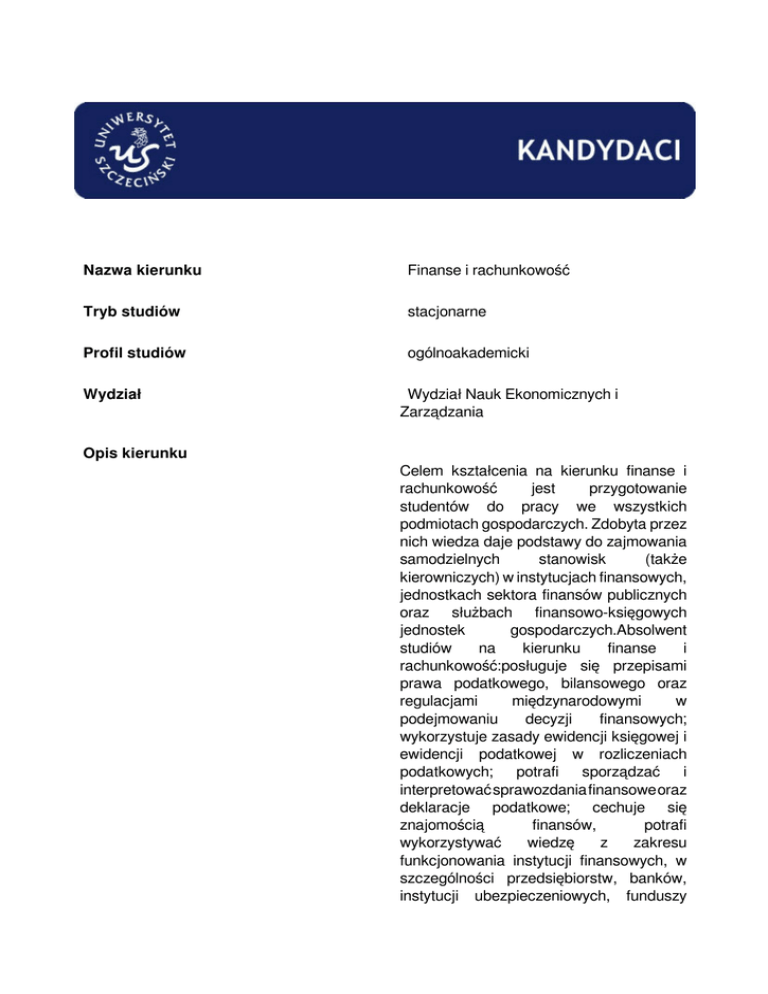 Nazwa kierunku Finanse i rachunkowość Tryb studiów stacjonarne Profil studiów ogólnoakademicki Wydział Wydział Nauk Ekonomicznych i Zarządzania Opis kierunku Celem kształcenia na kierunku finanse i rachunkowość jest przygotowanie studentów do pracy we wszystkich podmiotach gospodarczych. Zdobyta przez nich wiedza daje podstawy do zajmowania samodzielnych stanowisk (także kierowniczych) w instytucjach finansowych, jednostkach sektora finansów publicznych oraz służbach finansowo-księgowych jednostek gospodarczych.Absolwent studiów na kierunku finanse i rachunkowość:posługuje się przepisami prawa podatkowego, bilansowego oraz regulacjami międzynarodowymi w podejmowaniu decyzji finansowych; wykorzystuje zasady ewidencji księgowej i ewidencji podatkowej w rozliczeniach podatkowych; potrafi sporządzać i interpretowaćsprawozdaniafinansoweoraz deklaracje podatkowe; cechuje się znajomością finansów, potrafi wykorzystywać wiedzę z zakresu funkcjonowania instytucji finansowych, w szczególności przedsiębiorstw, banków, instytucji ubezpieczeniowych, funduszy inwestycyjnych, podmiotów sektora finansówpublicznych;podejmujedecyzjena podstawie analizy informacji finansowoksięgowych oraz wszechstronnej oceny ryzyka;rozumie występowanie ryzyka na rynku finansowym i globalnym oraz umie nim zarządzać; przeprowadza analizę fundamentalną rynku kapitałowego i wyciąga z niej wnioski decyzyjne; stosuje narzędzia niezbędne do podejmowania decyzji dotyczących oceny kondycji finansowej jednostek; posługuje się językiem obcym w praktyce finansów, rachunkowości i bankowości. Specjalności Student ma możliwość napisania pracy magisterskiej w ramach następujących specjalności: – Rachunkowość finansowa i auditing – Rachunkowość zarządcza i controlling – Doradztwo finansowo–księgowe – Finanse i rachunkowość przedsiębiorstw – Bankowość i rynki finansowe – Financial Management Specjalności uruchamiane są w trakcie trwania studiów (wybór nastąpi od 2 semestru studiów). Uruchomienie danej specjalności uwarunkowane jest liczbą zadeklarowanych na tę specjalność studentów. Kryteria kwalifikacji Do postępowania kwalifikacyjnego mogą przystąpićosobylegitymującesiędyplomem ukończenia studiów co najmniej pierwszego stopnia. Kryterium kwalifikacji jest liczba otrzymanych punktów, obliczana wg wzoru: W = 0,5 O o 0.5 Ś, gdzie: O - ocena na dyplomie ukończenia studiów co najmniej pierwszego stopnia; Ś - średnia z przebiegu studiów co najmniej pierwszego stopnia, potwierdzona przez uczelnię kandydata i wyliczona według zasad zgodnych z regulaminem studiów ukończonej uczelni. Przykładowe przedmioty prawo finansowe standardy sprawozdawczości finansowej zarządzanie instytucjami kredytowymi Możliwości zatrudnienia Absolwent posiada wiedzę, umiejętności i kompetencje społeczne przygotowujące go m.in. do pełnienia funkcji specjalisty w działach finansowych i księgowych przedsiębiorstw i administracji publicznej oraz w działach rachunkowości instytucji finansowych (banków i zakładów ubezpieczeniowych). Posiada wiedzę, umiejętności i kompetencje społeczne przygotowujące go do pełnienia funkcji samodzielnego specjalisty w działach controllingu i rachunkowości zarządczej przedsiębiorstw. Kwalifikacje absolwenta przygotowują do zawodów: specjalistads.rachunkowościinwestycyjnej, ds. wynagrodzeń, ds. controllingu, ds. zamówień publicznych, ds. planowania strategicznego,doradca: finansowy, inwestycyjny, podatkowy, koordynator projektów unijnych, projektant pakietów usług finansowych, analityk finansowy. Kontynuacja nauki Absolwenci studiów na kierunku finanse i rachunkowość mają możliwość kontynuowania kształcenia na innych kierunkach studiów trzeciego stopnia i podyplomowych, realizowanych na Uniwersytecie Szczecińskim. Terminy Terminy postępowania rekrutacjnego na studia stacjonarne i niestacjonarne rozpoczynające się od roku akademickiego 2016/2017. Dokumenty Powered by TCPDF (www.tcpdf.org)