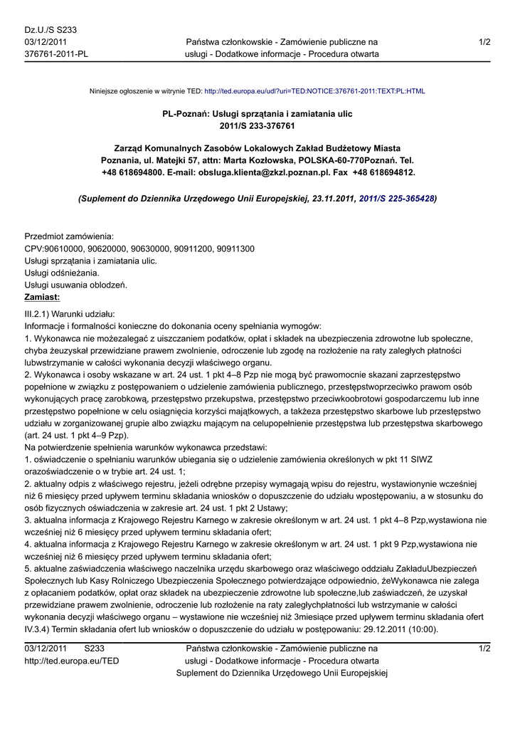 Dz.U./S S233 03/12/2011 376761-2011-PL Państwa członkowskie - Zamówienie publiczne na usługi - Dodatkowe informacje - Procedura otwarta 1/2 Niniejsze ogłoszenie w witrynie TED: http://ted.europa.eu/udl?uri=TED:NOTICE:376761-2011:TEXT:PL:HTML PL-Poznań: Usługi sprzątania i zamiatania ulic 2011/S 233-376761 Zarząd Komunalnych Zasobów Lokalowych Zakład Budżetowy Miasta Poznania, ul. Matejki 57, attn: Marta Kozłowska, POLSKA-60-770Poznań. Tel. +48 618694800. E-mail: [email protected]. Fax +48 618694812. (Suplement do Dziennika Urzędowego Unii Europejskiej, 23.11.2011, 2011/S 225-365428) Przedmiot zamówienia: CPV:90610000, 90620000, 90630000, 90911200, 90911300 Usługi sprzątania i zamiatania ulic. Usługi odśnieżania. Usługi usuwania oblodzeń. Zamiast: III.2.1) Warunki udziału: Informacje i formalności konieczne do dokonania oceny spełniania wymogów: 1. Wykonawca nie możezalegać z uiszczaniem podatków, opłat i składek na ubezpieczenia zdrowotne lub społeczne, chyba żeuzyskał przewidziane prawem zwolnienie, odroczenie lub zgodę na rozłożenie na raty zaległych płatności lubwstrzymanie w całości wykonania decyzji właściwego organu. 2. Wykonawca i osoby wskazane w art. 24 ust. 1 pkt 4–8 Pzp nie mogą być prawomocnie skazani zaprzestępstwo popełnione w związku z postępowaniem o udzielenie zamówienia publicznego, przestępstwoprzeciwko prawom osób wykonujących pracę zarobkową, przestępstwo przekupstwa, przestępstwo przeciwkoobrotowi gospodarczemu lub inne przestępstwo popełnione w celu osiągnięcia korzyści majątkowych, a takżeza przestępstwo skarbowe lub przestępstwo udziału w zorganizowanej grupie albo związku mającym na celupopełnienie przestępstwa lub przestępstwa skarbowego (art. 24 ust. 1 pkt 4–9 Pzp). Na potwierdzenie spełnienia warunków wykonawca przedstawi: 1. oświadczenie o spełnianiu warunków ubiegania się o udzielenie zamówienia określonych w pkt 11 SIWZ orazoświadczenie o w trybie art. 24 ust. 1; 2. aktualny odpis z właściwego rejestru, jeżeli odrębne przepisy wymagają wpisu do rejestru, wystawionynie wcześniej niż 6 miesięcy przed upływem terminu składania wniosków o dopuszczenie do udziału wpostępowaniu, a w stosunku do osób fizycznych oświadczenia w zakresie art. 24 ust. 1 pkt 2 Ustawy; 3. aktualna informacja z Krajowego Rejestru Karnego w zakresie określonym w art. 24 ust. 1 pkt 4–8 Pzp,wystawiona nie wcześniej niż 6 miesięcy przed upływem terminu składania ofert; 4. aktualna informacja z Krajowego Rejestru Karnego w zakresie określonym w art. 24 ust. 1 pkt 9 Pzp,wystawiona nie wcześniej niż 6 miesięcy przed upływem terminu składania ofert; 5. aktualne zaświadczenia właściwego naczelnika urzędu skarbowego oraz właściwego oddziału ZakładuUbezpieczeń Społecznych lub Kasy Rolniczego Ubezpieczenia Społecznego potwierdzające odpowiednio, żeWykonawca nie zalega z opłacaniem podatków, opłat oraz składek na ubezpieczenie zdrowotne lub społeczne,lub zaświadczeń, że uzyskał przewidziane prawem zwolnienie, odroczenie lub rozłożenie na raty zaległychpłatności lub wstrzymanie w całości wykonania decyzji właściwego organu – wystawione nie wcześniej niż 3miesiące przed upływem terminu składania ofert IV.3.4) Termin składania ofert lub wniosków o dopuszczenie do udziału w postępowaniu: 29.12.2011 (10:00). 03/12/2011 S233 http://ted.europa.eu/TED Państwa członkowskie - Zamówienie publiczne na usługi - Dodatkowe informacje - Procedura otwarta Suplement do Dziennika Urzędowego Unii Europejskiej 1/2 Dz.U./S S233 03/12/2011 376761-2011-PL Państwa członkowskie - Zamówienie publiczne na usługi - Dodatkowe informacje - Procedura otwarta 2/2 Powinno być: III.2.1) Warunki udziału: Informacje i formalności konieczne do dokonania oceny spełniania wymogów: 1. Wykonawca nie może zalegać z uiszczaniem podatków, opłat i składek na ubezpieczenia zdrowotne lub społeczne, chyba że uzyskał przewidziane prawem zwolnienie, odroczenie lub zgodę na rozłożenie na raty zaległych płatności lub wstrzymanie w całości wykonania decyzji właściwego organu. 2. Wykonawca i osoby wskazane w art. 24 ust. 1 pkt 4–8 Pzp nie mogą być prawomocnie skazani za przestępstwo popełnione w związku z postępowaniem o udzielenie zamówienia publicznego, przestępstwo przeciwko prawom osób wykonujących pracę zarobkową, przestępstwo przekupstwa, przestępstwo przeciwko obrotowi gospodarczemu lub inne przestępstwo popełnione w celu osiągnięcia korzyści majątkowych, a także za przestępstwo skarbowe lub przestępstwo udziału w zorganizowanej grupie albo związku mającym na celu popełnienie przestępstwa lub przestępstwa skarbowego (art. 24 ust. 1 pkt 4–9 Pzp). 3.„Wykonawca musi posiadać uprawnienia do prowadzenia działalności gospodarczej w zakresie odbioru i transportu odpadów” Na potwierdzenie spełnienia warunków wykonawca przedstawi: 1. oświadczenie o spełnianiu warunków ubiegania się o udzielenie zamówienia określonych w pkt 11 SIWZ oraz oświadczenie o w trybie art. 24 ust. 1; 2. aktualny odpis z właściwego rejestru, jeżeli odrębne przepisy wymagają wpisu do rejestru, wystawiony nie wcześniej niż 6 miesięcy przed upływem terminu składania wniosków o dopuszczenie do udziału w postępowaniu, a w stosunku do osób fizycznych oświadczenia w zakresie art. 24 ust. 1 pkt 2 Ustawy; 3. aktualna informacja z Krajowego Rejestru Karnego w zakresie określonym w art. 24 ust. 1 pkt 4–8 Pzp, wystawiona nie wcześniej niż 6 miesięcy przed upływem terminu składania ofert; 4. aktualna informacja z Krajowego Rejestru Karnego w zakresie określonym w art. 24 ust. 1 pkt 9 Pzp, wystawiona nie wcześniej niż 6 miesięcy przed upływem terminu składania ofert; 5. aktualne zaświadczenia właściwego naczelnika urzędu skarbowego oraz właściwego oddziału Zakładu Ubezpieczeń Społecznych lub Kasy Rolniczego Ubezpieczenia 