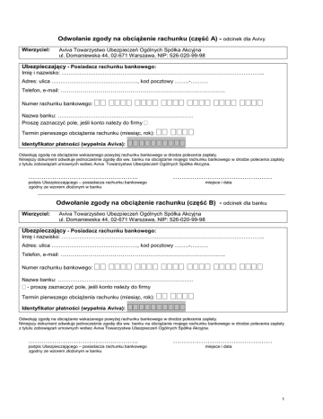 Odwołanie zgody na obciążenie rachunku (część A) - odcinek dla Avivy Wierzyciel: Aviva Towarzystwo Ubezpieczeń Ogólnych Spółka Akcyjna ul. Domaniewska 44, 02-671 Warszawa, NIP: 526-020-99-98 Ubezpieczający - Posiadacz rachunku bankowego: Imię i nazwisko: ……….…………………………………….…………………………………………………... Adres: ulica ……….……………………………….., kod pocztowy ……..-….…… Telefon, e-mail: ……………………………………………………………………….. Numer rachunku bankowego: Nazwa banku: ………………………………………………………………… Proszę zaznaczyć pole, jeśli konto należy do firmy Termin pierwszego obciążenia rachunku (miesiąc, rok): Identyfikator płatności (wypełnia Aviva): Odwołuję zgodę na obciążanie wskazanego powyżej rachunku bankowego w drodze polecenia zapłaty. Niniejszy dokument odwołuje jednocześnie zgodę dla ww. banku na obciążanie mojego rachunku bankowego w drodze polecenia zapłaty z tytułu zobowiązań umownych wobec Aviva Towarzystwa Ubezpieczeń Ogólnych Spółka Akcyjna. ………………………………….……….. ………………………………….…… podpis Ubezpieczającego – posiadacza rachunku bankowego zgodny ze wzorem złożonym w banku miejsce i data Odwołanie zgody na obciążenie rachunku (część B) - odcinek dla banku Wierzyciel: Aviva Towarzystwo Ubezpieczeń Ogólnych Spółka Akcyjna ul. Domaniewska 44, 02-671 Warszawa, NIP: 526-020-99-98 Ubezpieczający - Posiadacz rachunku bankowego: Imię i nazwisko: ……….…………………………………….…………………………………………………... Adres: ulica ……….……………………………….., kod pocztowy ……..-….…… Telefon, e-mail: ……………………………………………………………………….. Numer rachunku bankowego: Nazwa banku: ………………………………………………………………… - proszę zaznaczyć pole, jeśli konto należy do firmy Termin pierwszego obciążenia rachunku (miesiąc, rok): Identyfikator płatności (wypełnia Aviva): Odwołuję zgodę na obciążanie wskazanego powyżej rachunku bankowego w drodze polecenia zapłaty. Niniejszy dokument odwołuje jednocześnie zgodę dla ww. banku na obciążanie mojego rachunku bankowego w drodze polecenia zapłaty z tytułu zobowiązań umownych wobec Aviva Towarzystwa Ubezpieczeń Ogólnych Spółka Akcyjna. ………………………………….……….. podpis Ubezpieczającego – posiadacza rachunku bankowego zgodny ze wzorem złożonym w banku ………………………………….…… miejsce i data 1