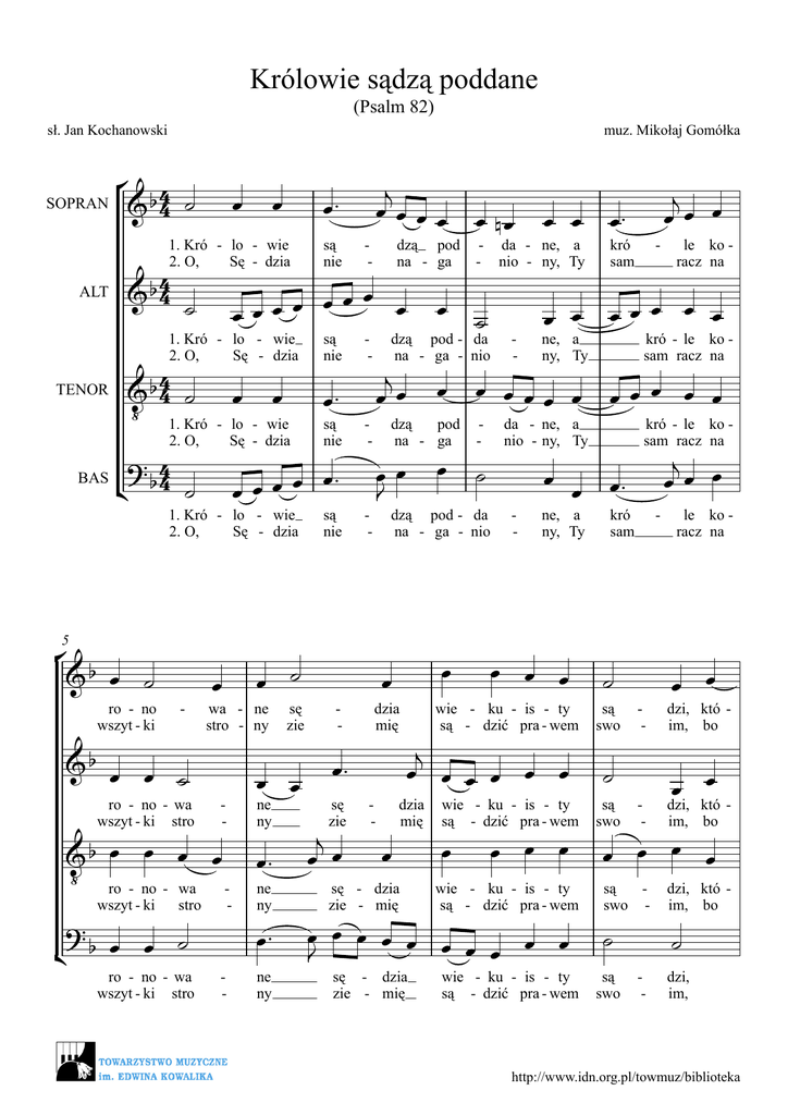 Królowie sądzą poddane (Psalm 82) sł. Jan Kochanowski SOPRAN muz. Mikołaj Gomółka ° 4 & b4 ˙ œ œ™ œ 1. Kró - lo - wie 2. O, Sę - dzia ALT 4 & b4 4 & b4 ˙ œ ‹ 1. Kró - lo œ - wie Sę - dzia 2. O, BAS ? 4 ¢ b4 ˙ 5 ro - no wszyt - ki - &b œ œ ˙ ro - no - wa wszyt - ki stro œ ˙ œ wa - ne stro - ny - ? stro ¢ b œ œ ˙ ro - no - wa wszyt - ki stro - - sę zie œ œ &b œ œ œ œ ‹ ro - no - wa wszyt - ki są nie - są nie - œ™ œ™ œœœœ 1. Kró - lo - wie 2. O, Sę - dzia ° &b œ ˙ - dzą pod na - ga œœœ œ œ œ œ œ ˙ 1. Kró - lo - wie 2. O, Sę - dzia TENOR są nie j œœœœ ne ny są nie - - œ œ da - ne, a nio - ny, Ty ˙ œ œ œœœ œ œ œ œœœ œ œœœ œ œ dzą pod - da na - ga - nio j œœ œ œœ J œ œ œ dzą pod na - ga - - ˙ dzą pod - da na - ga - nio dzia mię œ™ sę zie œ œ nœ œ™ - - ne, a ny, Ty da - ne, a nio - ny, Ty œ - ne, a ny, Ty œ œ œ wie - ku - is - ty są - dzić pra - wem j œ œ œ œ œ œ dzia mię wie - ku - is - ty są - dzić pra - wem œ™ j œ œ œ™ œ œ œ œ œ œ œ œ œ œ J ne ny ne ny œ œ sę - dzia zie - mię sę - dzia zie - mię œ œ œ œ wie - ku - is - ty są - dzić pra - wem wie - ku - is - ty są - dzić pra - wem kró sam - j œœ œ le ko racz na kró - le ko sam racz na kró - le ko sam racz na j œœ œ œ™ kró sam ˙ są swo ˙ są swo - - le ko racz na œ œ dzi, któ im, bo œ œ - dzi, któ im, bo są swo - dzi, któ im, bo œ œ œ œ ˙ są swo - ˙ dzi, im, http://www.idn.org.pl/towmuz/biblioteka ° &b œ œ œ œ 2 9 &b œ™ ry wszy - tkim świa świat jest dzie - dzic œ ˙ ry wszy świat jest &b ˙ ‹ ry świat ? Œ ¢ b - œ - - - tem - twem tem - twem œ œ œ œ œ œ wszy - tkim świa jest dzie - dzic œ œ œ - œ œ œ œ œ œ tkim świa dzie - dzic œ œ j œ œ œ - ˙ któ - ry wszy - tkim bo świat jest dzie - tem twem œ œ - j œ œ œ œ œ rzą Two ˙ rzą Two - - œ™ - U j œ w dzi. im. j œ w - - œ œ œ œ œ œ rzą Two - - - - - dzi. im. U w - dzi. im. - dzi. im. w świa - tem rzą dzic - twem Two U U w http://www.idn.org.pl/towmuz/biblioteka