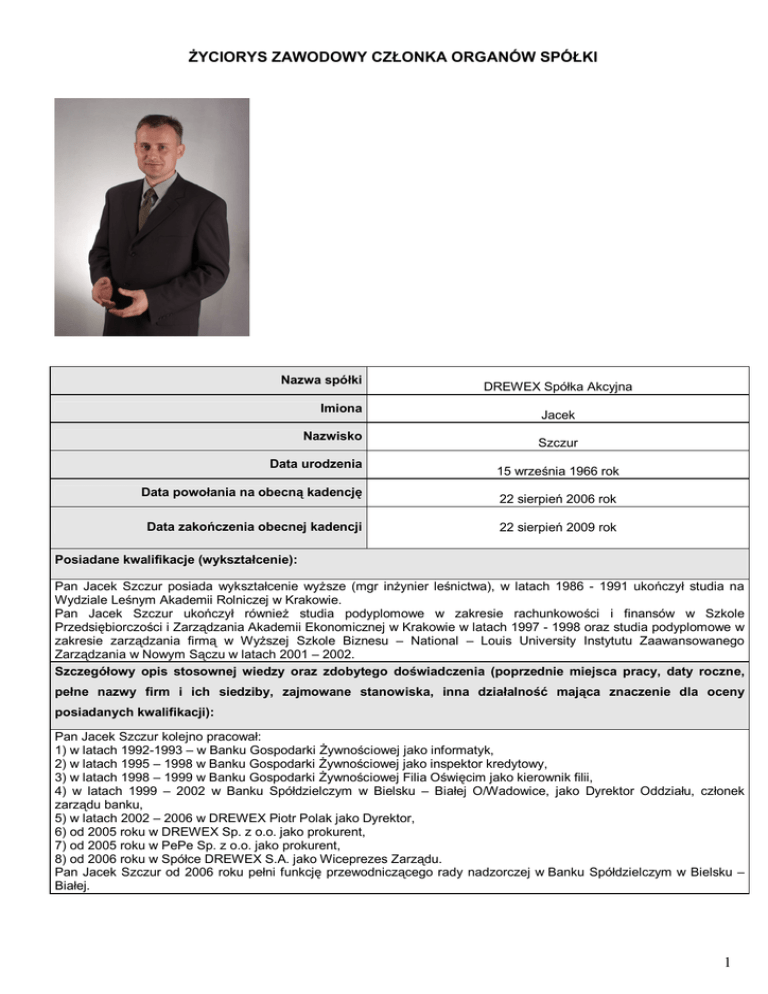 ŻYCIORYS ZAWODOWY CZŁONKA ORGANÓW SPÓŁKI Nazwa spółki Imiona Nazwisko Data urodzenia Data powołania na obecną kadencję Data zakończenia obecnej kadencji DREWEX Spółka Akcyjna Jacek Szczur 15 września 1966 rok 22 sierpień 2006 rok 22 sierpień 2009 rok Posiadane kwalifikacje (wykształcenie): Pan Jacek Szczur posiada wykształcenie wyższe (mgr inżynier leśnictwa), w latach 1986 - 1991 ukończył studia na Wydziale Leśnym Akademii Rolniczej w Krakowie. Pan Jacek Szczur ukończył również studia podyplomowe w zakresie rachunkowości i finansów w Szkole Przedsiębiorczości i Zarządzania Akademii Ekonomicznej w Krakowie w latach 1997 - 1998 oraz studia podyplomowe w zakresie zarządzania firmą w Wyższej Szkole Biznesu – National – Louis University Instytutu Zaawansowanego Zarządzania w Nowym Sączu w latach 2001 – 2002. Szczegółowy opis stosownej wiedzy oraz zdobytego doświadczenia (poprzednie miejsca pracy, daty roczne, pełne nazwy firm i ich siedziby, zajmowane stanowiska, inna działalność mająca znaczenie dla oceny posiadanych kwalifikacji): Pan Jacek Szczur kolejno pracował: 1) w latach 1992-1993 – w Banku Gospodarki Żywnościowej jako informatyk, 2) w latach 1995 – 1998 w Banku Gospodarki Żywnościowej jako inspektor kredytowy, 3) w latach 1998 – 1999 w Banku Gospodarki Żywnościowej Filia Oświęcim jako kierownik filii, 4) w latach 1999 – 2002 w Banku Spółdzielczym w Bielsku – Białej O/Wadowice, jako Dyrektor Oddziału, członek zarządu banku, 5) w latach 2002 – 2006 w DREWEX Piotr Polak jako Dyrektor, 6) od 2005 roku w DREWEX Sp. z o.o. jako prokurent, 7) od 2005 roku w PePe Sp. z o.o. jako prokurent, 8) od 2006 roku w Spółce DREWEX S.A. jako Wiceprezes Zarządu. Pan Jacek Szczur od 2006 roku pełni funkcję przewodniczącego rady nadzorczej w Banku Spółdzielczym w Bielsku – Białej. 1