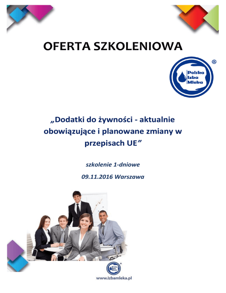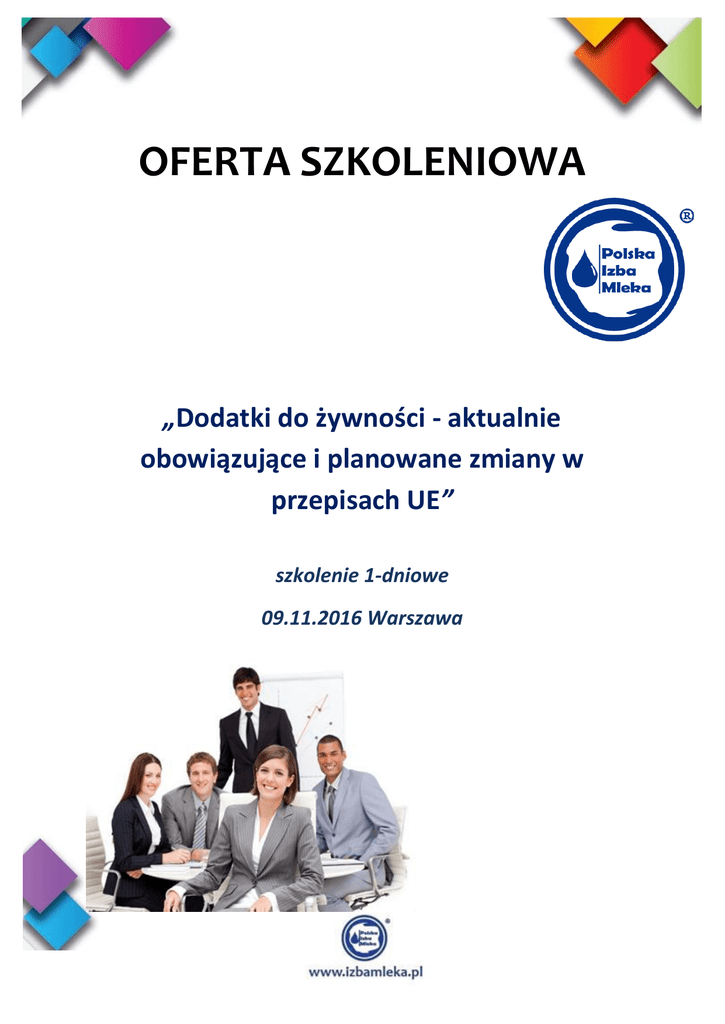 OFERTA SZKOLENIOWA „Dodatki do żywności - aktualnie obowiązujące i planowane zmiany w przepisach UE” szkolenie 1-dniowe 09.11.2016 Warszawa DZIAŁ SZKOLEŃ PIM tel/fax (85) 874 43 88 [email protected] ul. Mickiewicza 7/23 15 - 213 Białystok Temat: Dodatki do żywności - aktualnie obowiązujące i planowane zmiany w przepisach UE Przedmiot i cel szkolenia: substancje dodatkowe a substancje pomocnicze w przetwórstwie - zasady klasyfikacji barwniki stosowane w żywności- wymagania prawne wdrożenie zasady quantum satis w praktyce specyfikacje dotyczące dodatków do żywności i preparatów stosowanych w przemyśle mleczarskim Sylwetka trenera Joanna Gajda - Wyrębek – ekspert ds. substancji dodatkowych w żywności, kierownik Pracowni Oceny Dodatków do Żywności w Zakładzie Bezpieczeństwa Żywności Narodowego Instytutu Zdrowia Publicznego – Państwowego Zakładu Higieny Miejsce szkolenia Centrum Szkoleniowe ADGAR OCHOTA ul. Al.Jerozolimskie 181B, 02-222 Warszawa Parking płatny 2pln/h SZCZEGÓŁY OFERTY Dodatki do żywności - aktualnie obowiązujące i planowane zmiany w przepisach UE Temat Centrum Szkoleniowe ADGAR OCHOTA Miejsce szkolenia Imię i nazwisko uczestnika …………………………………………………… proszę uzupełnić Termin 09.11.2016 Szkolenie jednodniowe Cena projektu szkoleniowego Cena szkolenia obejmuje: Warunki realizacji oferty 350 pln + 23% VAT (członkowie PIM) 480 pln + 23% VAT (niezrzeszeni w PIM) Obsługa trenerska Organizacja i koordynacja szkolenia Materiały szkoleniowe Zaświadczenia o ukończeniu szkolenia Przerwy kawowe (kawa, herbata, woda) Lunch Płatność za usługę będzie realizowana w formie zaliczki na podstawie faktury wystawionej na 7 dni przed realizacją szkolenia (Zarządzenie nr 01/2013 Dyrektor Biura PIM) Niniejsza oferta upoważnia Polska Izbę Mleka do wystawienia faktury VAT bez podpisu odbiorcy. W przypadku akceptacji niniejszej oferty, prosimy o jej zatwierdzenie podpisem osoby upoważnionej oraz odesłanie scanu drogą mailową na adres [email protected] Rezygnacja ze szkolenia wymaga pisemnej formy w terminie nie później niż 7 dni przed terminem szkolenia, w innym razie obciążymy Państwa pełną kwotą szkolenia Oświadczam, że wyrażam zgodę na w/w warunki zamówienia ................................................................................................................... Data i miejsce Podpis i pieczęć osoby upoważnionej do reprezentacji* *Zamówienie bez podpisu jest nieważne W przypadku jakichkolwiek pytań proszę o kontakt: Daniel Dojlidko Polska Izba Mleka ul. Mickiewicza 7/23 15 - 213 Białystok Tel.: (85) 674 73 29 Fax.: (85) 874 43 88 e-mail: [email protected]