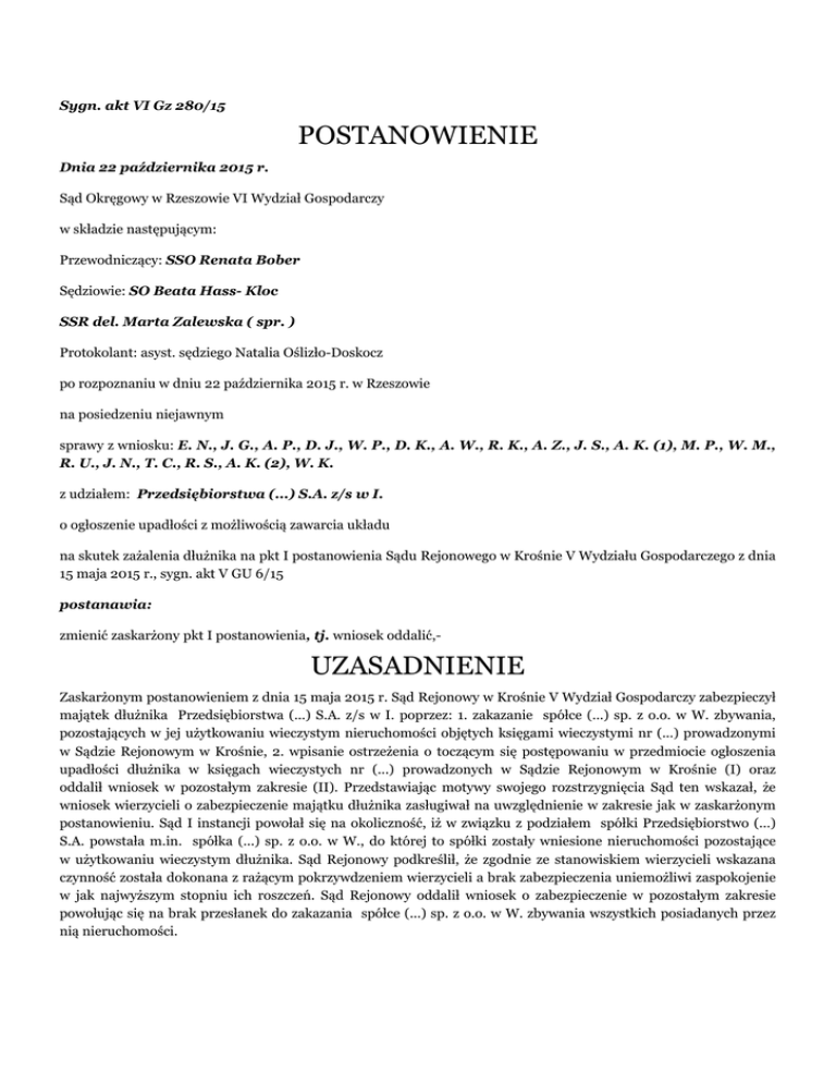 Sygn. akt VI Gz 280/15 POSTANOWIENIE Dnia 22 października 2015 r. Sąd Okręgowy w Rzeszowie VI Wydział Gospodarczy w składzie następującym: Przewodniczący: SSO Renata Bober Sędziowie: SO Beata Hass- Kloc SSR del. Marta Zalewska ( spr. ) Protokolant: asyst. sędziego Natalia Oślizło-Doskocz po rozpoznaniu w dniu 22 października 2015 r. w Rzeszowie na posiedzeniu niejawnym sprawy z wniosku: E. N., J. G., A. P., D. J., W. P., D. K., A. W., R. K., A. Z., J. S., A. K. (1), M. P., W. M., R. U., J. N., T. C., R. S., A. K. (2), W. K. z udziałem: Przedsiębiorstwa (...) S.A. z/s w I. o ogłoszenie upadłości z możliwością zawarcia układu na skutek zażalenia dłużnika na pkt I postanowienia Sądu Rejonowego w Krośnie V Wydziału Gospodarczego z dnia 15 maja 2015 r., sygn. akt V GU 6/15 postanawia: zmienić zaskarżony pkt I postanowienia, tj. wniosek oddalić,- UZASADNIENIE Zaskarżonym postanowieniem z dnia 15 maja 2015 r. Sąd Rejonowy w Krośnie V Wydział Gospodarczy zabezpieczył majątek dłużnika Przedsiębiorstwa (...) S.A. z/s w I. poprzez: 1. zakazanie spółce (...) sp. z o.o. w W. zbywania, pozostających w jej użytkowaniu wieczystym nieruchomości objętych księgami wieczystymi nr (...) prowadzonymi w Sądzie Rejonowym w Krośnie, 2. wpisanie ostrzeżenia o toczącym się postępowaniu w przedmiocie ogłoszenia upadłości dłużnika w księgach wieczystych nr (...) prowadzonych w Sądzie Rejonowym w Krośnie (I) oraz oddalił wniosek w pozostałym zakresie (II). Przedstawiając motywy swojego rozstrzygnięcia Sąd ten wskazał, że wniosek wierzycieli o zabezpieczenie majątku dłużnika zasługiwał na uwzględnienie w zakresie jak w zaskarżonym postanowieniu. Sąd I instancji powołał się na okoliczność, iż w związku z podziałem spółki Przedsiębiorstwo (...) S.A. powstała m.in. spółka (...) sp. z o.o. w W., do której to spółki zostały wniesione nieruchomości pozostające w użytkowaniu wieczystym dłużnika. Sąd Rejonowy podkreślił, że zgodnie ze stanowiskiem wierzycieli wskazana czynność została dokonana z rażącym pokrzywdzeniem wierzycieli a brak zabezpieczenia uniemożliwi zaspokojenie w jak najwyższym stopniu ich roszczeń. Sąd Rejonowy oddalił wniosek o zabezpieczenie w pozostałym zakresie powołując się na brak przesłanek do zakazania spółce (...) sp. z o.o. w W. zbywania wszystkich posiadanych przez nią nieruchomości. Zażalenie na powyższe postanowienie wniósł dłużnik, zaskarżając je w punkcie I ppkt 1 i 2, co do sposobu dokonanego zabezpieczenia i zarzucając mu: 1. obrazę przepisów art. 755 § 1 pkt 2 i 5 k.p.c., art. 7301 §1-3 k.p.c. oraz art. 37,40 127 ust. 1 ustawy prawo upadłościowe i naprawcze poprzez dokonanie zabezpieczenia majątku dłużnika pomimo tego, że dokonanie zastosowanego zabezpieczenia było niedopuszczalne, a już na pewno nie celowe i bezzasadne, wobec tego, że: • nieruchomości objęte księgami wieczystymi nr (...) nie stanowią majątku dłużnika, lecz pozostają w użytkowaniu wieczystym (...) sp. z o.o. , na podstawie czynności prawnej mającej miejsce ponad rok przed złożeniem przez wierzycieli wniosku o ogłoszenie upadłości, w związku z czym, już na obecnym etapie postępowania należało przyjąć, że ww. czynność prawna nie może być i nie będzie z mocy prawa bezskuteczna wobec masy upadłości, a tym samym wierzyciele nie mają interesu prawnego w żądaniu ustanowienia dokonanego sposobu zabezpieczenia, • czynność prawna na mocy której z majątku dłużnika wyszło prawo użytkowania wieczystego nieruchomości objętych księgami wieczystymi nr (...), nie jest bezskuteczna wobec masy upadłości, a tym samym wierzyciele nie maja interesu prawnego w żądaniu ustanowienia dokonanego sposobu zabezpieczenia i dokonanie takiego zabezpieczenia jest niecelowe oraz stanowi bezzasadną i nadmierną uciążliwość, • ewentualna bezskuteczność w stosunku do masy upadłości czynności prawnych dokonanych przez upadłego następuje z mocy prawa dopiero z chwilą ogłoszenia upadłości, co oznacza brak podstaw na obecnym etapie postępowania do zastosowania sposobu zabezpieczenia przyjętego w zaskarżonym postanowieniu, gdyż nieruchomości objęte księgami wieczystymi nr (...) nie stanowią majątku dłużnika, a czynność prawna na podstawie której prawa te wyszły z majątku dłużnika nie jest objęta bezskutecznością, • dokonany sposób zabezpieczenia nie jest celowy i nie zmierza do zabezpieczenia wierzytelności wierzycieli wobec ich propozycji układowej, • wierzyciele we wniosku o dokonanie wskazanego sposobu zabezpieczenia, nie uprawdopodobnili okoliczności uzasadniających postulowany sposób zabezpieczania, jak również nie wskazali prawidłowo sposobu zabezpieczenia, 2. obrazę przepisów art. 736 § 1 k.p.c. w zw. z art. 738 k.p.c. w zw. z art. 37 ustawy prawo upadłościowe i naprawcze, co miało istotny wpływ na treść wydanego orzeczenia, poprzez rozpoznanie wniosku wierzycieli o zabezpieczeni i dokonanie zabezpieczenia w sposób określony w zaskarżonym postanowieniu, pomimo tego, że wniosek wierzycieli o udzielenie zabezpieczenia nie spełniał przesłanek określonych w art. 736 § 1 k.p.c. i zawierał braki formalne, co winno skutkować jego zwrotem bez wzywania wierzycieli do uzupełnienia braków formalnych. Powołując się na powyższe skarżący wniósł o uchylenie postanowienia w zaskarżonym zakresie co do sposobu udzielonego zabezpieczania. Sąd Okręgowy zważył, co następuje: Zażalenie dłużnika zasługuje na uwzględnienie. W ocenie Sądu Okręgowego wniosek o udzielenie zabezpieczenia poprzez zakazanie spółce (...) sp. z o.o. w W. zbywania, pozostających w jej użytkowaniu wieczystym nieruchomości objętych księgami wieczystymi nr (...) prowadzonymi w Sądzie Rejonowym w Krośnie a także wpisanie ostrzeżenia o toczącym się postępowaniu w przedmiocie ogłoszenia upadłości dłużnika w ww