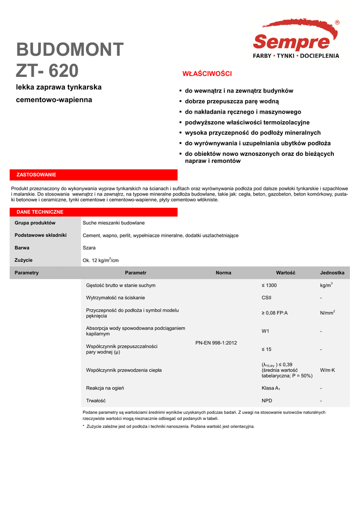 BUDOMONT ZT- 620 WŁAŚCIWOŚCI lekka zaprawa tynkarska do wewnątrz i na zewnątrz ątrz budynków cementowo-wapienna dobrze przepuszcza parę ę wodną wodn do nakładania ręcznego cznego i maszynowego podwyższone właściwości ści termoizolacyjne wysoka przyczepność do podłoży podło mineralnych do wyrównywania i uzupełniania ubytków podłoża podło do obiektów nowo wznoszonych oraz do bieżących napraw i remontów ZASTOSOWANIE Produkt przeznaczony do wykonywania wypraw tynkarskich na ścianach i sufitach oraz wyrównywania podłoża pod dalsze powłoki tynkarskie i szpachlowe i malarskie. Do stosowania wewnątrz i na zewnątrz, ątrz, na typowe mineralne podłoża podło a budowlane, takie jak: cegła, beton, gazobeton, beton komórkowy, pustapust ki betonowe i ceramiczne, tynki cementowe i cementowo-wapienne, cementowo płyty cementowo włókniste. DANE TECHNICZNE Grupa produktów Suche mieszanki budowlane Podstawowe składniki Cement, wapno, perlit, wypełniacze mineralne, dodatki uszlachetniające Barwa Szara Zużycie Ok. 12 kg/m2/cm Parametry Parametr arametr Norma Wartość Jednostka Gęstość brutto w stanie suchym ≤ 1300 kg/m3 Wytrzymałość ść na ściskanie CSI CSII - Przyczepność ść do podłoża podłoż i symbol modelu pęknięcia ≥ 0,08 FP:A N/mm2 Absorpcja bsorpcja wody spowodowana podciąganiem podci kapilarnym W W1 - ≤ 15 - Współczynnik spółczynnik przewodzenia ciepła (λ10,dry ) ≤ 0,39 (ś (średnia wartość tabelaryczna; P = 50%) W/m·K Reakcja na ogień K Klasa A1 - Trwałość NPD - Współczynnik spółczynnik przepuszczalności przepuszczalno pary wodnej (µ) PN-EN 998-1:2012 Podane parametry są ą wartoś wartościami średnimi wyników uzyskanych podczas badań.. Z uwagi na stosowanie surowców naturalnych rzeczywiste wartości ści mogą nieznacznie odbiegać od podanych w tabeli. * Zużycie zależne ne jest od podłoża podło i techniki nanoszenia. Podana wartość jest orientacyjna. KARTA TECHNICZNA – BUDOMONT ZT-620 data aktualizacji: 7.11.2014 SPOSÓB UŻYCIA Podłoże Podłoże e powinno być czyste, nośne, zwarte, równe i odtłuszczone. Luźne ne ziarna i zanieczyszczenia oraz słabo związane zwi powłoki starych farb emulsyjnych emuls należy dokładnie usunąć. Wszelkie nierównoś wności i ubytki uzupełnić odpowiednimi zaprawami wyrównują wnującymi. Powierzchnie zarażone one grzybami i algami koniecznie zdezynfekowa zdezynfekować preparatem grzyboi algobójczym ójczym ALGHESIL. ALGHESIL Nasiąkliwe oraz słabo związane podłoża a zagruntować zagruntowa gruntem ETERNA GRUNT F lub rozpuszczalnikowym gruntem głęboko gł penetrującym SEMPRE GRUNT R. Przygotowanie produktu Do ok. 5 l wody stopniowo wsypać wsypa zawartość opakowania BUDOMONT ZT-62 620, mieszając za pomocą mieszadła mechanicznego, ażż do uzyskania jednorodnej masy bez grudek. Czas przydatności przydatno do użycia rozrobionej z wodą zaprawy wynosi ok. 2 h. Stwardniałej zaprawy nie uzdatniać wodą ani nie mieszać ze świeżą zaprawą – powoduje to utratę właściwości ści użytkowych. Nakładanie Nakładać przy użyciu życiu kielni i pacy lub agregatu tynkarskiego ( 1–2 cm w jednym przejściu). przej Po nałożeniu wyrównać listwą i zatrzeć. ć. Zbyt wczesne zacieranie powoduje koncentrację koncentracj środka wiążącego ążącego na powierzchni i powstawanie rys skurczowych. Przy większych wię grubościach tynk nakładać etapowo. Każdą ż ą poprzedzaj poprzedzającą warstwę należy zarysować poziomo omo i pozostawić do wyschnięcia. Temperatura nakładania – od 5 do 25°C C (powietrze i podłoże). podło Unikać pracy na powierzchniach nasłonecznionych, podczas deszczu i przy silnym wietrze. Wysychanie W trakcie prac tynkarskich oraz podczas wysychania tynku stosować stosowa siatki ochronne. Czas wysychania: 1 mm grubości na dzień (temp. 20°C, C, wilgotność wilgotno 65%). Niska temperatura i wysoka wilgotność powietrza wydłużają okres wiązania nawet o kilka dni. Czyszczenie narzędzi Wodą natychmiast po użyciu. uż OPAKOWANIE 25 kg PRZECHOWYWANIE Produkt przechowywać w fabrycznie zamkniętym ętym tym opakowaniu, w suchym i chłodnym pomieszczeniu. Okres przydatno przydatności do użycia wynosi 12 miesięcy od daty produkcji (patrz: bok opakowania). BHP/PPOŻ Wyrób niepalny, w obowiązującym prawie klasyfikowany jako drażniący. Działa drażniąco co na oczy, drogi oddechowe i sk skórę. Może powodować uczulenie w kontakcie ze skórą. Chronić przed dziećmi, mi, nie wdychać wdycha pyłu, unikać zanieczyszczenia skóry ry i oczu. Zanieczyszczone oczy przemyć przemy natychmiast dużą ilością wody i zasięgnąć porady lekarza. Nosićć odzież ochronną i rękawice ochronne. W razie połknięcia ęcia niezwłocznie zasięgnąć zasi porady lekarza – pokazać opakowanie lub etykietę. Producent gwarantuje jakość wyrobu, lecz nie ma wpływu na sposób jego zastosowania. Podstawą Podstaw zamieszczonych tu informacji jest wiedza producenta, wynikająca ca z długoletnich obserwacji praktycznych zastosowa zastosowań. Nie mogą one jednak zastąpić fachowego przygotowania wykonawcy i nie zwalniają go ze stosowania się do zasad sztuki budowlanej i przepisów BHP, BH stąd nie stanowią podstawy do rozstrzygania sporów na drodze s sądowej. W przypadku pytań lub wątpliwości prosimy o kontakt z producentem.