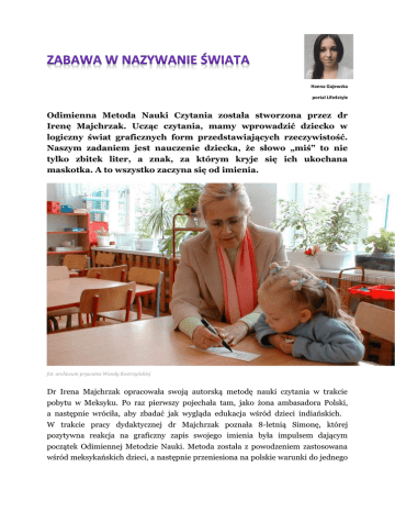 Hanna Gajewska portal Life4style Odimienna Metoda Nauki Czytania została stworzona przez dr Irenę Majchrzak. Ucząc czytania, mamy wprowadzić dziecko w logiczny świat graficznych form przedstawiających rzeczywistość. Naszym zadaniem jest nauczenie dziecka, że słowo „miś” to nie tylko zbitek liter, a znak, za którym kryje się ich ukochana maskotka. A to wszystko zaczyna się od imienia. fot. archiwum prywatne Wandy Kostrzyńskiej Dr Irena Majchrzak opracowała swoją autorską metodę nauki czytania w trakcie pobytu w Meksyku. Po raz pierwszy pojechała tam, jako żona ambasadora Polski, a następnie wróciła, aby zbadać jak wygląda edukacja wśród dzieci indiańskich. W trakcie pracy dydaktycznej dr Majchrzak poznała 8-letnią Simonę, której pozytywna reakcja na graficzny zapis swojego imienia była impulsem dającym początek Odimiennej Metodzie Nauki. Metoda została z powodzeniem zastosowana wśród meksykańskich dzieci, a następnie przeniesiona na polskie warunki do jednego z warszawskich przedszkoli. Obecnie, nauczaniem metody zajmuje się ówczesna dyrektor tego przedszkola i wieloletnia współpracownik dr Ireny Majchrzak – Wanda Kostrzyńska. Odimienna Metoda Nauki jest metodą uniwersalną, a co za tym idzie, może być stosowana w każdym języku posługującym się alfabetem łacińskim. Stosowana jest u dzieci przedszkolnych od wieku 2,5-3 lat. Nauka zaczyna się od pokazania dziecku graficznego zapisu jego własnego imienia, a następnie imion znanych mu osób – innych dzieci, nauczycieli i członków rodziny. Ideą metody jest nauka czytania bezpośrednio ze zrozumieniem. Chodzi o pokazanie dziecku, że jego imię może być nie tylko wypowiedziane lub usłyszane, ale że można je również zapisać. W ten sposób, dziecko nie jest mechanicznie uczone ciągów liter i sylab w oderwaniu od ich materialnego znaczenia. Dziecko widzi, że za zbiorem liter tworzących jego imię, stoi ono samo i bardziej emocjonalnie podchodzi do procesu nauczania. Od tego momentu nauka przypomina zabawę w chowanego, w której dziecko musi znaleźć znaczenie danych znaków graficznych. Po nauce imienia przychodzi czas na naukę nazw otaczającego dziecka świata. Instytut Biologii Doświadczalnej PAN opublikował badanie, z którego wynika, że już w wieku 4-5 miesięcy człowiek o wiele lepiej reaguje na dźwięk swojego imienia niż jakiekolwiek inne słowo. Zwolennicy Metody Odimiennej wskazują na jej bardzo dobre wyniki. Dzieci uczące się czytać w bardzo młodym wieku lepiej się rozwijają, a zdaniem rodziców, których dzieci uczone były w ten sposób, nie mają również problemów z dysleksją. W procesie nauczania omijana jest praktyka czytania na głos, która u wielu dzieci jest przyczyną silnego stresu. W późniejszej edukacji Metoda Odimienna skutkuje większą pewnością siebie w sytuacjach, gdy uczeń poproszony zostanie o przeczytanie czegoś publicznie. Dzieci uczone w ten sposób po zakończeniu przedszkola są w stanie czytać ze zrozumieniem całe zdania i krótkie narracje oraz wypełniać proste, pisemne polecenia. W swojej pracy dydaktycznej pani Wanda Kostrzyńska była w stanie wprowadzić akcję „Dzieci czytają dzieciom”, w ramach której dzieci ze starszych grup czytały młodszym w trakcie ich leżakowania. Największymi zaletami metody opracowanej przez dr Irenę Majchrzak są systematyczność i brak pośpiechu w nauce, dzięki wczesnemu jej wprowadzeniu w życie dziecka. Kolejnym elementem jest bezstresowość oraz indywidualne podejście do dziecka, które uczy się imion i nazw przedmiotów obdarzonych przez nie emocjonalnym przywiązaniem. Odimienna Metoda Nauki Czytania może zostać wprowadzona zarówno przez nauczycielki przedszkola, jak i samych rodziców.