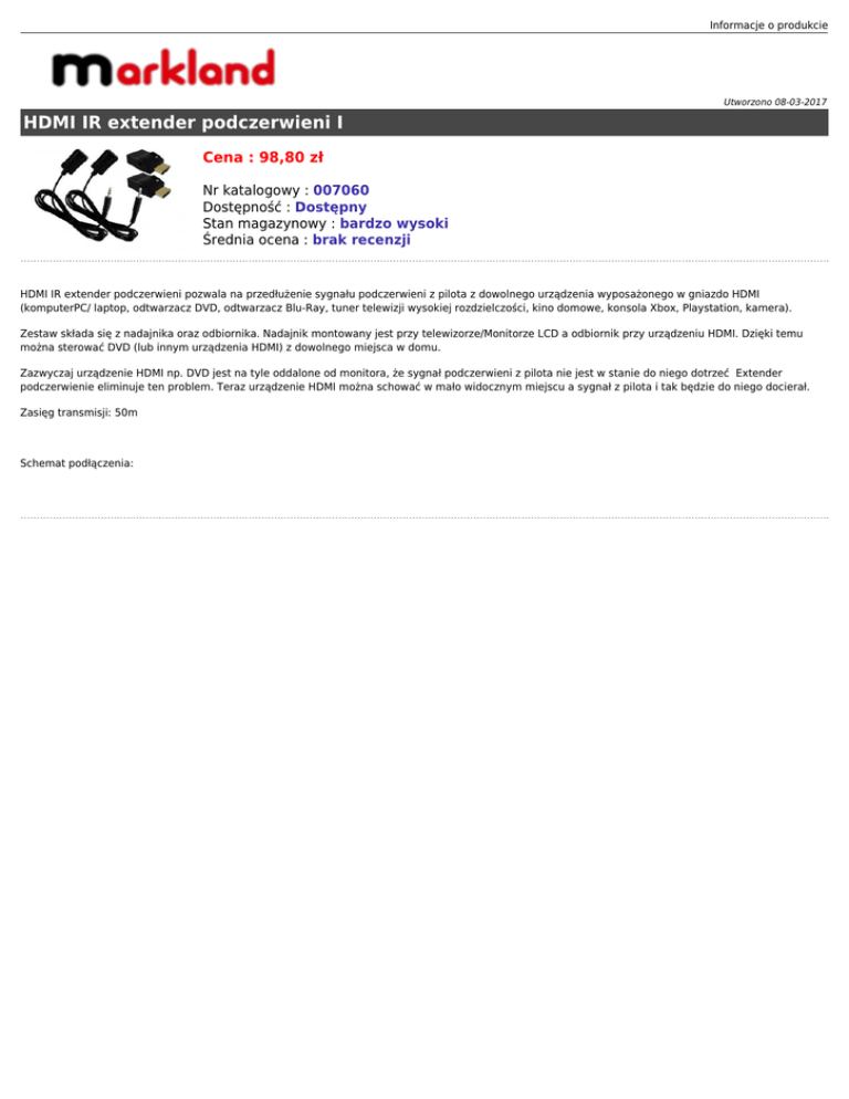 Informacje o produkcie Utworzono 08-03-2017 HDMI IR extender podczerwieni I Cena : 98,80 zł Nr katalogowy : 007060 Dostępność : Dostępny Stan magazynowy : bardzo wysoki Średnia ocena : brak recenzji HDMI IR extender podczerwieni pozwala na przedłużenie sygnału podczerwieni z pilota z dowolnego urządzenia wyposażonego w gniazdo HDMI (komputerPC/ laptop, odtwarzacz DVD, odtwarzacz Blu-Ray, tuner telewizji wysokiej rozdzielczości, kino domowe, konsola Xbox, Playstation, kamera). Zestaw składa się z nadajnika oraz odbiornika. Nadajnik montowany jest przy telewizorze/Monitorze LCD a odbiornik przy urządzeniu HDMI. Dzięki temu można sterować DVD (lub innym urządzenia HDMI) z dowolnego miejsca w domu. Zazwyczaj urządzenie HDMI np. DVD jest na tyle oddalone od monitora, że sygnał podczerwieni z pilota nie jest w stanie do niego dotrzeć Extender podczerwienie eliminuje ten problem. Teraz urządzenie HDMI można schować w mało widocznym miejscu a sygnał z pilota i tak będzie do niego docierał. Zasięg transmisji: 50m Schemat podłączenia: